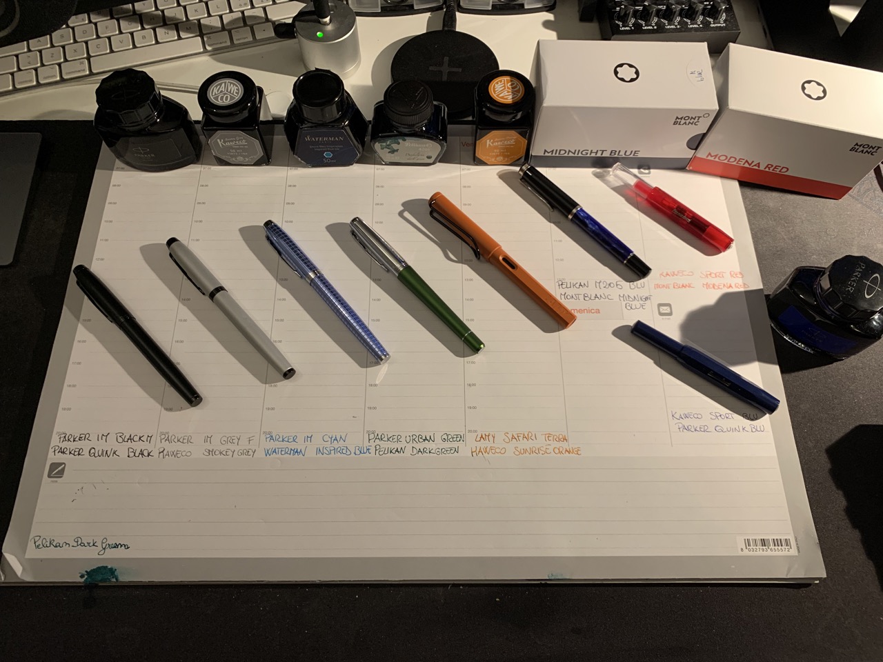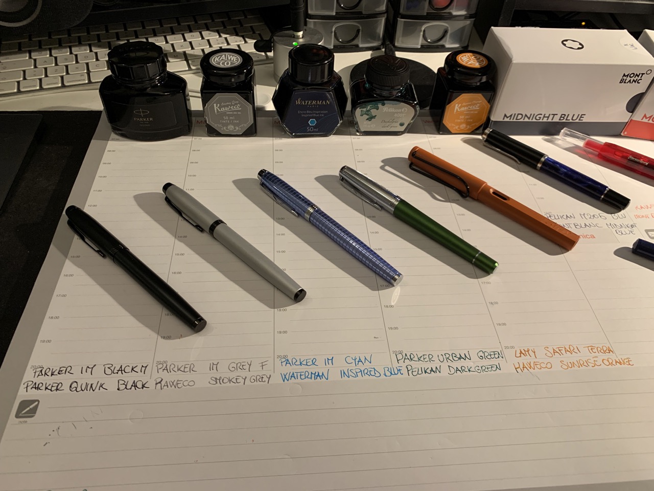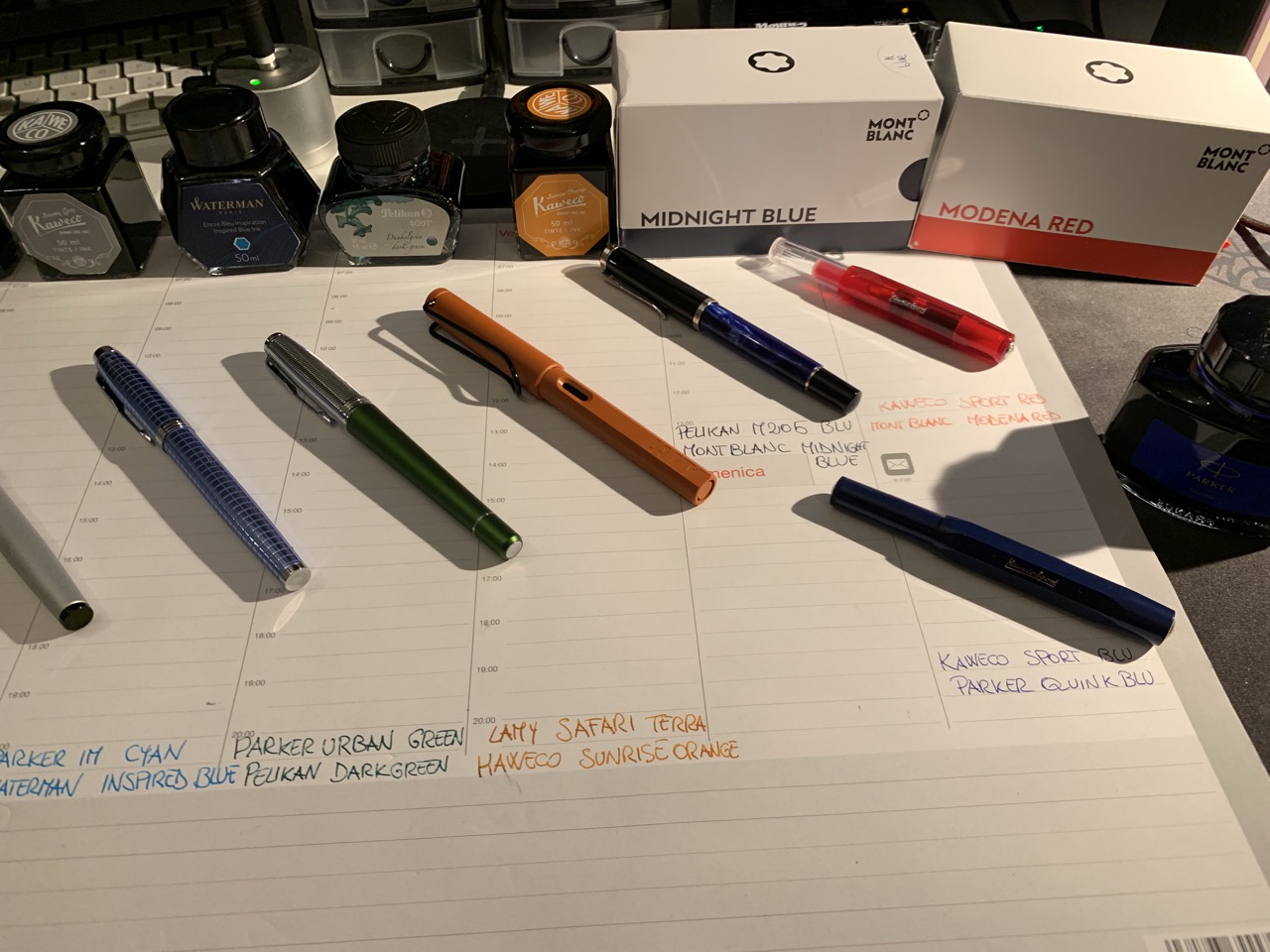 IMG_0509 Large.jpeg Parker IM nera -> Parker Quink Nero Parker IM grigia -> Kaweco Smokey Grey Parker IM ciano -> Waterman Inspired Blue Parker Urban verde -> Pelikan 4001 Dark Green Lamy Safari Terra -> Kaweco Sunrise Orange Pelikan M205 -> Montblanc Midnight Blue Kaweco Ice Sport Rosso -> Montbla...