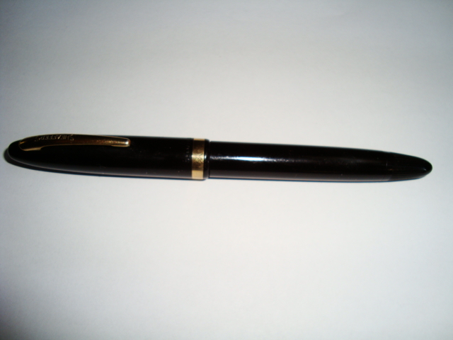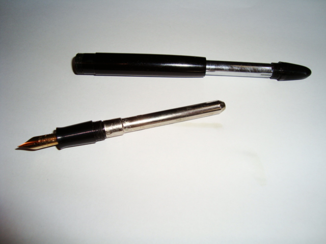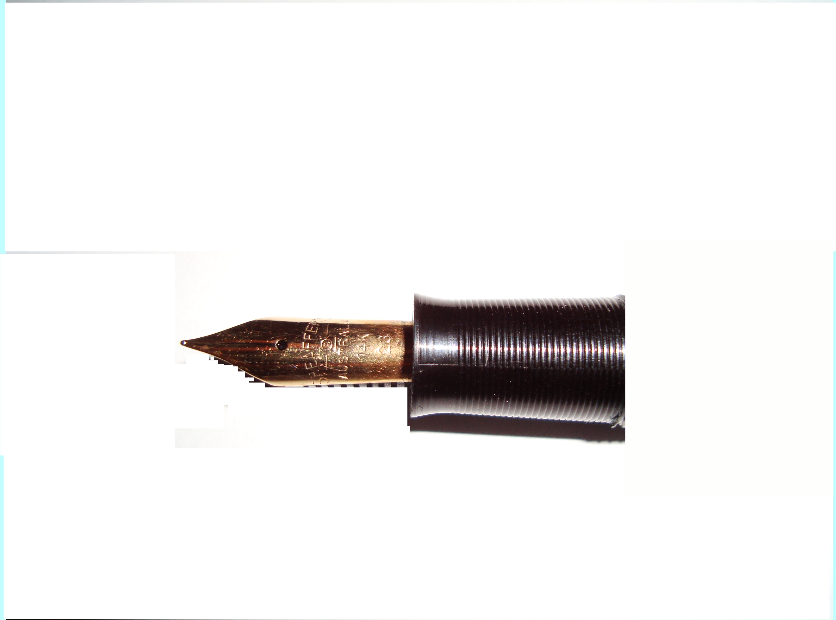 Mi è capitata tra le mani questa Sheaffer's, col pennino in oro 14 carati marchiato Sheaffer's Australia, di cui non capisco come avvenga il caricamento. La sezione è solidamente infilata in un tubetto metallico che ricorda il serbatoio della Parker a caricamento capillare, però svitando il fondello e tirandolo in fuori, si nota come questo sia collegato saldamente ad un altro tubicino che una volta chiuso risulta essere coassiale al primo. Inoltre, montata la sezione e tirando il fondello si provoca una depressione a livello dell'alimentatore che fa riempire il fusto. Peccato che il tubicino, una volta piena la penna d'inchiostro , rimane tutto al di fuori del fusto.