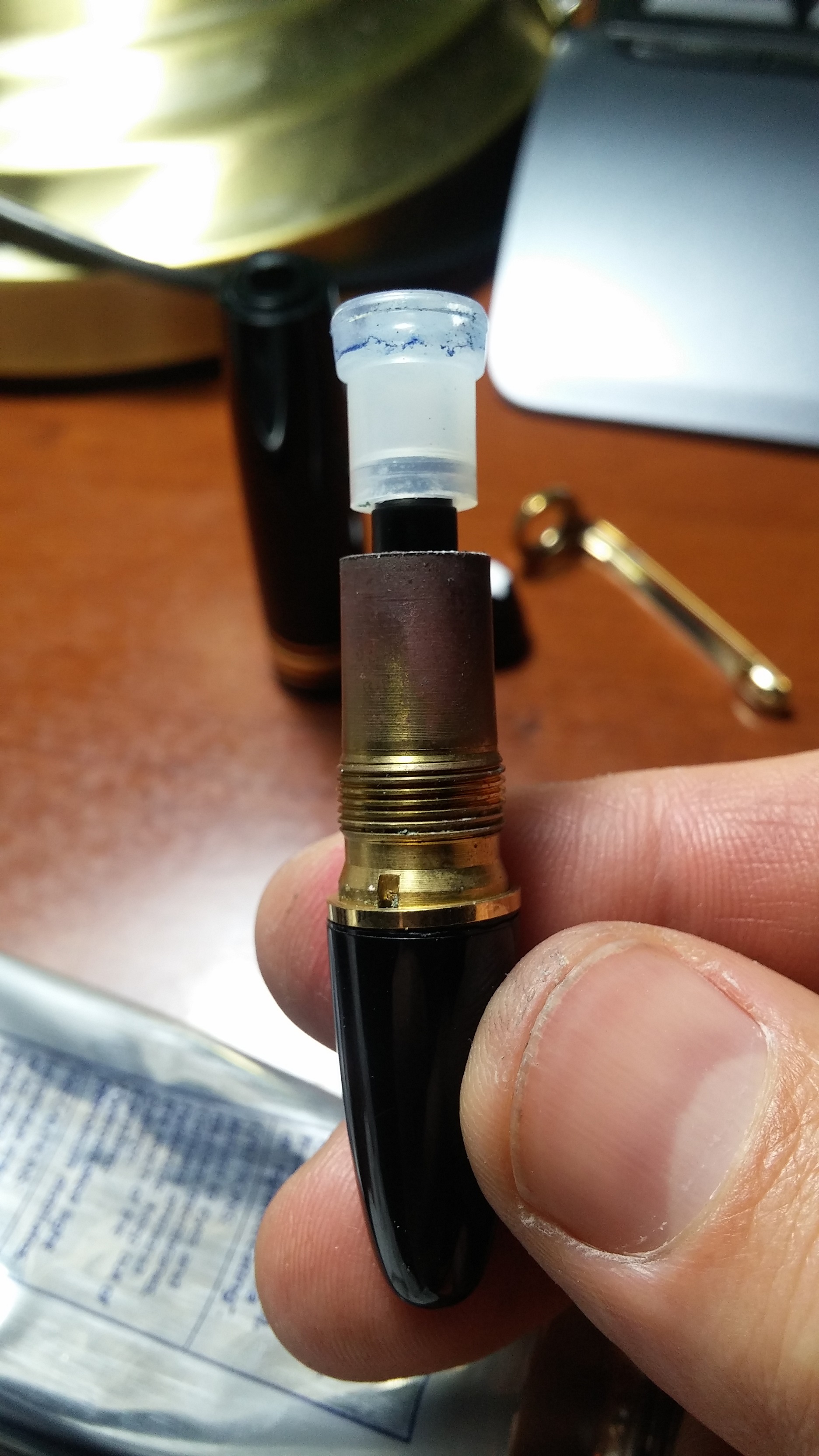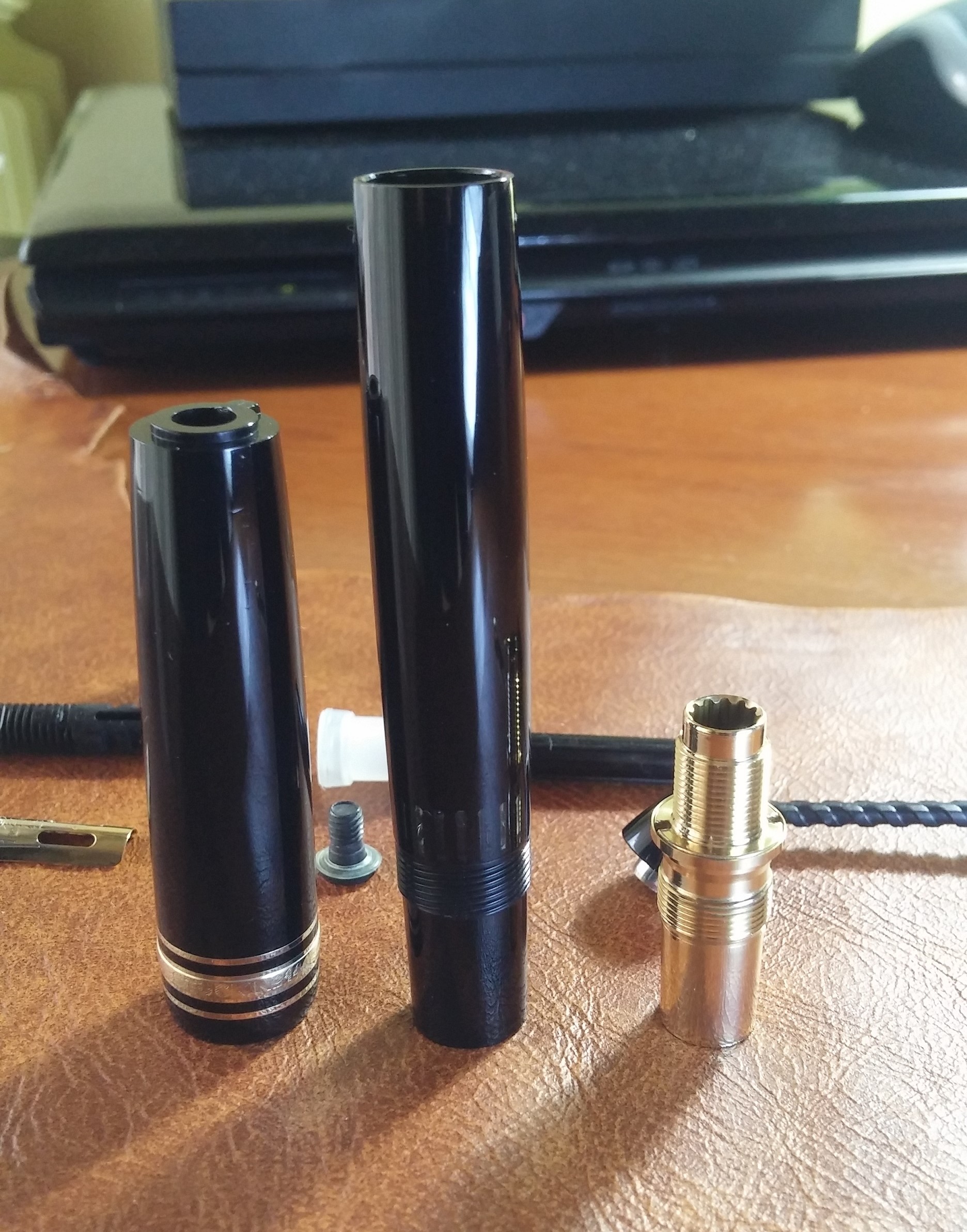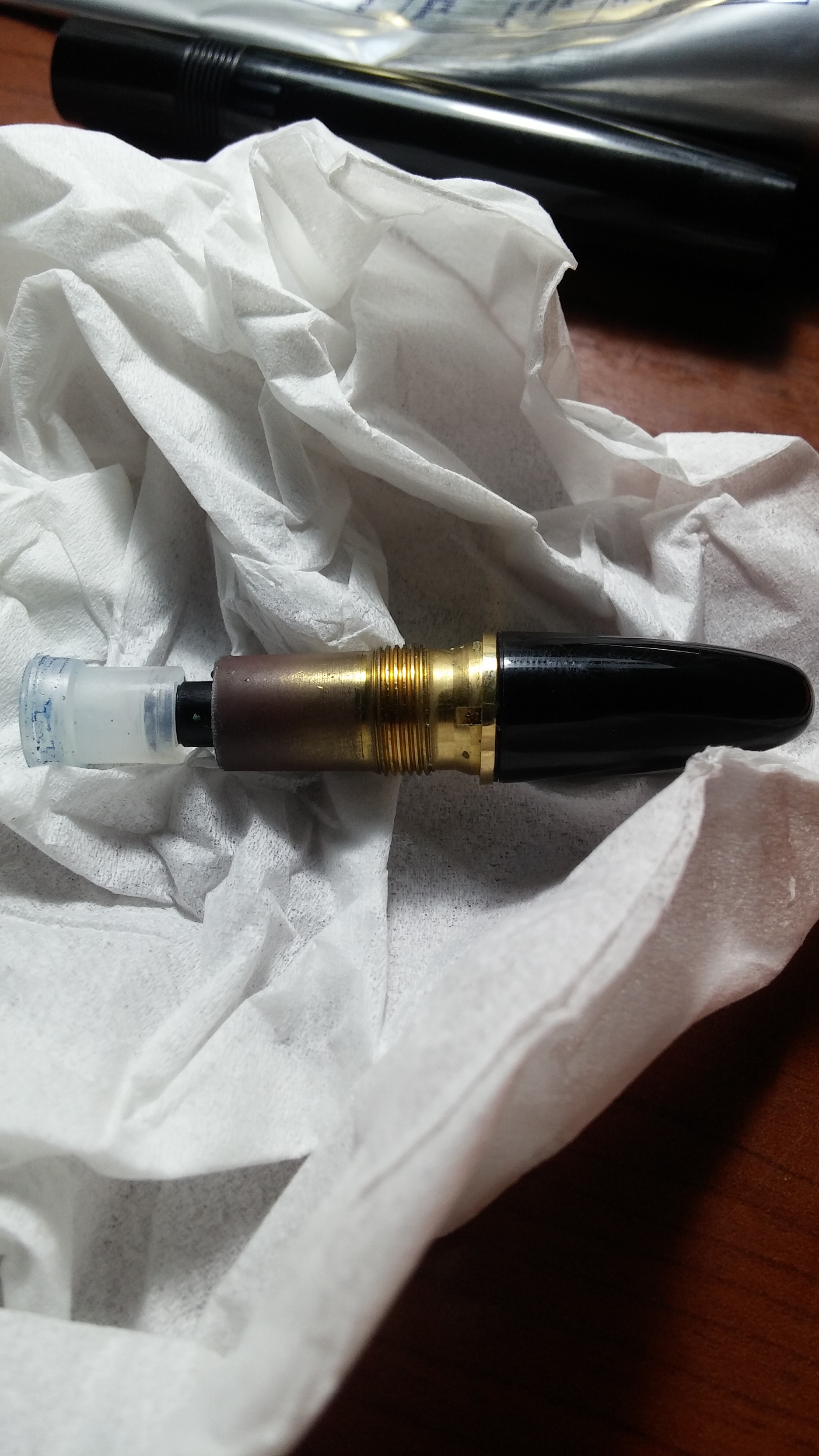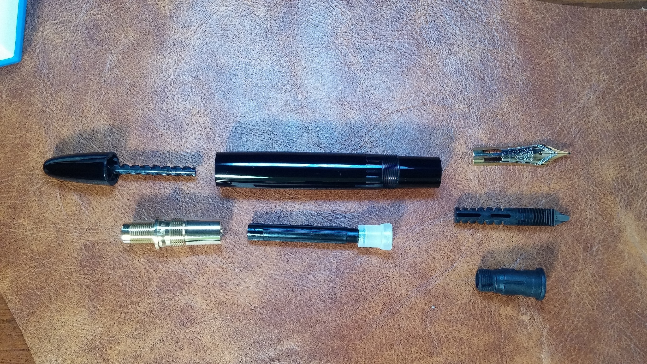 Qui un insieme di tutti i pezzi prima di essere rimontati Dopo aver lubrificato con del grasso siliconico il pistone ho provveduto a rimontare la penna e... voilà il risultato finale Sono molto soddisfatto del risultato, certo la penna non è perfetta ma a me occorreva una penna per tutti i giorni da portare sempre con me e da utilizzare per scrivere sull'agenda o prendere degli appunti al volo.