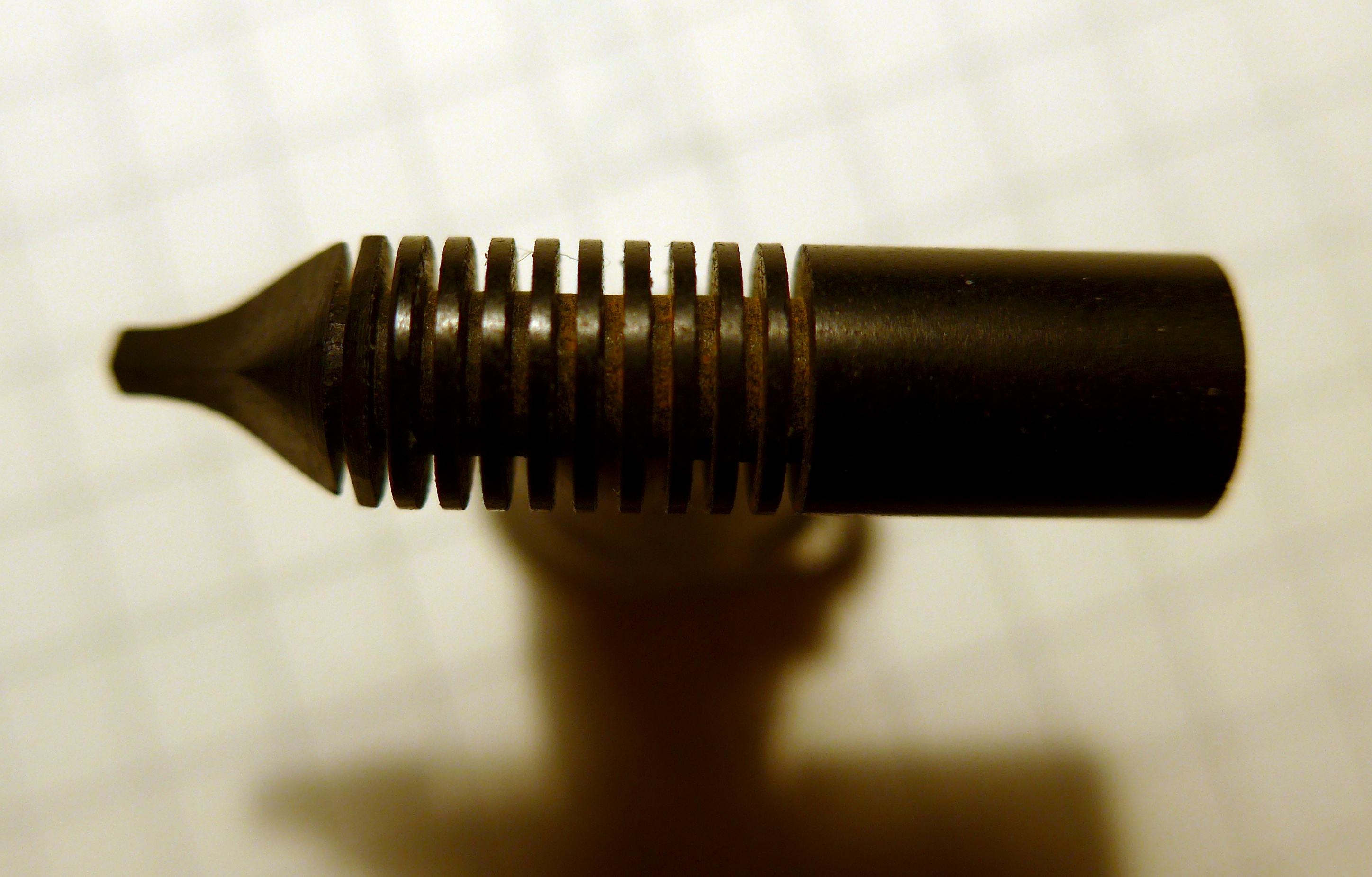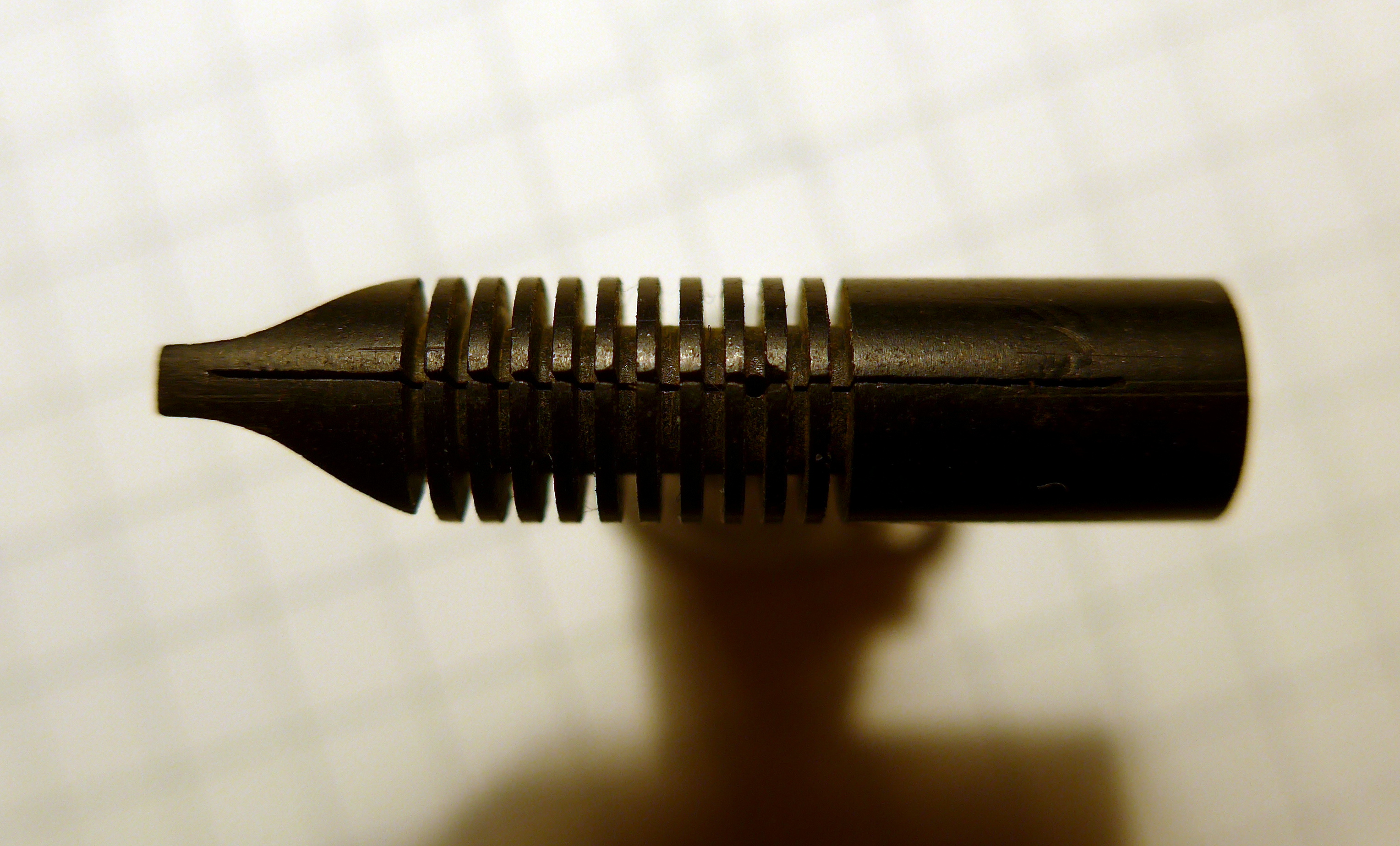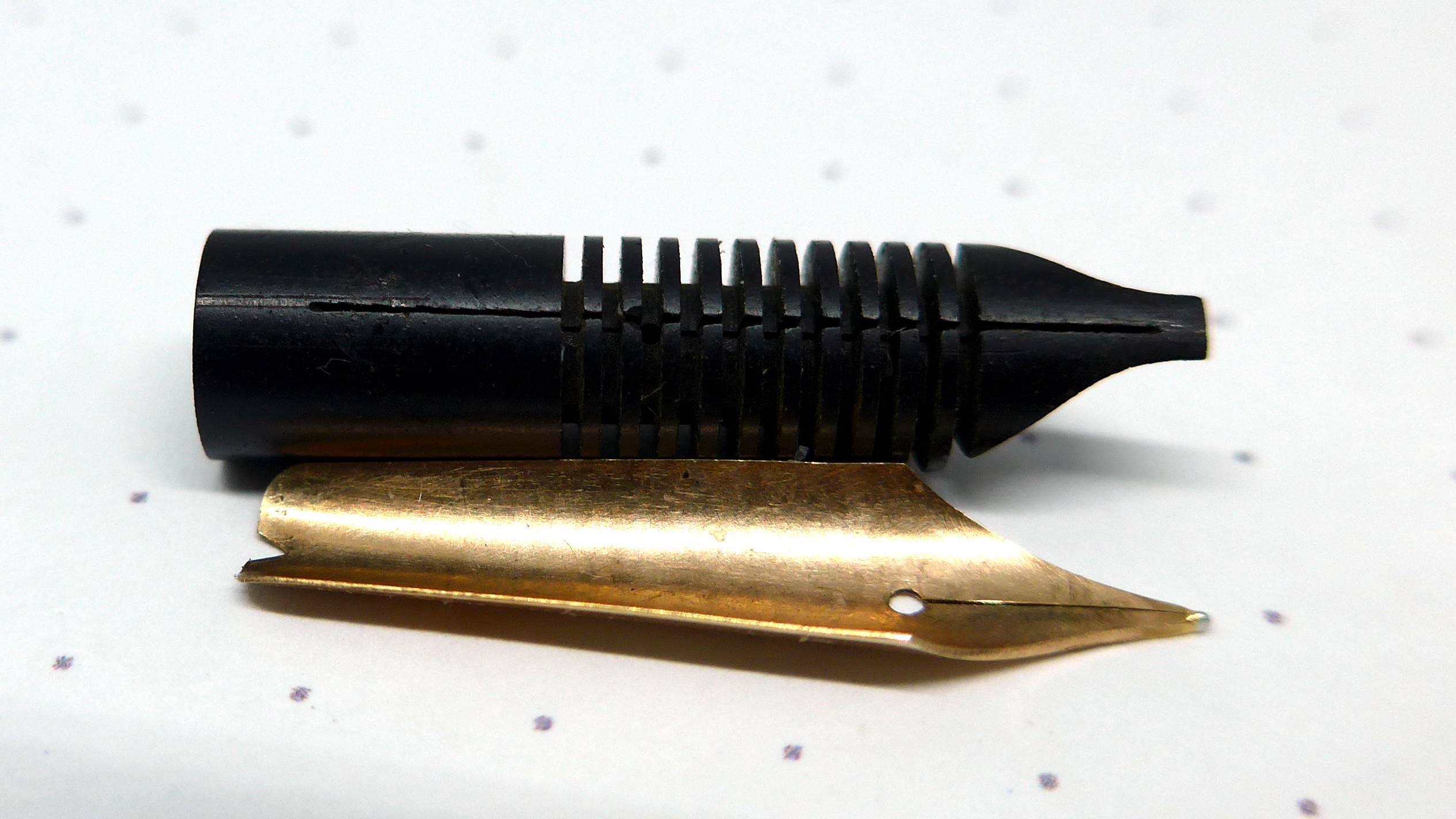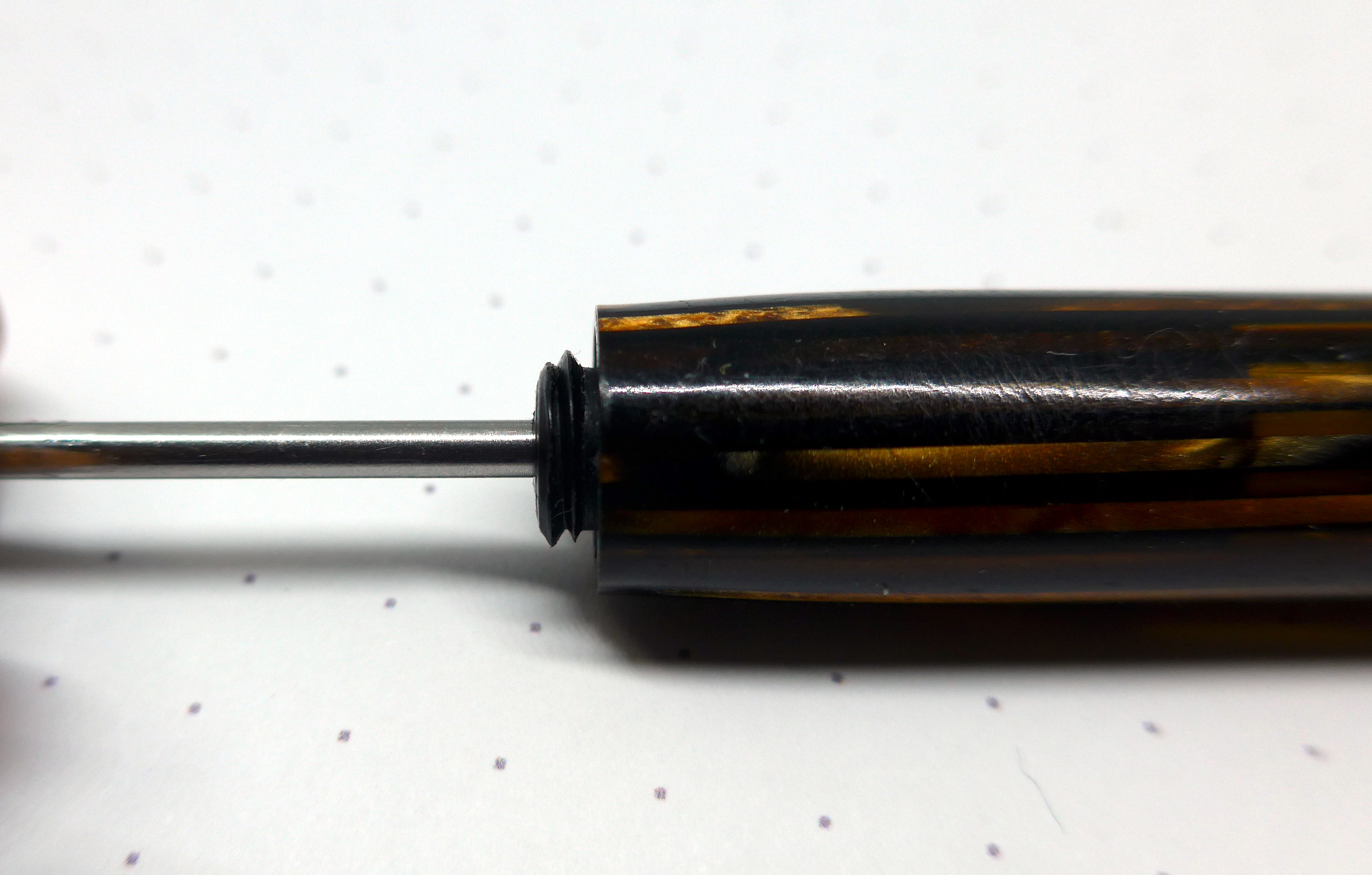 Non c'è modo di capire come sia fatto esattamente quel benedetto pezzo di ebanite. Tocca procedere a tastoni. Così come è fatto il pezzo di alimentatore che ho in mano io. Contiene un foro con Ø > 1mm che comunica con un foro posto sotto il pennino. Dovessi usare così la penna, probabilmente verserebbe tutto l'inchiostro del serbatoito sulla prima lettera che provo a scriverci.