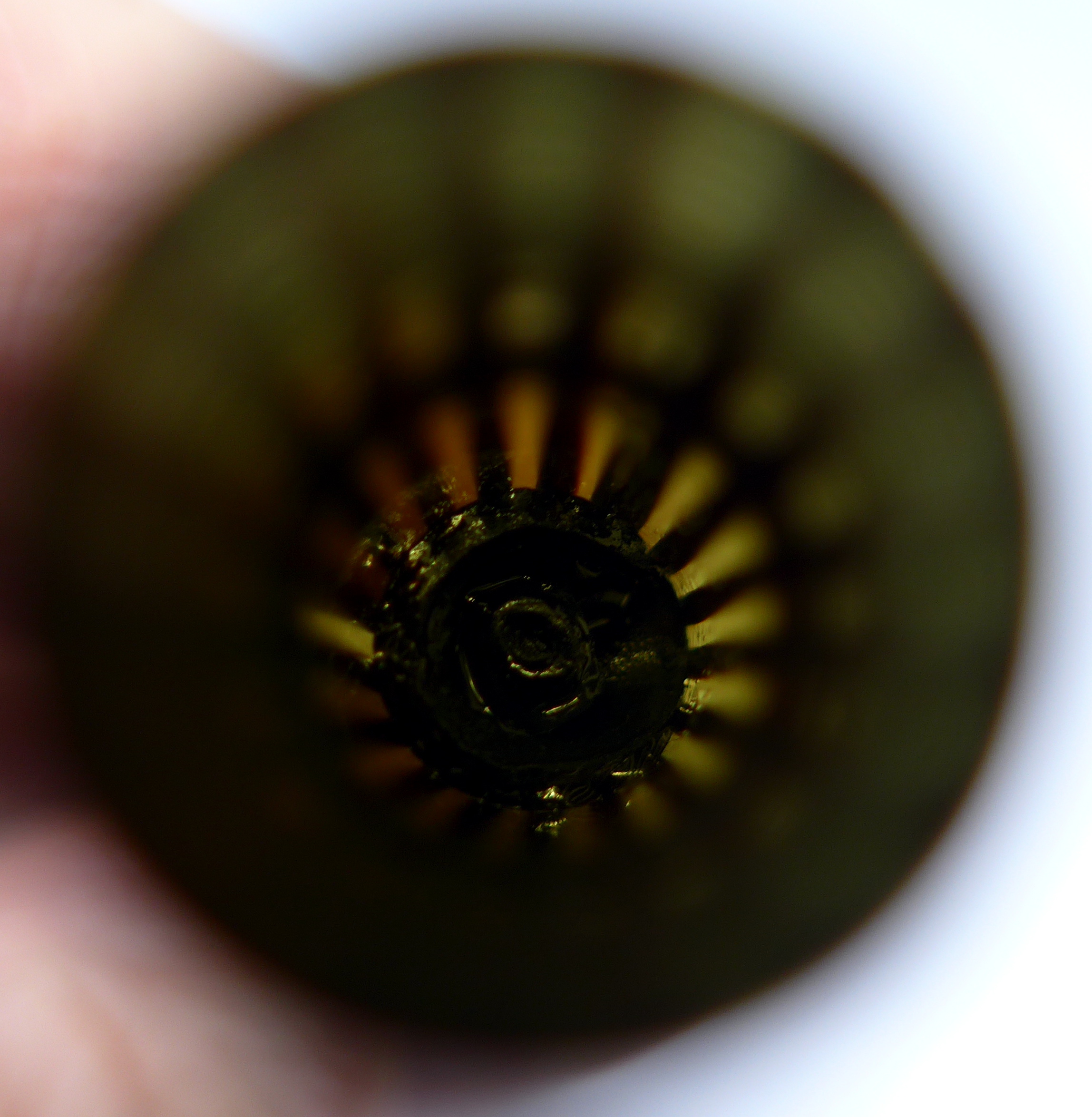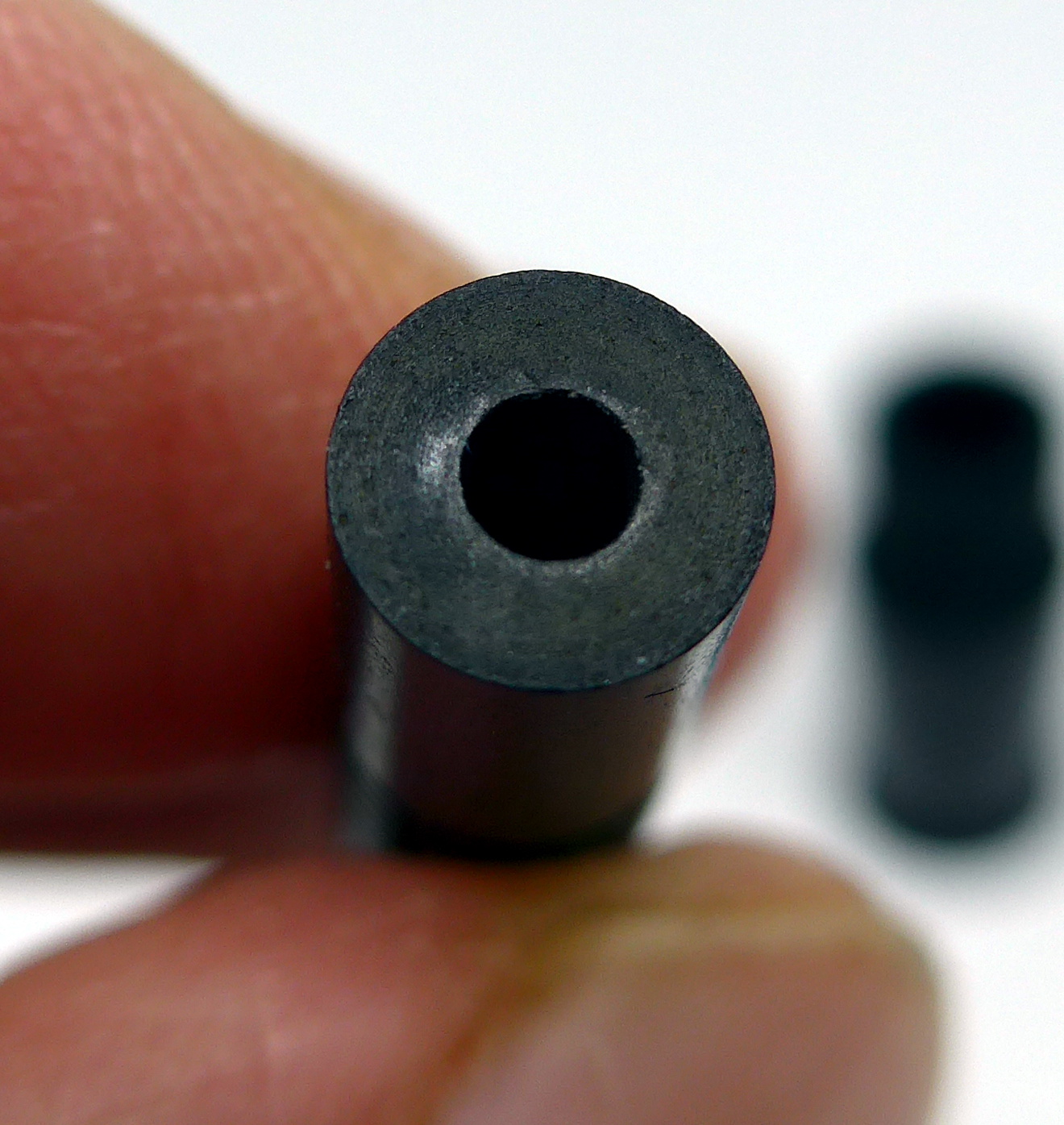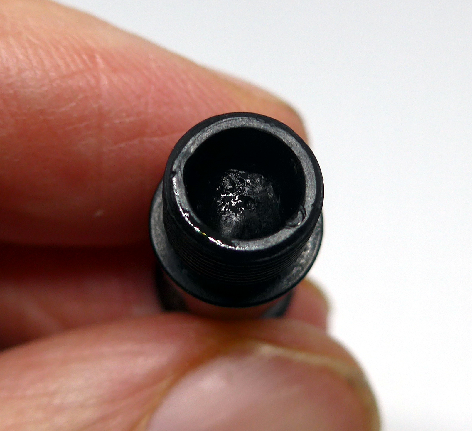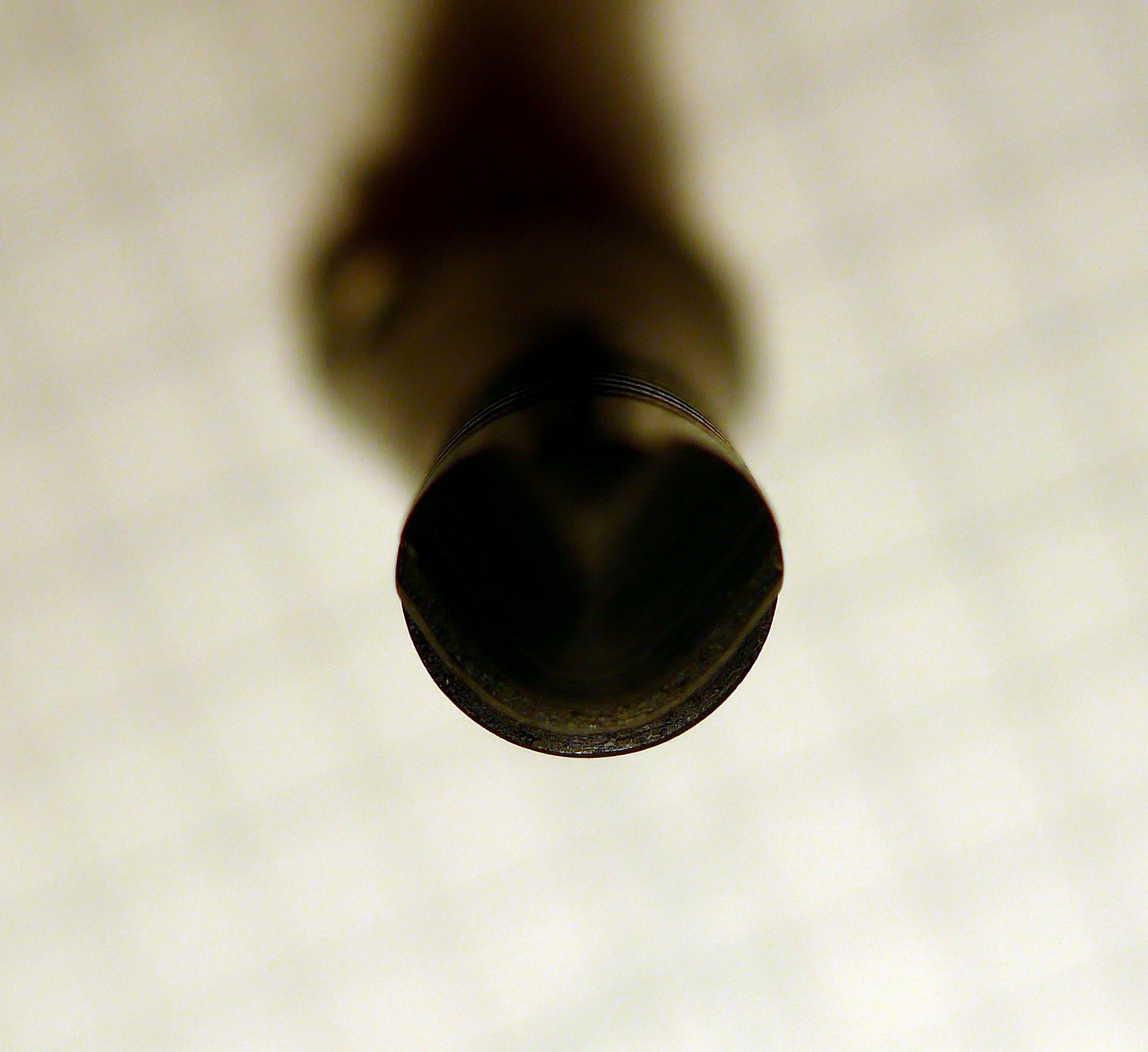 Non c'è modo di capire come sia fatto esattamente quel benedetto pezzo di ebanite. Tocca procedere a tastoni. Così come è fatto il pezzo di alimentatore che ho in mano io. Contiene un foro con Ø > 1mm che comunica con un foro posto sotto il pennino. Dovessi usare così la penna, probabilmente verserebbe tutto l'inchiostro del serbatoito sulla prima lettera che provo a scriverci.