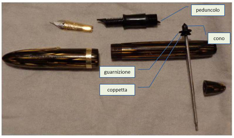 Mentre per le Twisbi, quando arrivo (quasi) al fondocorsa si allarga la canna, la guarnizione non fa più tenuta e la depressione creata genera un risucchio dell'inchiostro da sotto, nelle Sheaffer non abbiamo una variazione di Ø della canna, ma un contatto tra cono e peduncolo che spingendo da un lato la guarnizione, apre una finestrella che permette alla depressioen di agire come sopra.