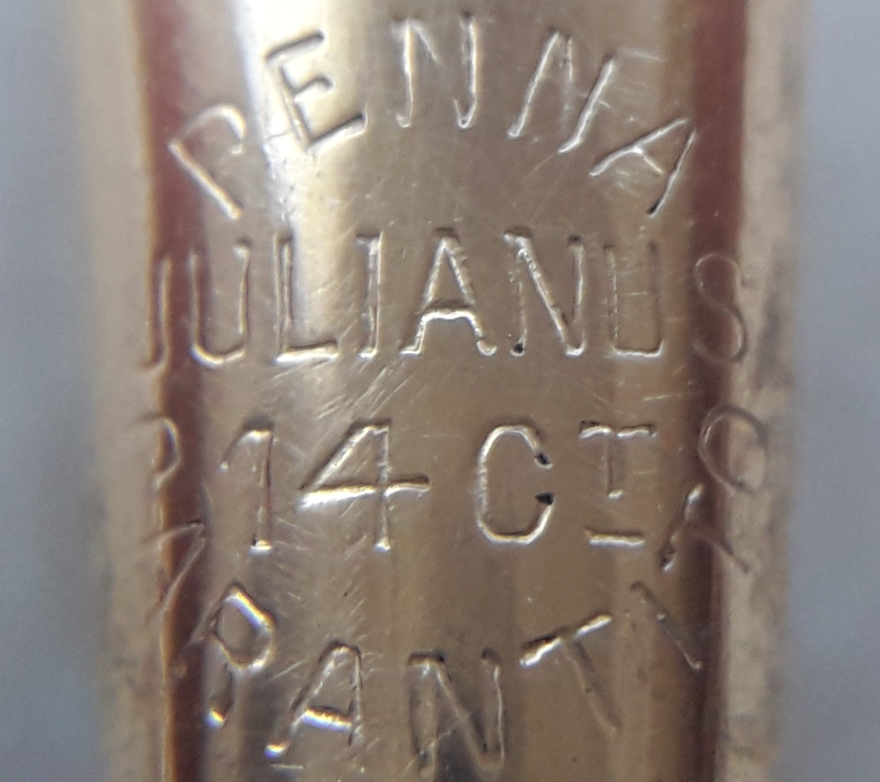 Lo stile dell’iscrizione principale, che ricorda da vicino i caratteri prediletti dal Liberty, farebbe piuttosto pensare alla (prima) metà degli anni Venti ma l’unica informazione certa, ahimè, è che il pennino sia stato prodotto prima del 1934, anno in cui una legge più volte citata rese obbligatoria la punzonatura dell’oro in millesimi.