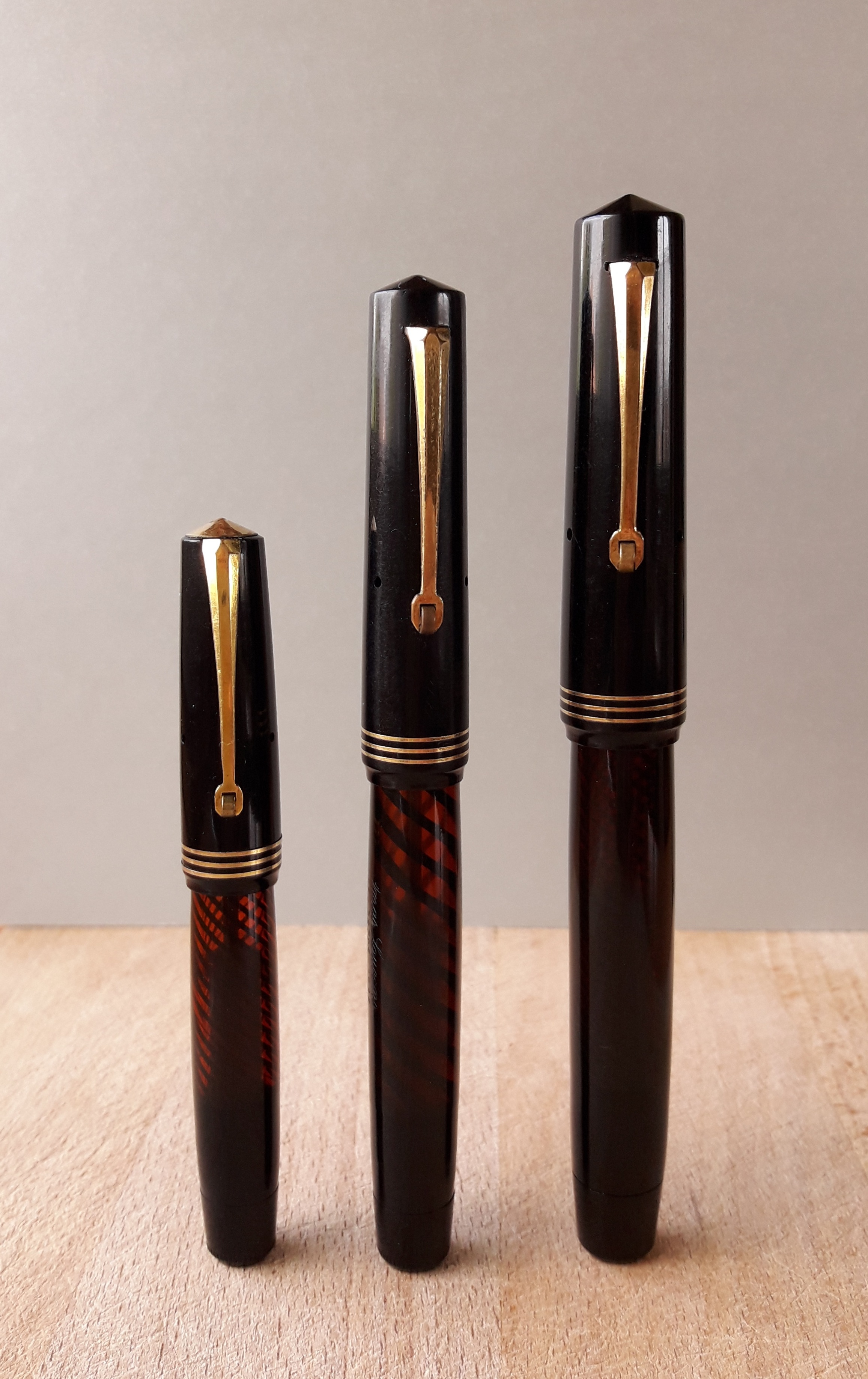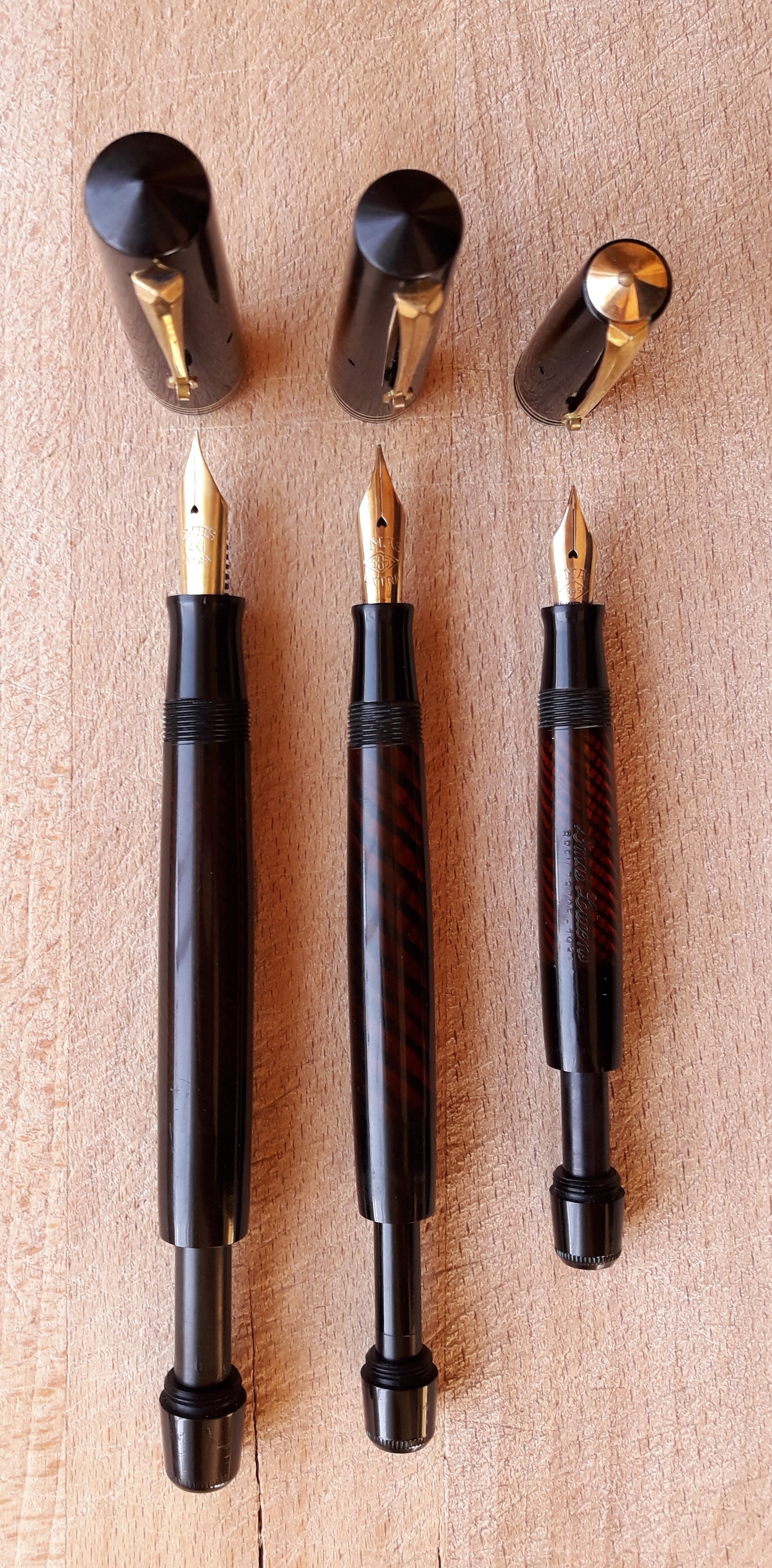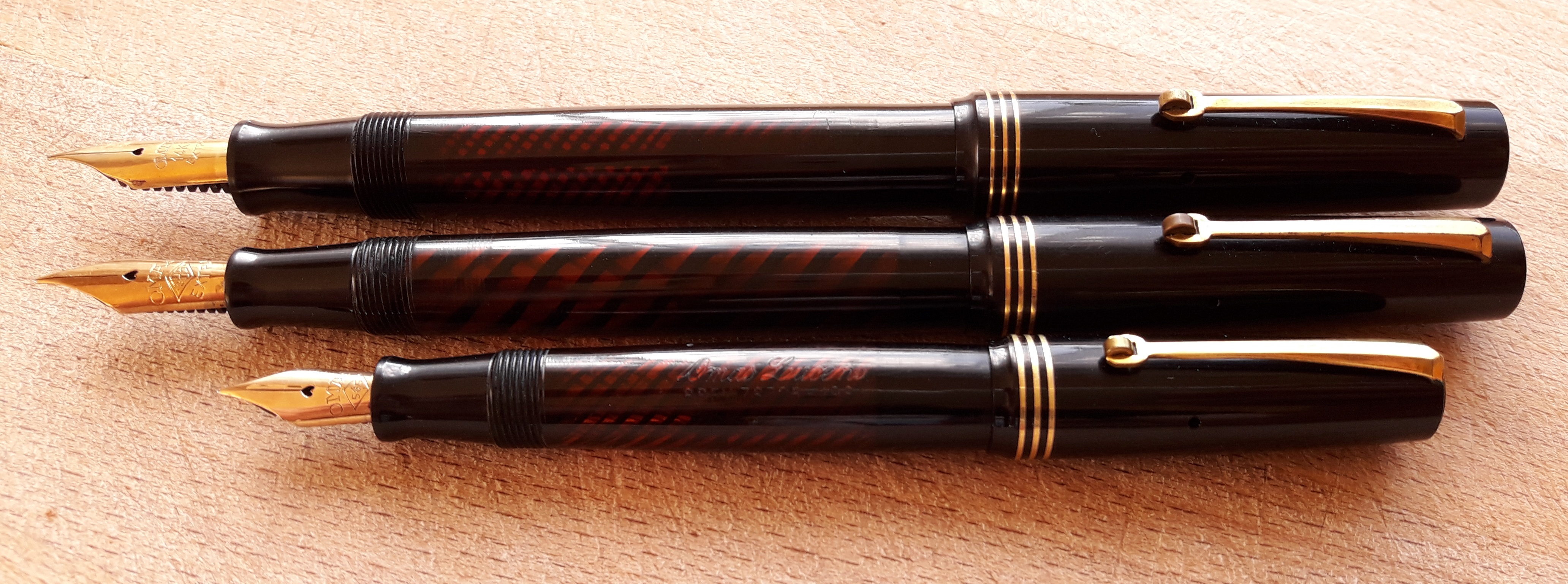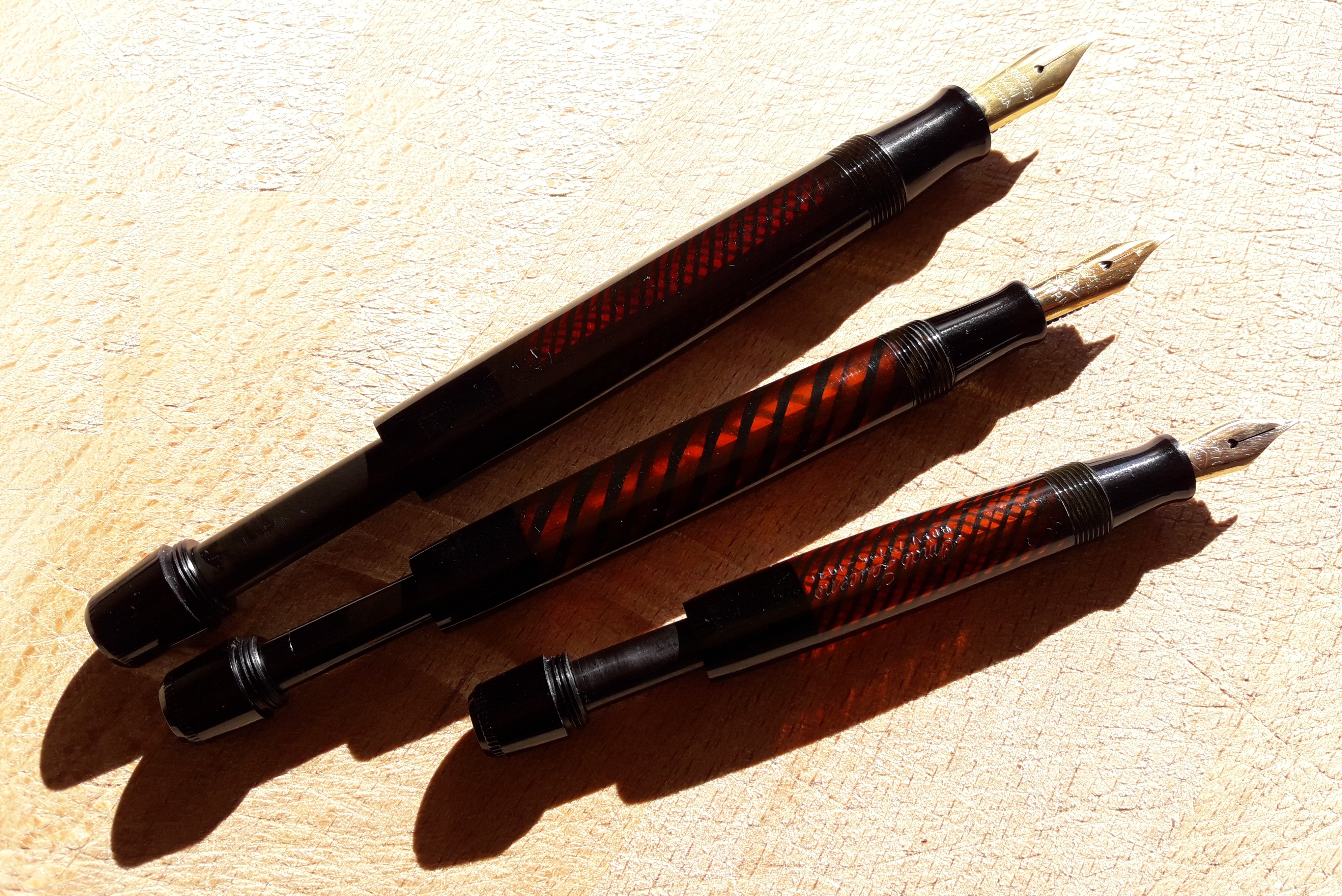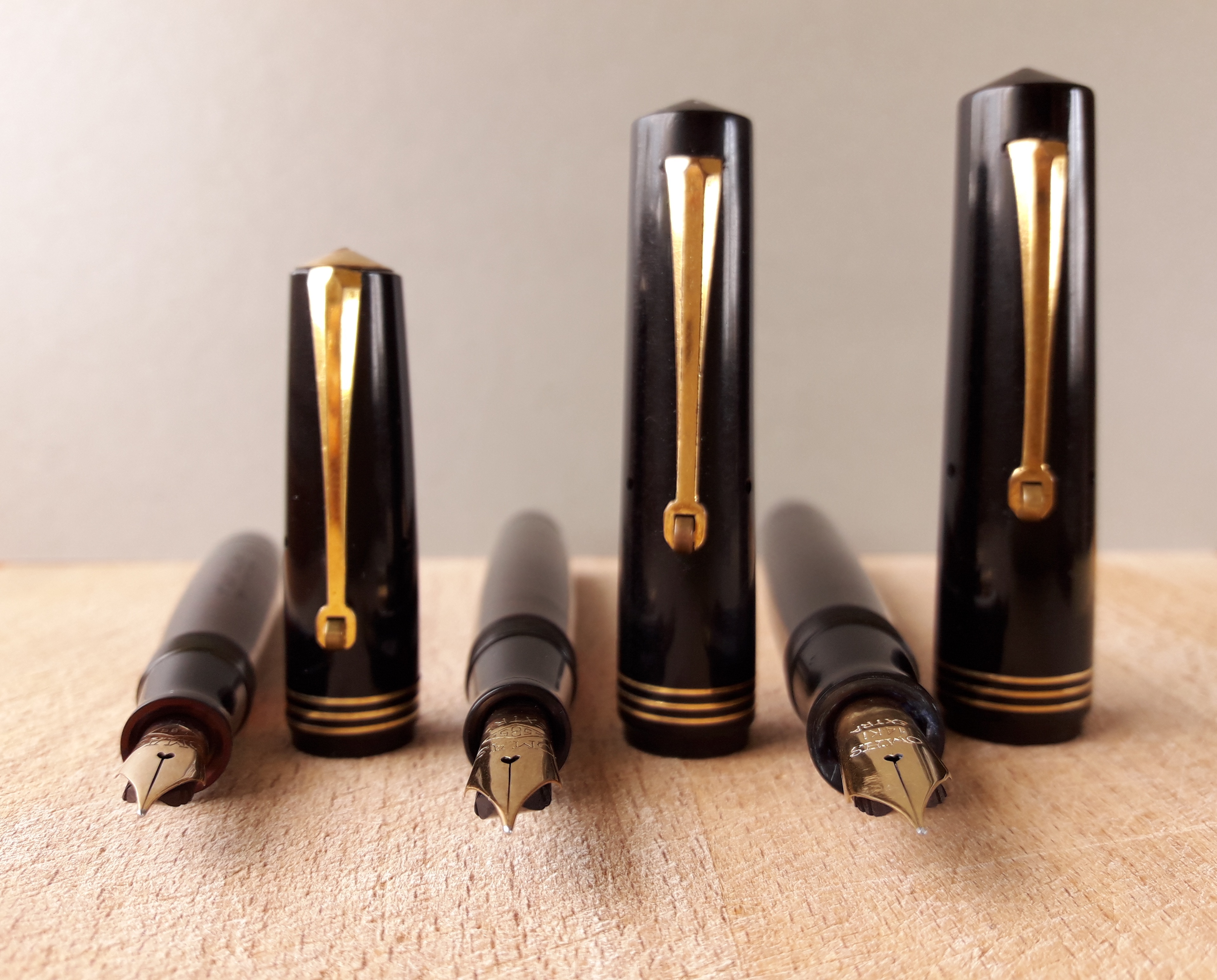 OMAS LUCENS IIa serie 1938 nelle tre misure (grande, media e piccola), in celluloide nera e semitrasparente “red spiral” tornite da barra piena, pennini Omas Extra in oro 14 carati, parti metalliche a vista laminate in oro, caricamento a stantuffo tuffante, prodotte in Italia nel 1938.