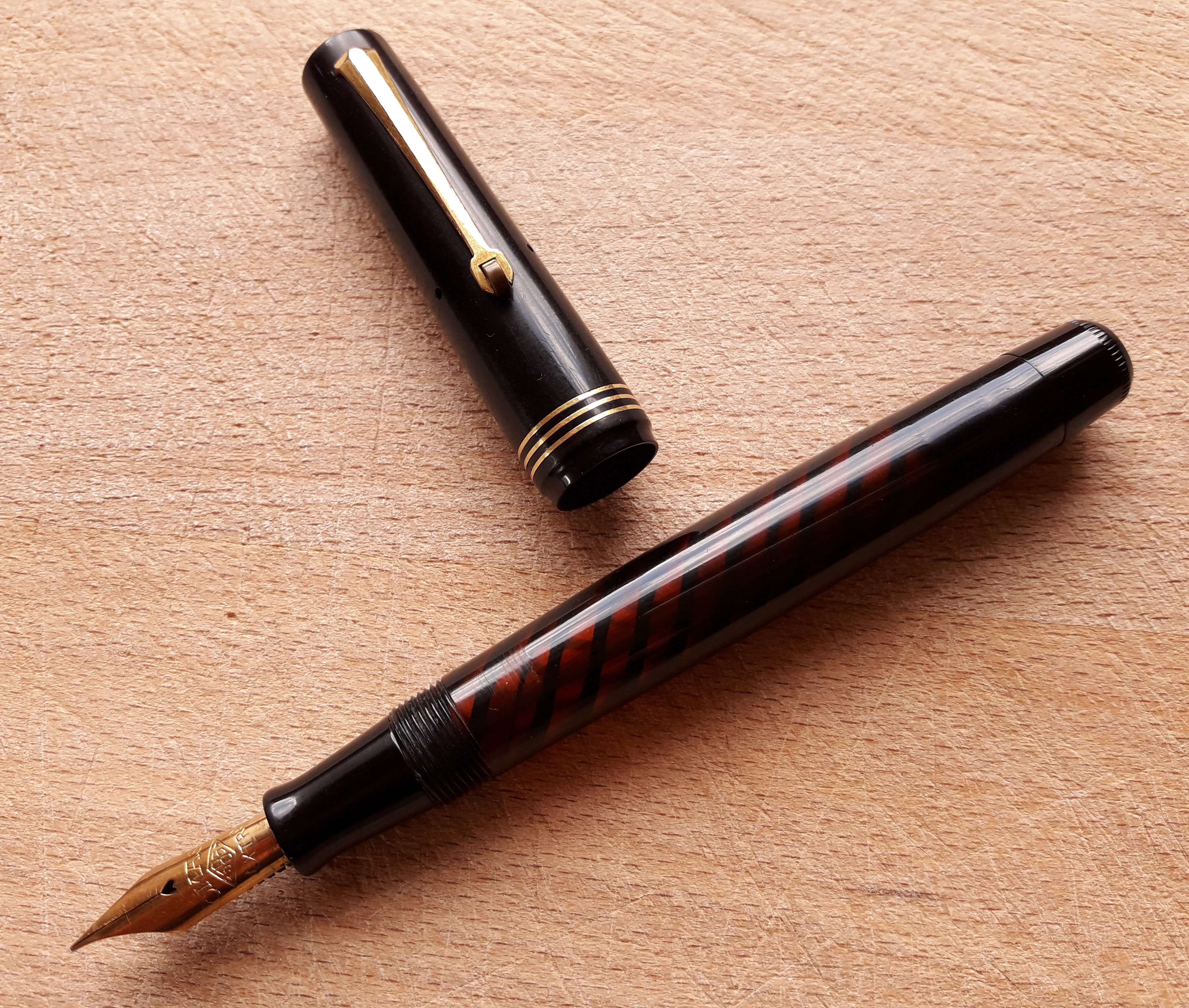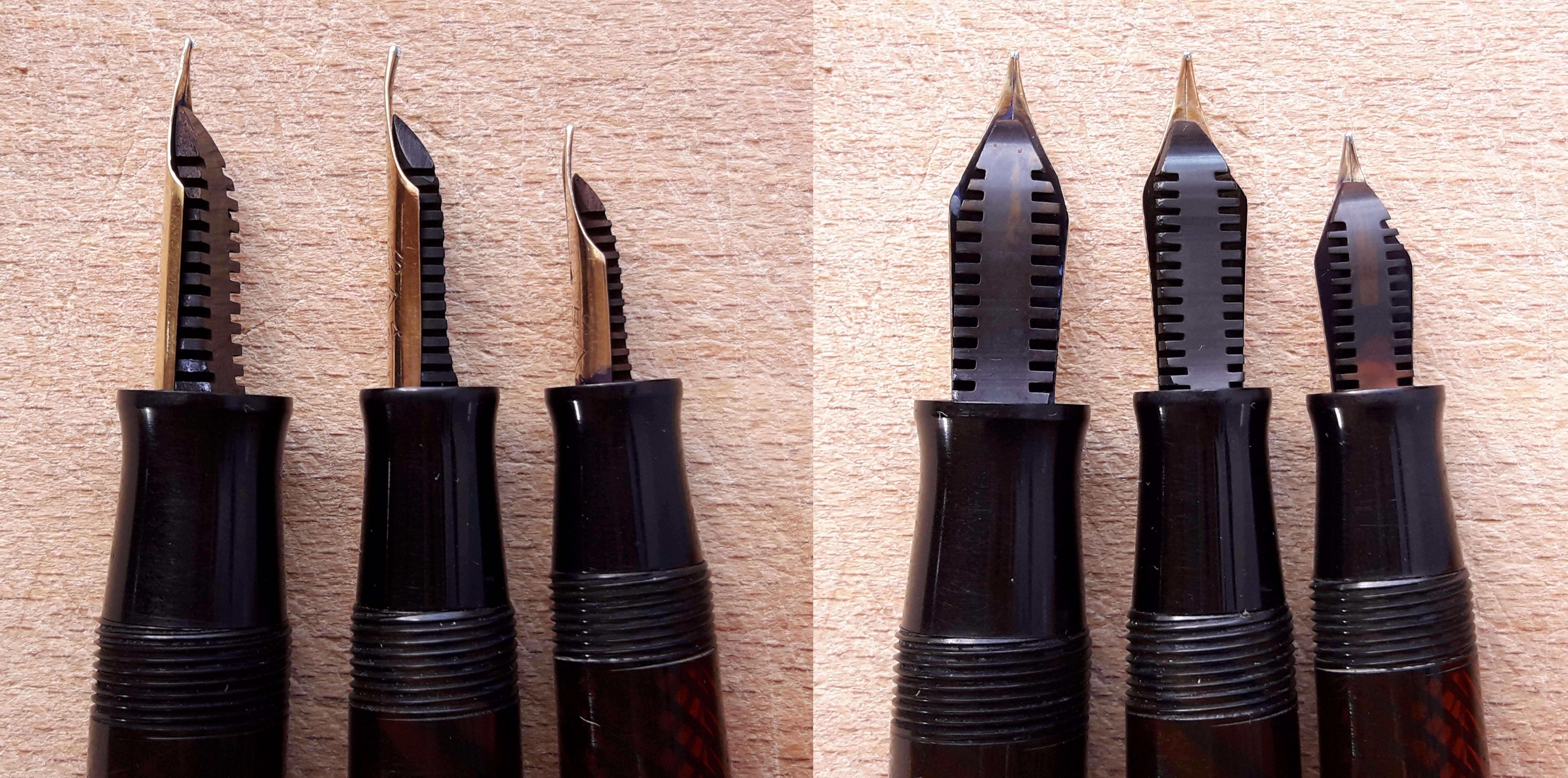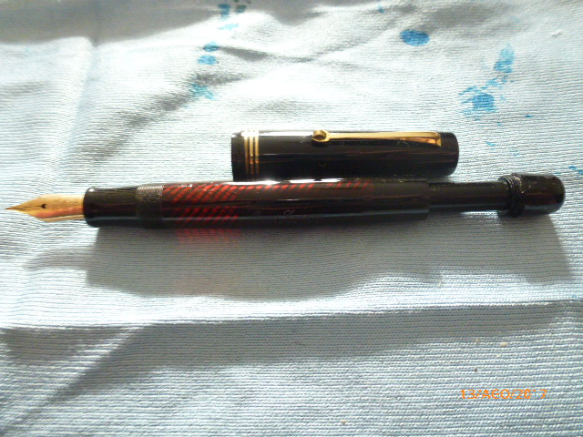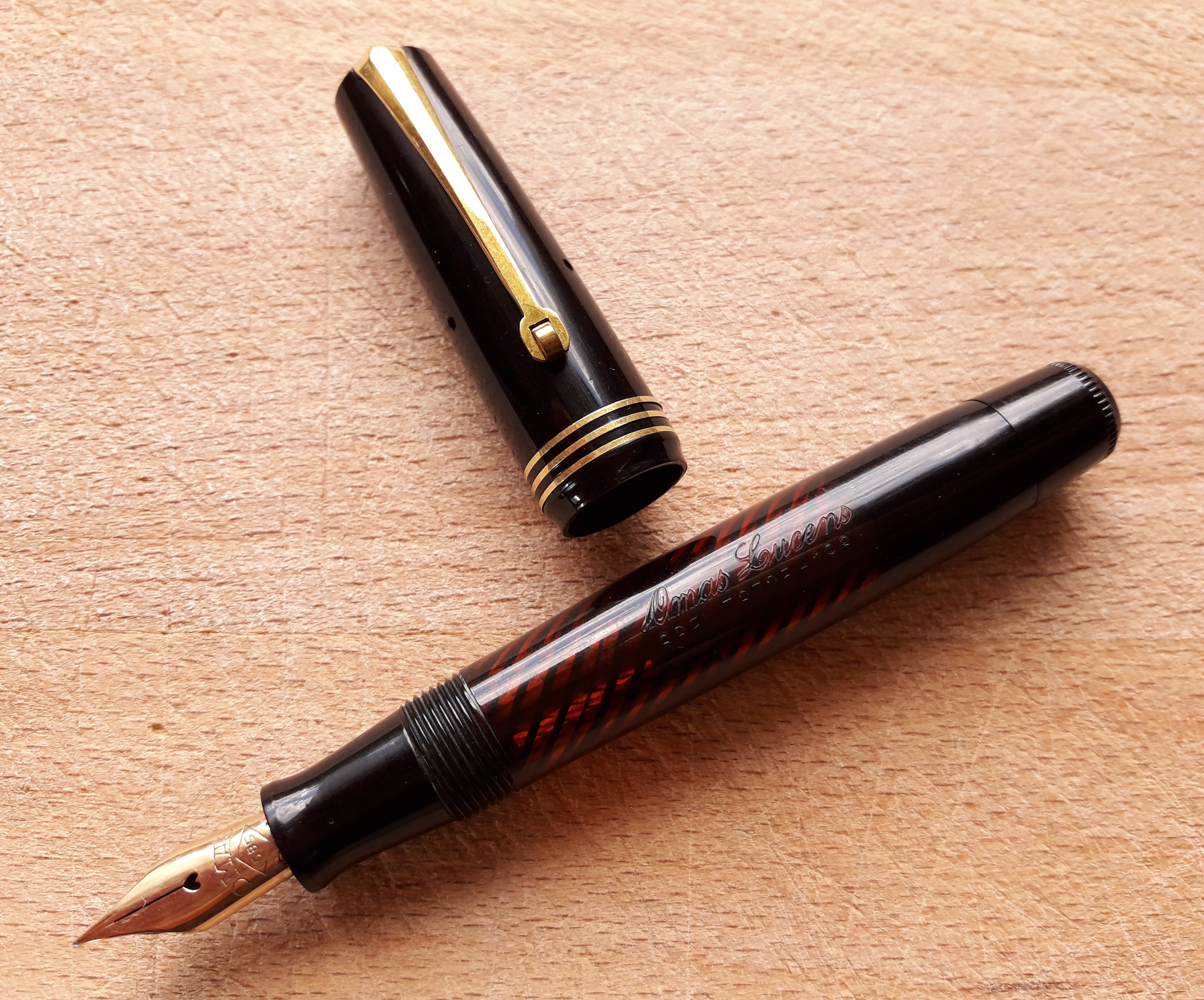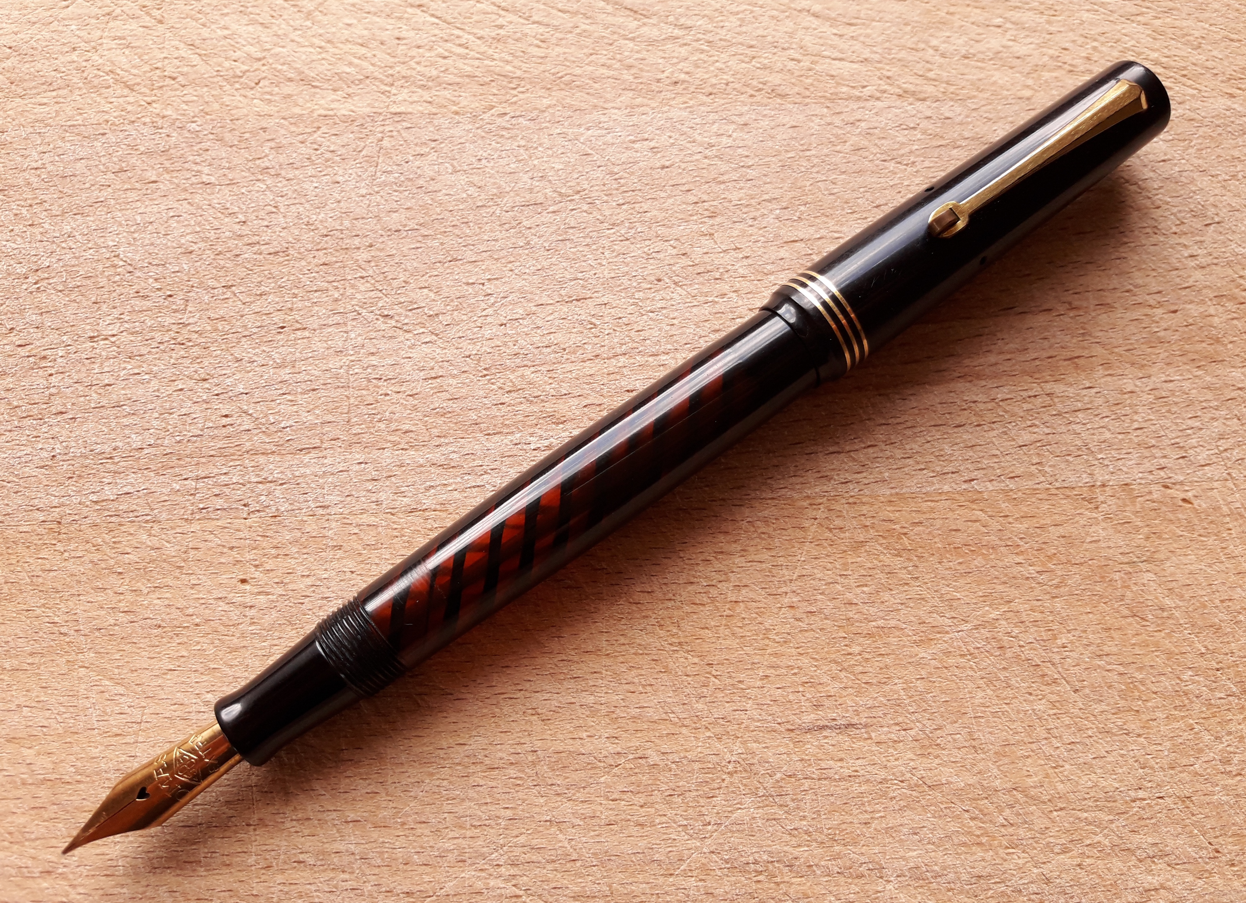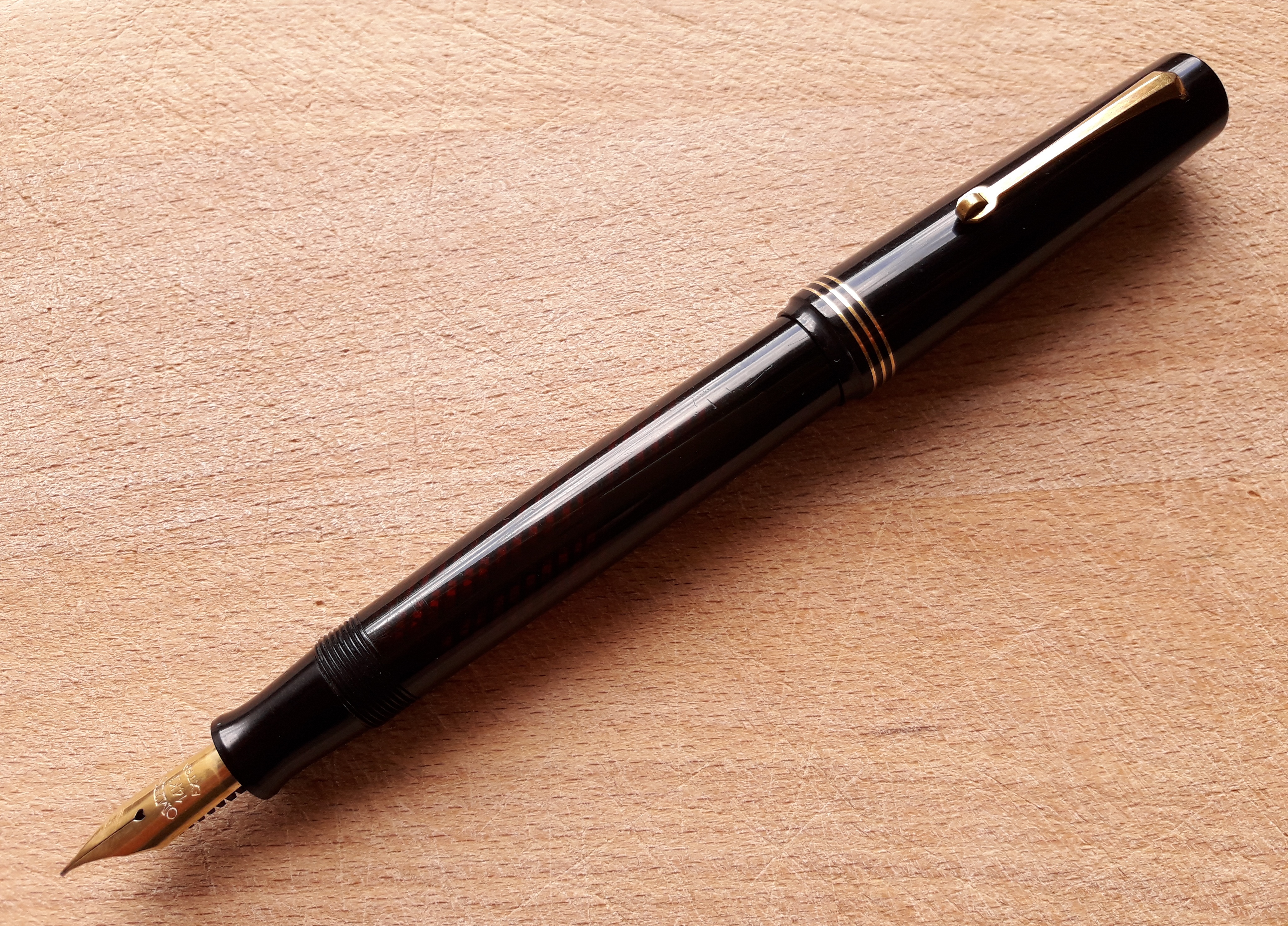 OMAS LUCENS IIa serie 1938 nelle tre misure (grande, media e piccola), in celluloide nera e semitrasparente “red spiral” tornite da barra piena, pennini Omas Extra in oro 14 carati, parti metalliche a vista laminate in oro, caricamento a stantuffo tuffante, prodotte in Italia nel 1938.