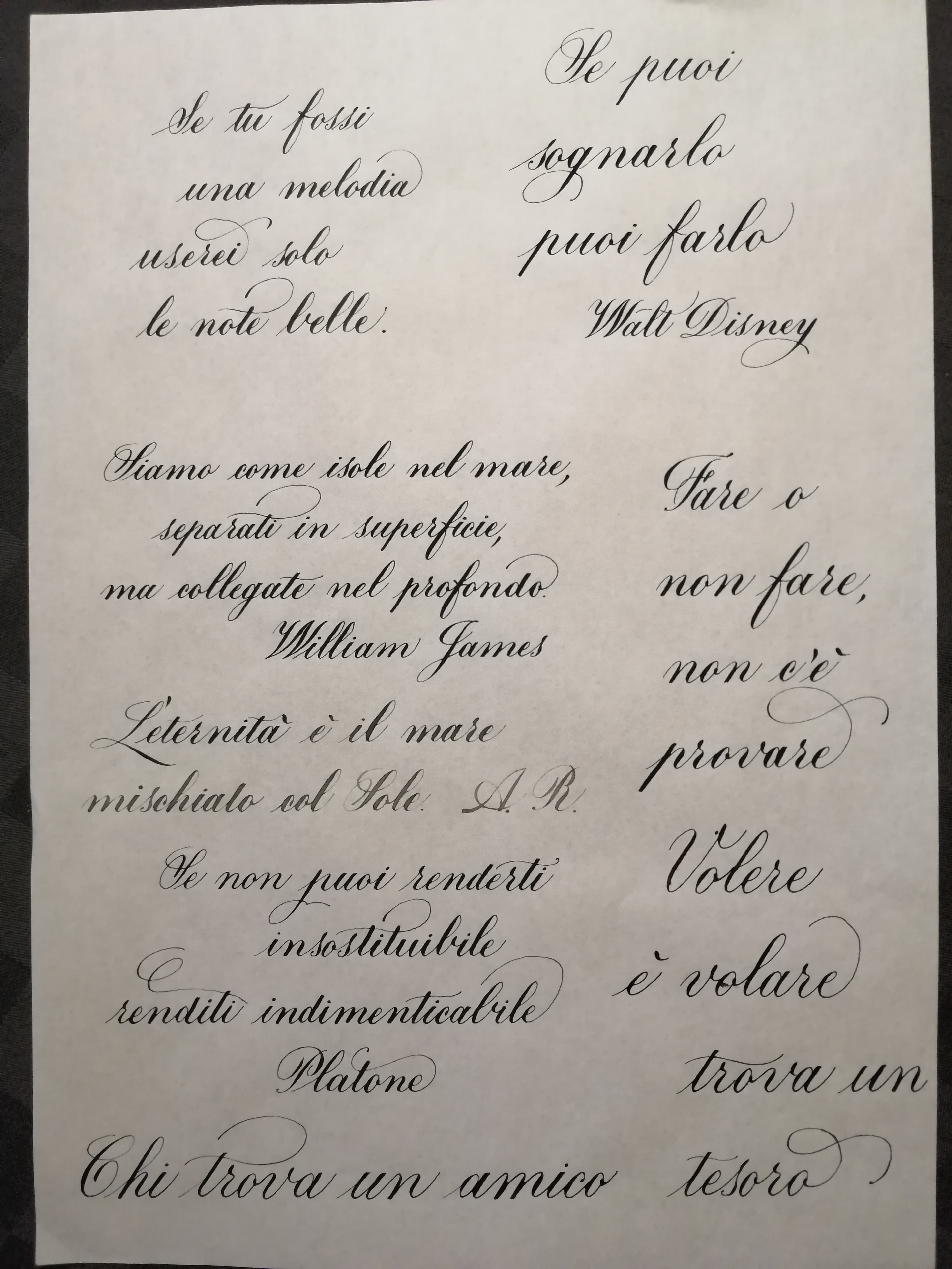 Un pó di citazioni a caso. Scrivendo in piccolo con il pennino che uso di solito non riesco a controllare bene lo stacco dei tratti spessi. Faró delle prove con altri pennini.