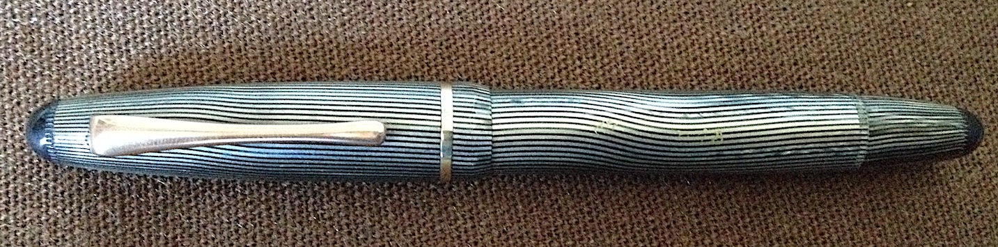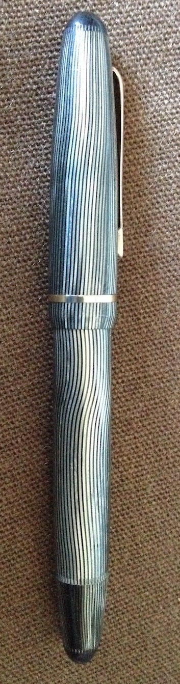 Ammaliatrice e sinuosa per le striature ipnotiche verde acqua, questa stilo dei primi anni '50 si presenta con un piccolo pennino in oro vero (ogni tanto....) e bei dettagli metallici che danno l'impressione, ma solo quella purché ben fatti, di essere in oro anche loro. E' lunga 13,2 cm, il fusto ha un diametro di 12 mm e pesa 18 gr senza inchiostro. Il caricamento è a bottone. L'uso ha quasi cancellato il logo sul fusto, ma non saprei dire quanto fosse stato inciso in profondità. Anche se interessante, questa penna verrà presto alienata dalla mia collezione, che poi una vera collezione non è, poiché non ne segue il criterio filologico. Angelo Cavallo, titolare della ditta Settimese, registrò il marchio Surgens nel 1947 e secondo il Bertotto era un meccanico che insieme ad un socio, tal Sergio Cernusco, aprì un laboratorio durante la guerra con l'aiuto di Dino Giacomazzi. Cernusco poi si divise e cambiò attività, mentre Cavallo aprì un nuova officina e lanciò il suo marchio.