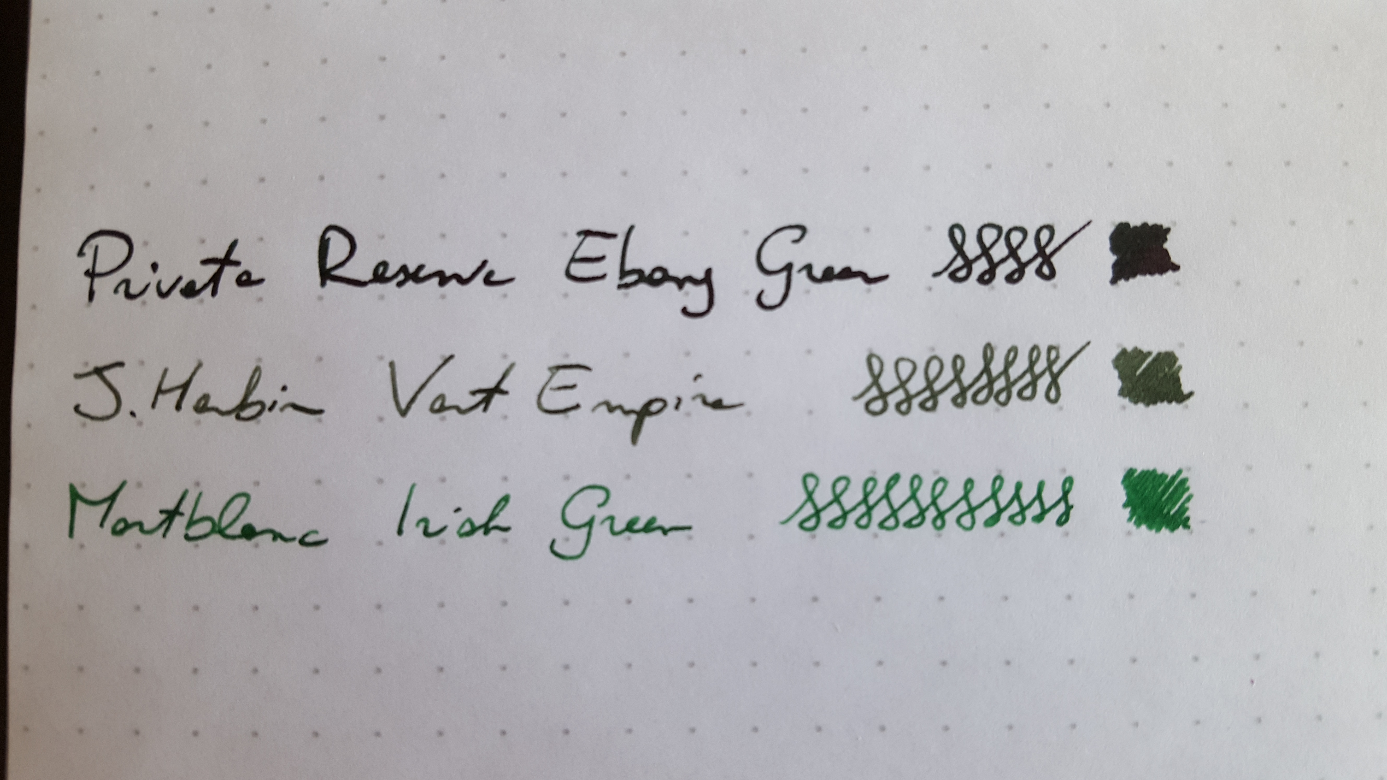 Sul verde scuro azzardo il suggerimento di un Private Reserve Ebony Green, che su penne dal flusso abbondante è quasi nero.