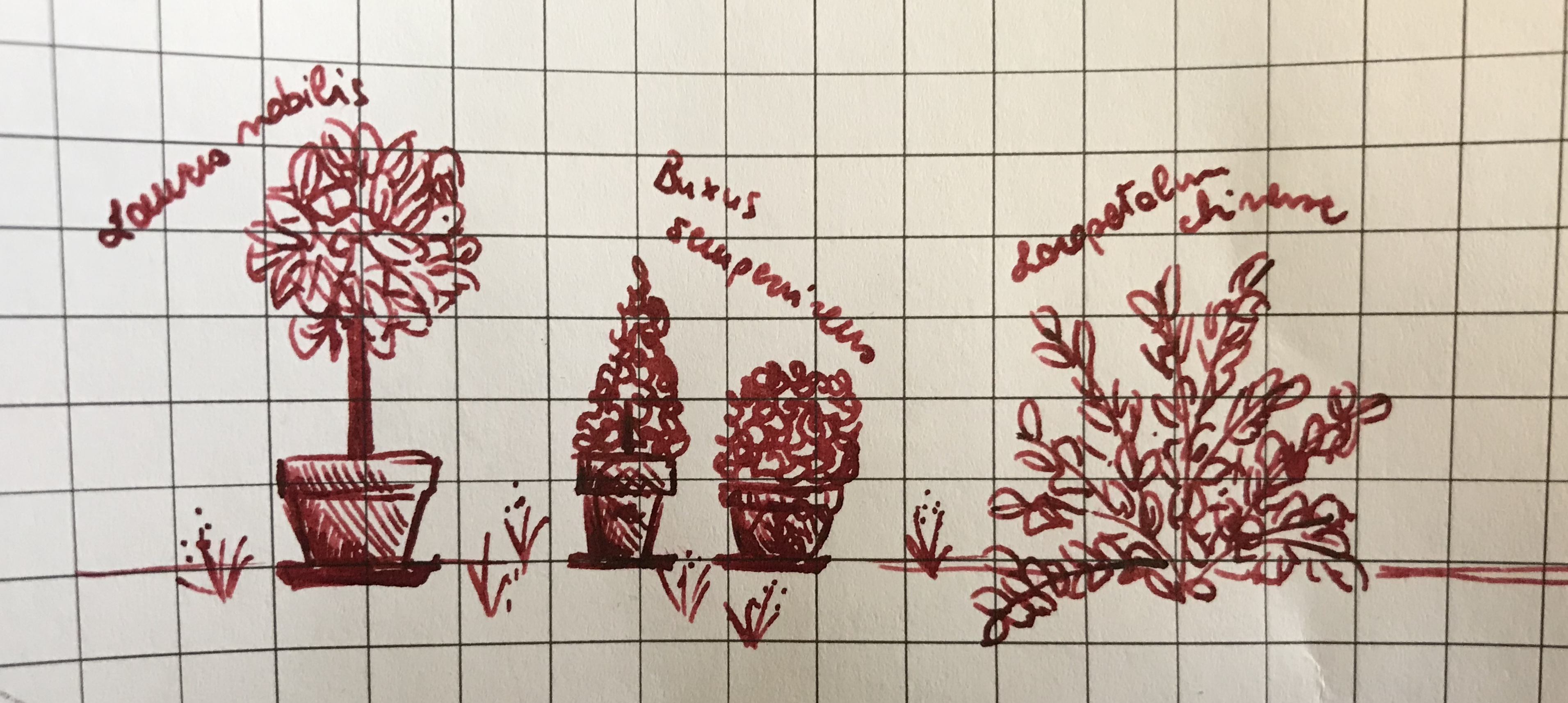 L’aiuola in blu è un Pelikan Edelstein Topaz; la marrone chiaro è un Pelikan 4001 marrone brillante mentre i disegni più scuri sono fatti con un Diamine Shirah