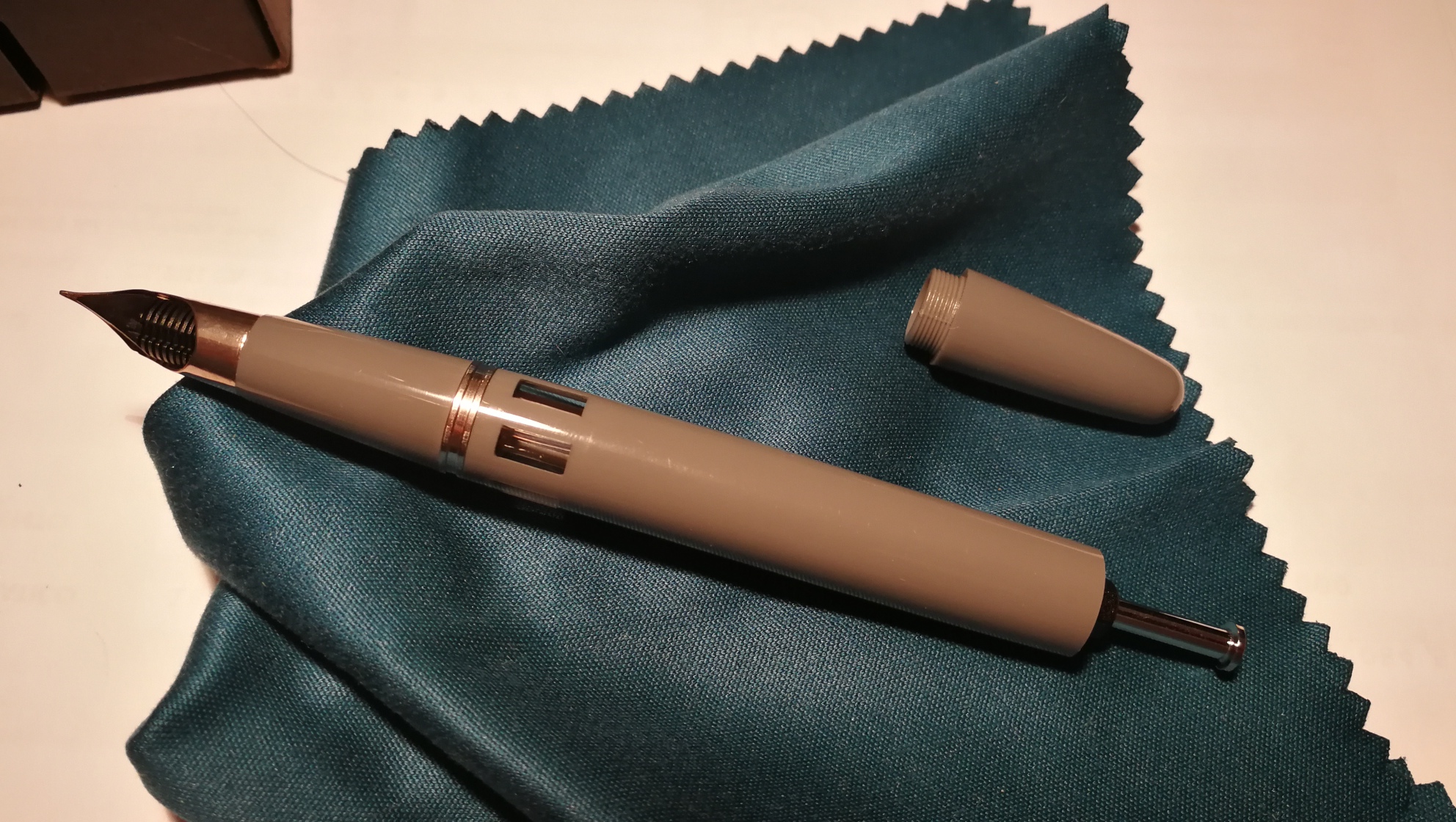 Il pennino è di gradazione 0.5, che corrisponderebbe a un F. È scorrevole e affronta bene anche la cartaccia da fotocopie. Il flusso è ben calibrato, non è abbondante in stile europeo ma non è neanche magro. La penna non perde un colpo, neanche dopo due giorni da ferma con il pennino verso l'alto.