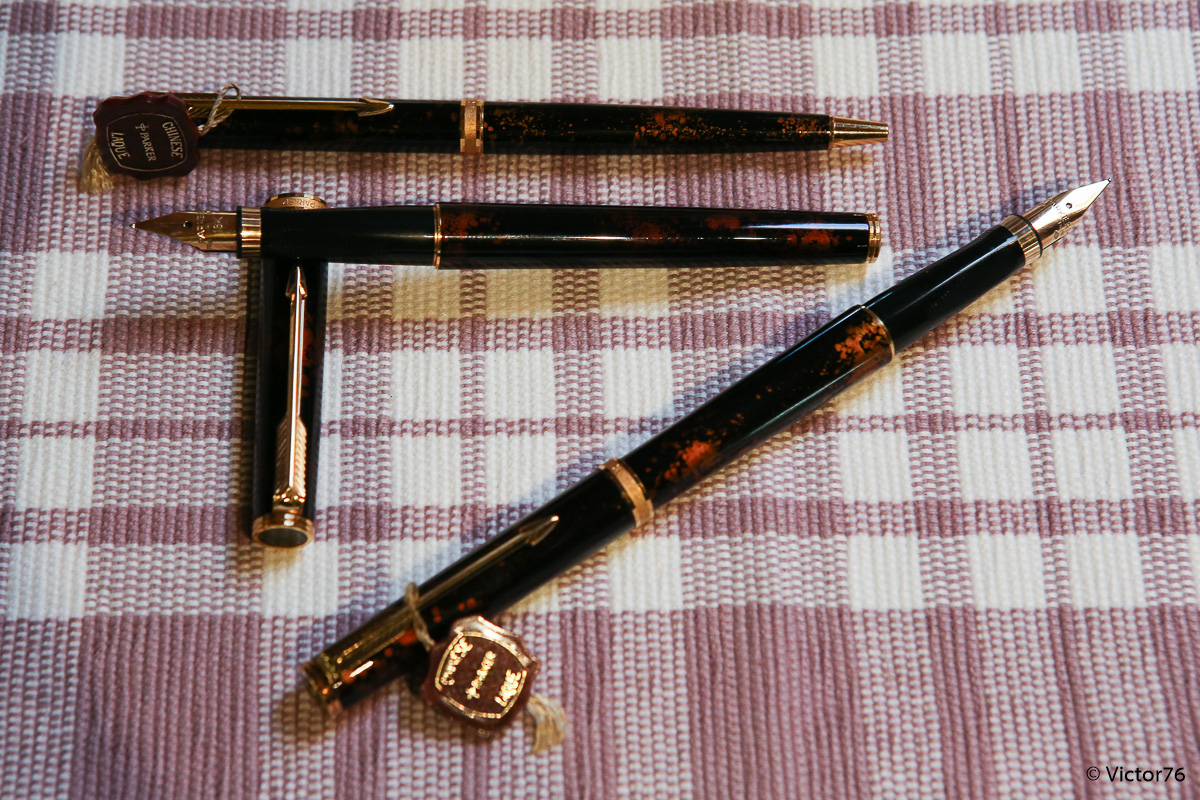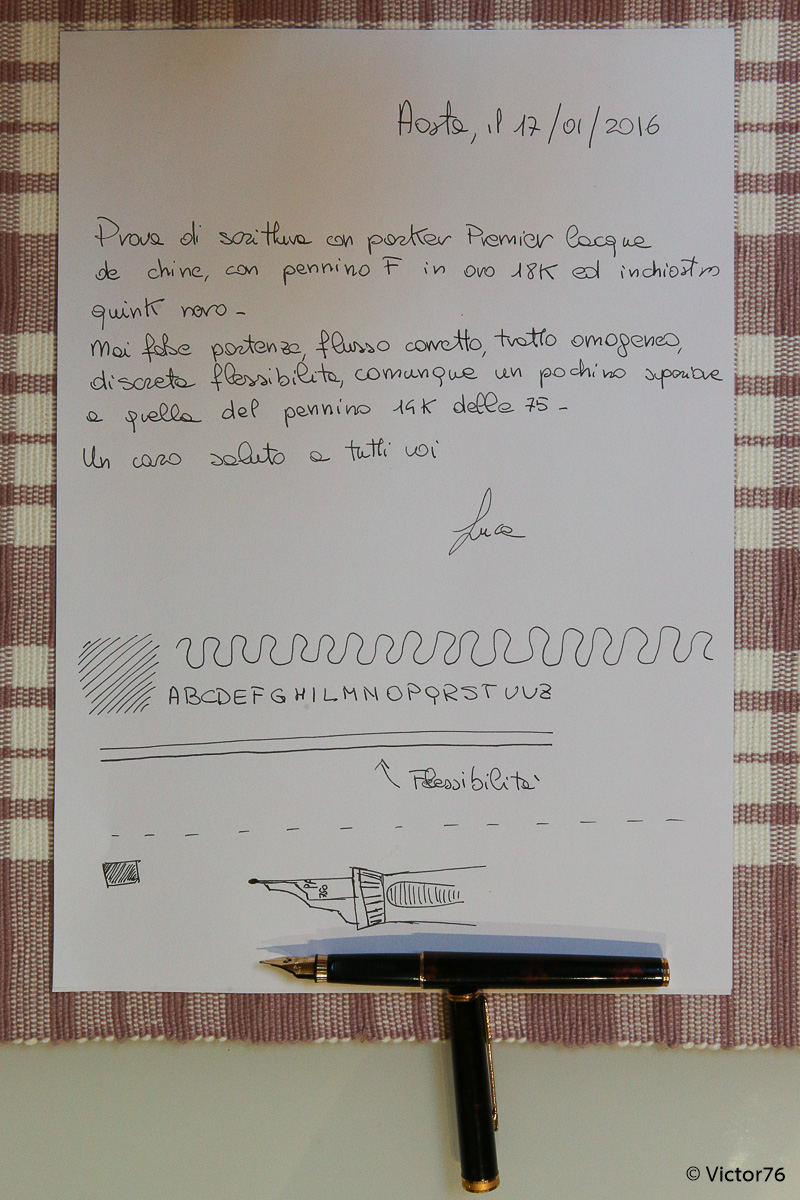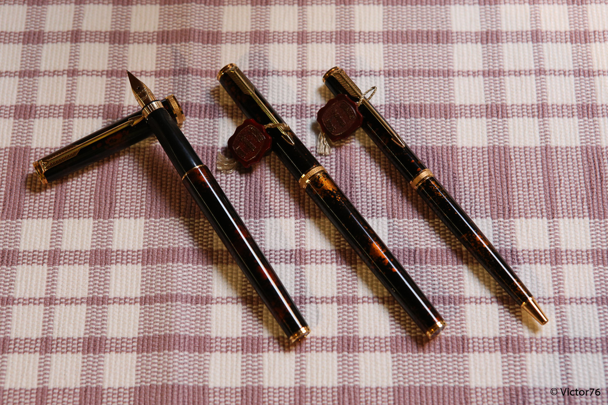 Questa penna è stata costruita in Francia, tra il 1983 ed il 1992, appunto come derivato della 75. Rispetto a quest'ultima, con la quale condivide il pennino delle ultime serie a 18k, Voleva essere una versione executive, un po' più importante, del grande cavallo di battaglia. Un secondo tentativo, dopo la meno riuscita 85. Rispetto alla 85 la premier si discostava meno dalla 75, mantenendo una impugnatura un po' più lunga ma molto simile, con gli incavi per la corretta posizione delle dita, oltre che il pennino orientabile. Rispetto alla 75 fu proposta in un numero molto minore di finiture, tra cui la classica Cisélé, la graine d'orge, alcune in oro massiccio e poi questa lacque de chine a foglia d'oro, di color visone. La finitura è piuttosto particolare e consente di vedere tra le trasparenze della lacca gli strati d'oro sottostanti. Ed infatti se confrontate i due esemplari di stilo e la biro, potete chiaramente capire che non ve ne siano due uguali.