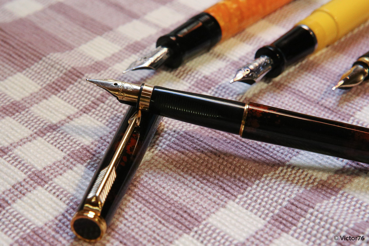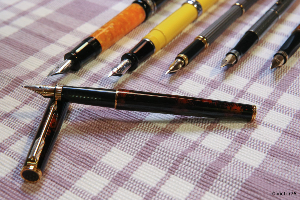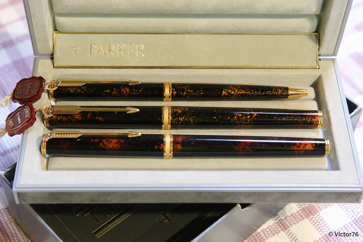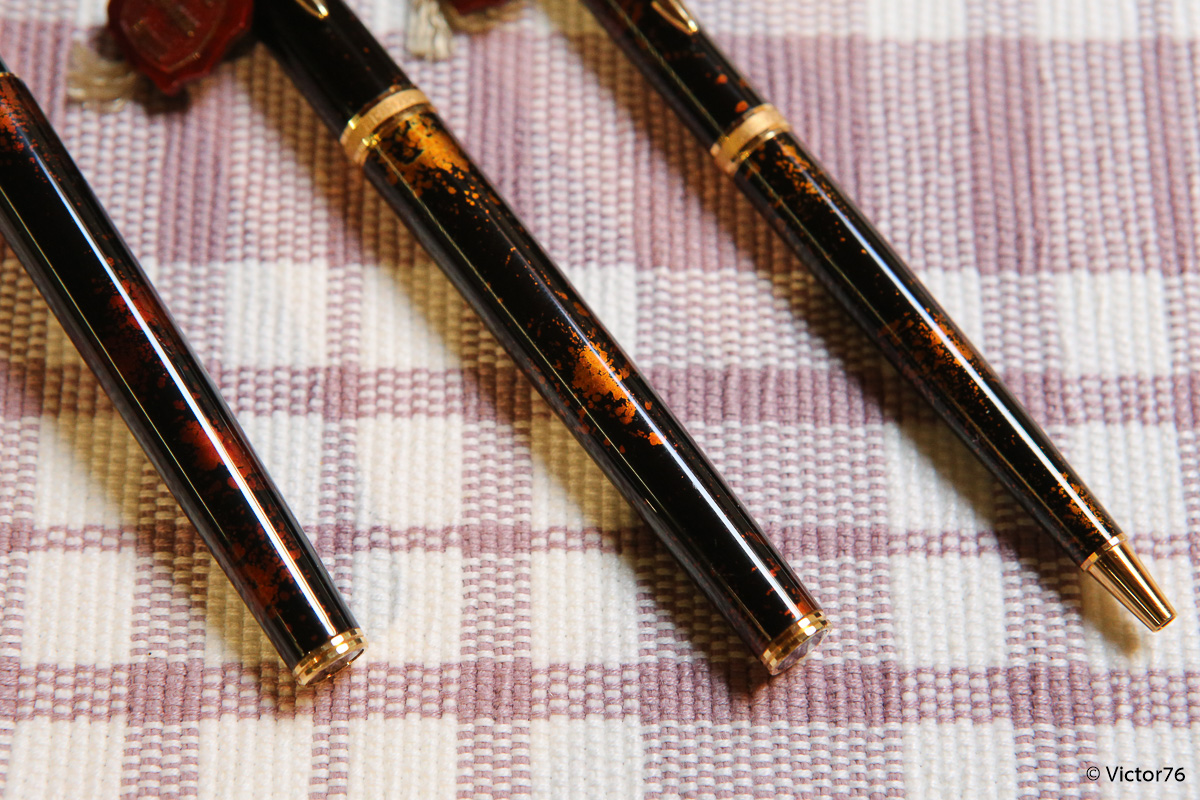 Questa penna è stata costruita in Francia, tra il 1983 ed il 1992, appunto come derivato della 75. Rispetto a quest'ultima, con la quale condivide il pennino delle ultime serie a 18k, Voleva essere una versione executive, un po' più importante, del grande cavallo di battaglia. Un secondo tentativo, dopo la meno riuscita 85. Rispetto alla 85 la premier si discostava meno dalla 75, mantenendo una impugnatura un po' più lunga ma molto simile, con gli incavi per la corretta posizione delle dita, oltre che il pennino orientabile. Rispetto alla 75 fu proposta in un numero molto minore di finiture, tra cui la classica Cisélé, la graine d'orge, alcune in oro massiccio e poi questa lacque de chine a foglia d'oro, di color visone. La finitura è piuttosto particolare e consente di vedere tra le trasparenze della lacca gli strati d'oro sottostanti. Ed infatti se confrontate i due esemplari di stilo e la biro, potete chiaramente capire che non ve ne siano due uguali.