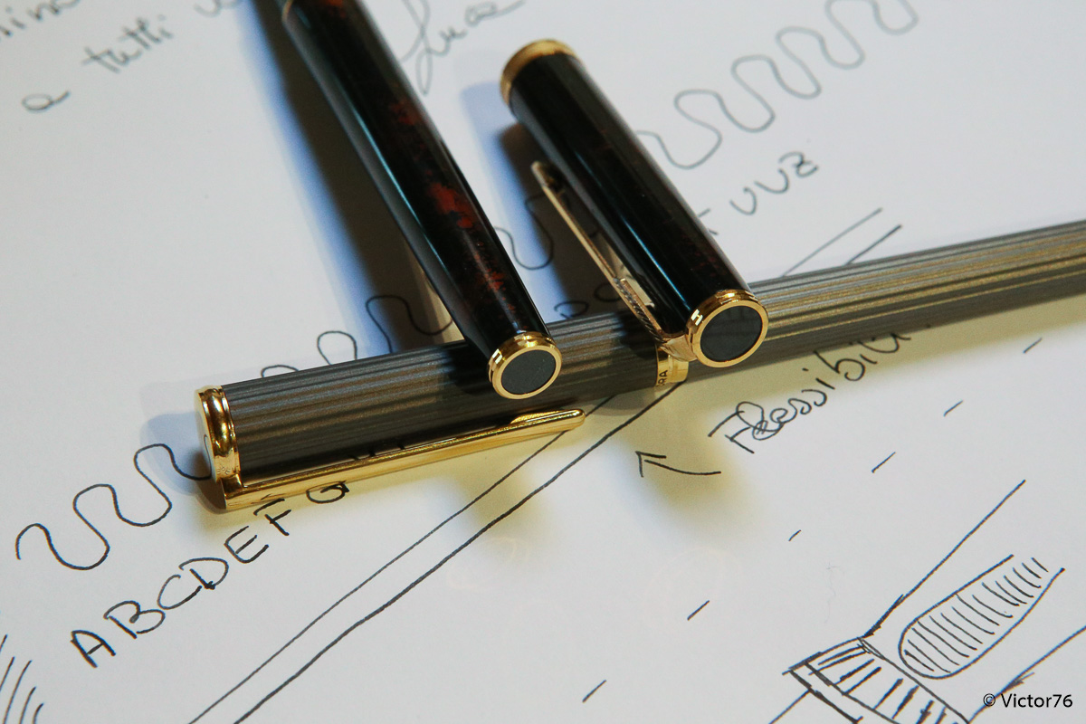 La lacca è piuttosto robusta. L'esemplare in uso (quello senza cordino) é sottoposto ad una utilizzo attento ma piuttosto frequente. Il tappo è tolto e messo spesso, eppure la lacca non ha nessun segno. Il tappo calza precisissimo a pressione e rimane ben fermo. Alle estremità è inserito un gioiello nero, anch'esso lucido. La finitura visone è molto anni '80, molto calda, chiaramente pregiata ma non urlata. Il punto debole di questo oggetto, qualitativamente parlando, è il non aver approfittato, proponendo il nuovo modello, di reinserire l'avvitamento metallo su metallo. L'impugnatura di plastica infatti continua ad avvitarsi sul fusto metallico.