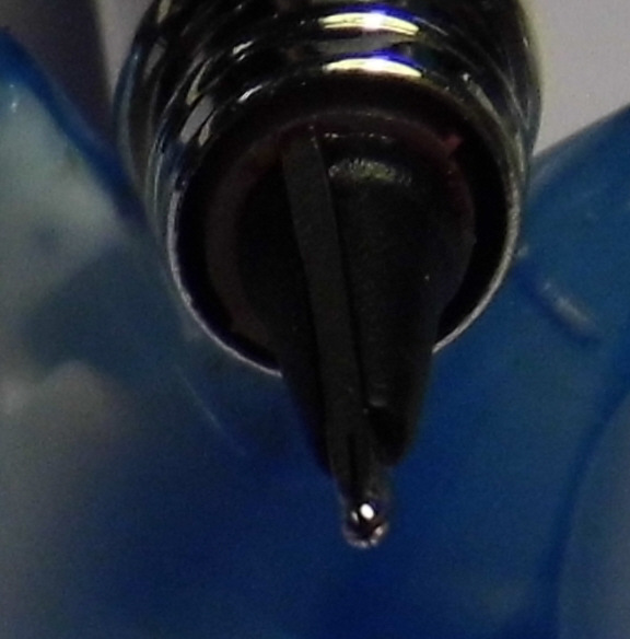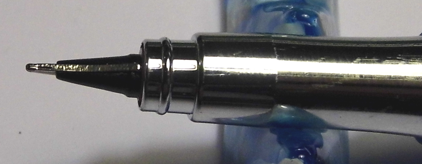 La parte terminale dell'alimentatore che nei pennini 'normali' è sotto la punta, in questa penna è sdoppiato e si trova sia 'sopra' che 'sotto' il pennino come a formare un sandwich come appunto detto nella recensione.