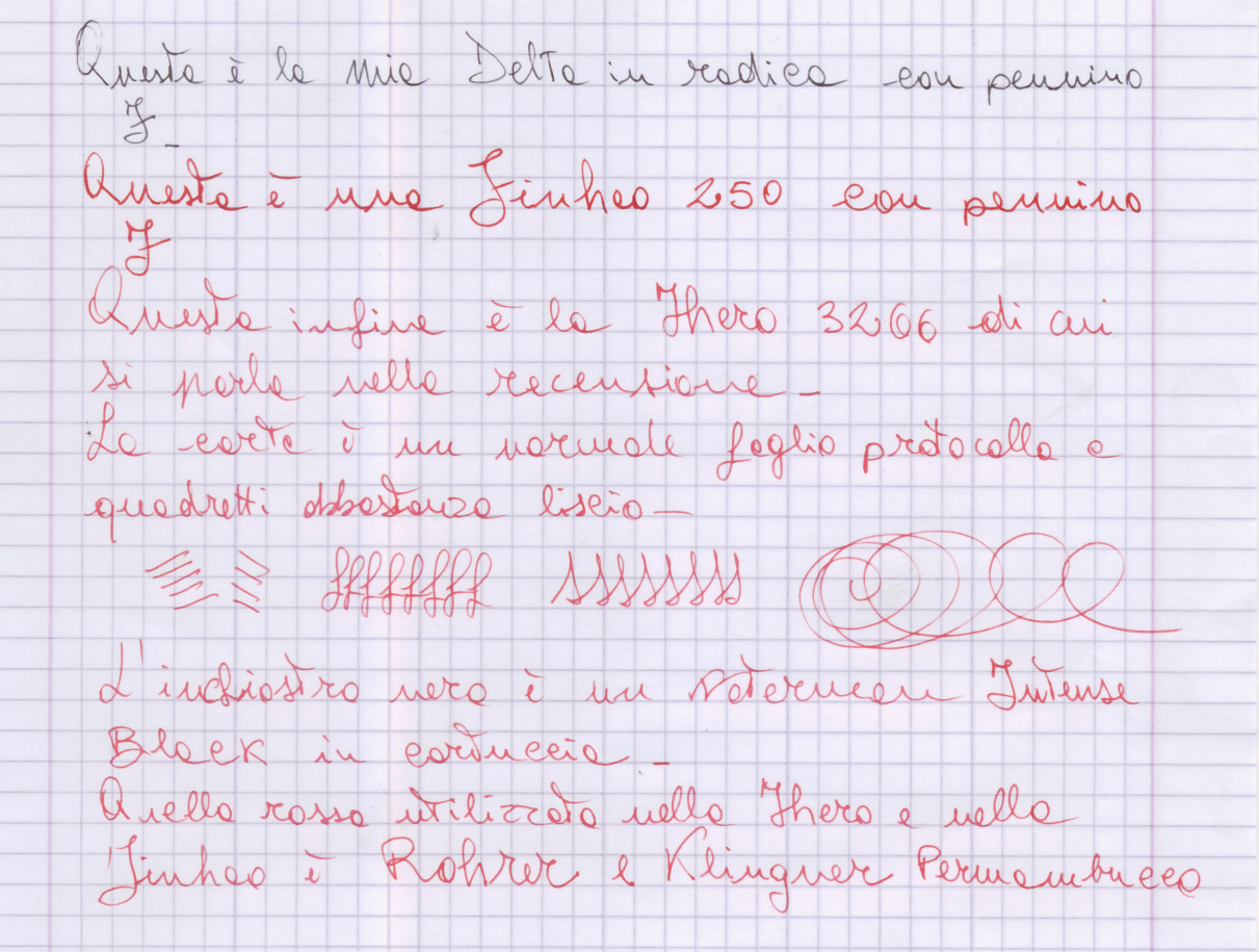 Il caricamento avviene con un sistema tipo aerometric (il Fountainpen.it Wiki recita: pressione di un sacchetto di gomma da effettuarsi da una apertura laterale sul cilindro metallico che contiene lo stesso a cui si accede svitando dalla sezione pennino il corpo della penna) sebbene su questa penna non sia presente lo sfiatatoio (tipico nella aerometric). La struttura metallica contenente il sacchetto è rimovibile mentre lo stesso è fisso e, quindi, non può essere sostituito da un converter o da una cartuccia. Il sacchetto è molto sottile, pertanto contiene poco inchiostro ed inoltre è difficile riempirlo completamente anche premendo più e più volte. Ne consegue che l’autonomia è piuttosto limitata. Dicevamo che il pennino è un F. Inizialmente è stato necessario premere un po’ per iniziare la scrittura, ma poi non ha avuto problemi. Scrive effettivamente in tutte le posizioni nel senso che impugnando la penna per la scrittura e facendola girare in modo da appoggiare ogni volta un lato diverso del pennino, scrive sempre, con la stessa dimensione del tratto. Ciò è dovuto anche alla pallina di iridio (non ho la possibilità di accertare che sia veramente questo il metallo usato) che ricopre ogni lato dei rebbi. Non ci sono state impuntature né ritardi nel tracciare i segni, ma la sensazione che si ricava nella scrittura non mi ha dato molta soddisfazione. Questa della sensazione di scrittura però, come sapete, spesso non ha niente a che vedere con l’effettiva capacità di una penna di scrivere bene.