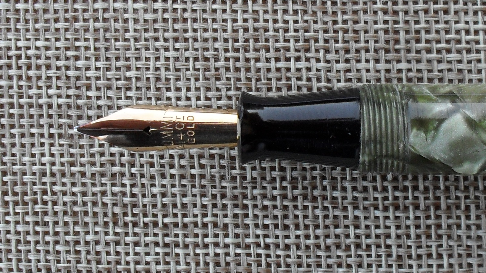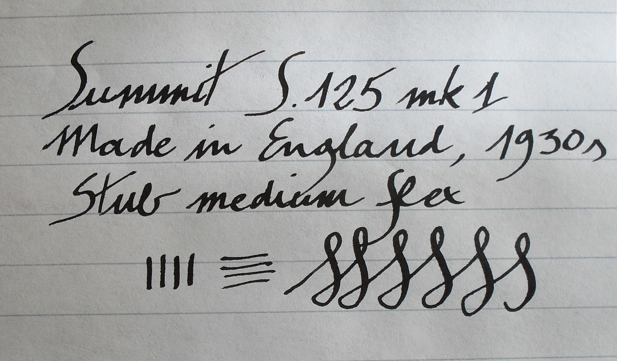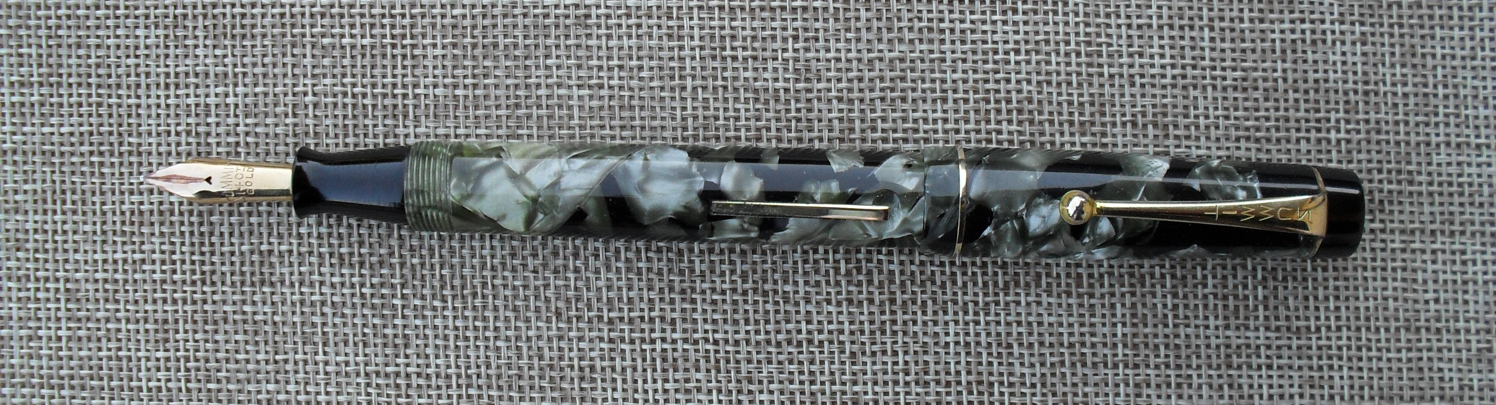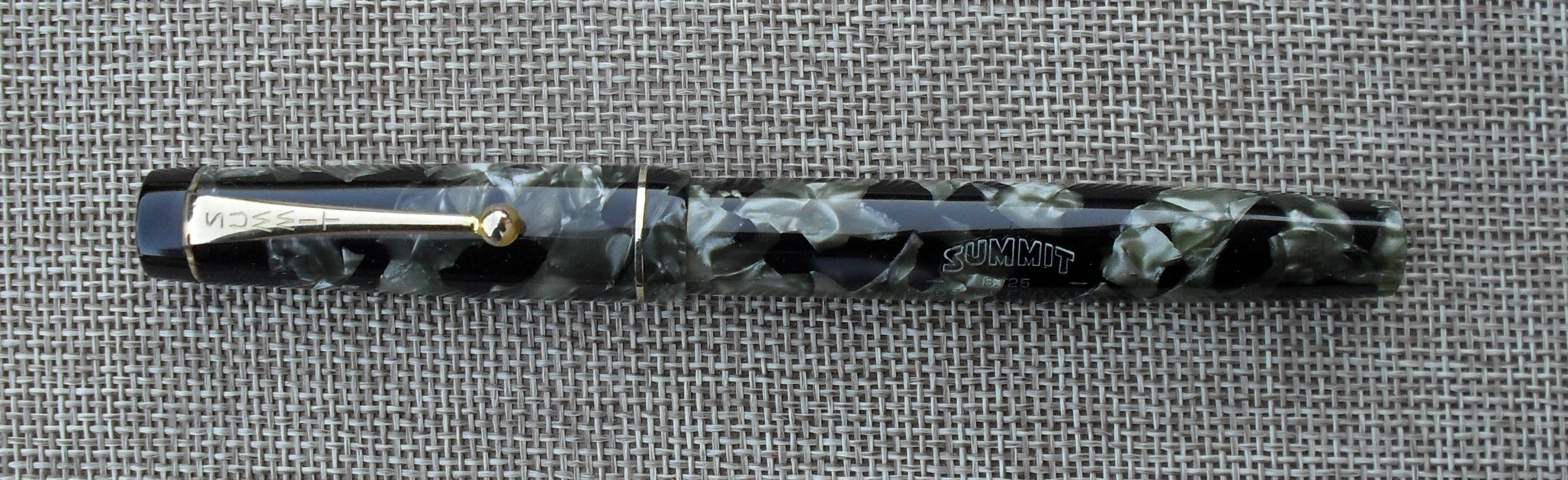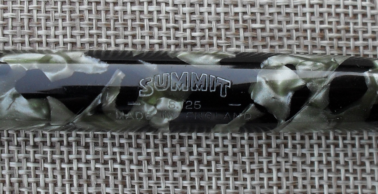 E’ il caso della stilografica che vedete, una Summit S.125 mk 1 degli anni Trenta, in celluloide marmorizzata verde e nera, con pennino in oro a 14 carati, alimentatore e testa del cappuccio in ebanite e sistema di caricamento a levetta laterale. La sigla “Mk 1”, che sta per “versione 1”, distingue questa versione dalla successiva, commercializzata dopo la seconda guerra mondiale; non è ancora chiaro se fosse utilizzata ufficialmente dalla casa produttrice ma per ovvie ragioni non è riportata sulla penna, che reca sul fusto, secondo il tipico stile Summit di quegli anni, la scritta su tre livelli “Summit - S.125 - made in England”. Il modello 125 era per così dire quello mediano nel catalogo Summit e si distingueva dagli altri soprattutto in funzione della misura del pennino, più grande di quello della S. 100 ma più piccolo, almeno dopo il 1935, di quello della S.175. A parte questo aspetto, la qualità era la medesima per tutti i modelli. Ai miei occhi, la celluloide di questo esemplare è spettacolare, con riflessi davvero ammalianti e di un colore perfettamente adatto anche all’uso maschile.