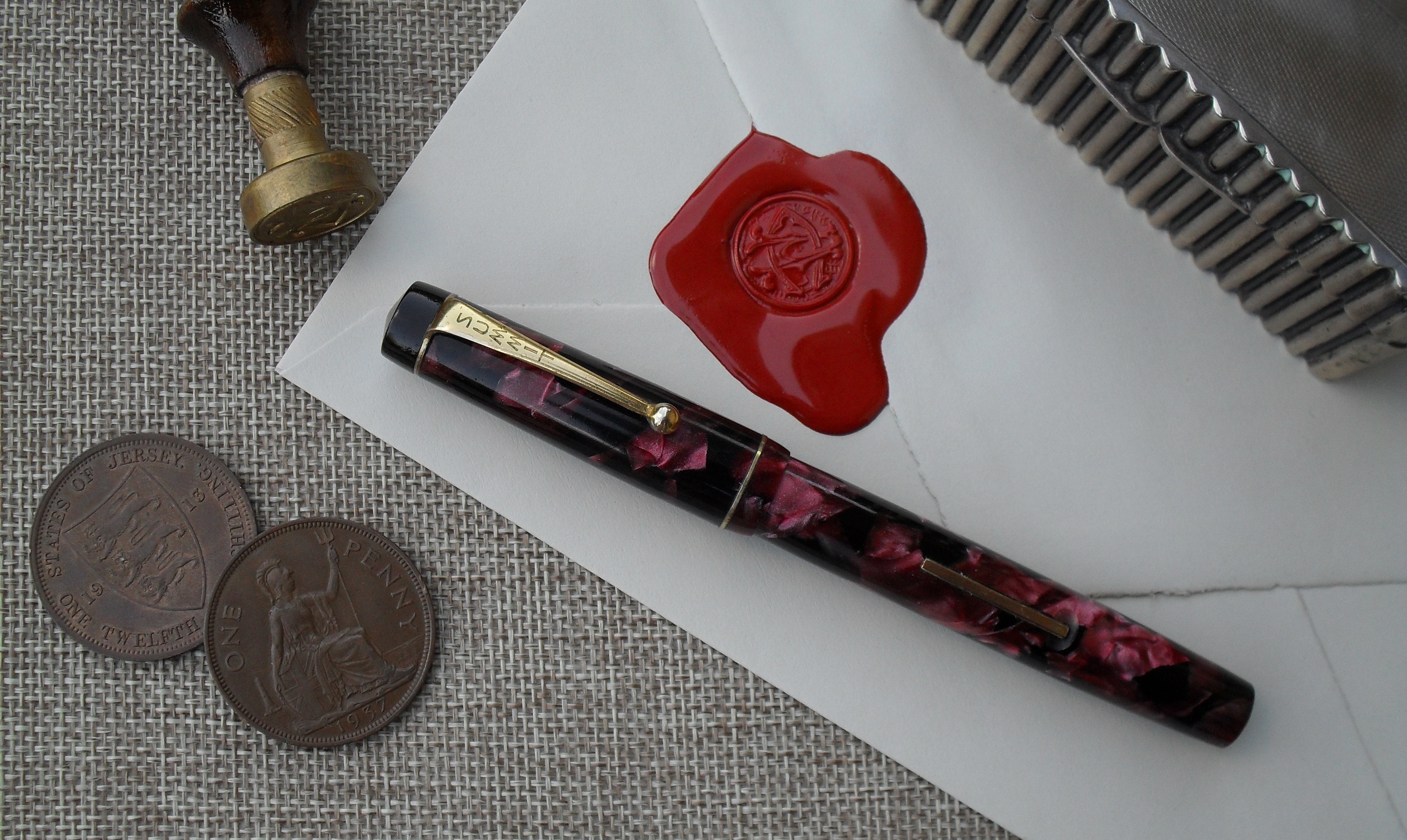 Nonostante il nero mantenesse comunque una netta supremazia sul mercato britannico, grazie alla serietà ed all’eleganza che gli sono proprie, negli anni Trenta le stilografiche colorate guadagnarono una buona fetta di mercato; sono dunque certamente significative dal punto di vista storico e quando un restauratore inglese mi ha proposto questa penna, non ho certo potuto rifiutare! Eccone le caratteristiche tecniche principali: