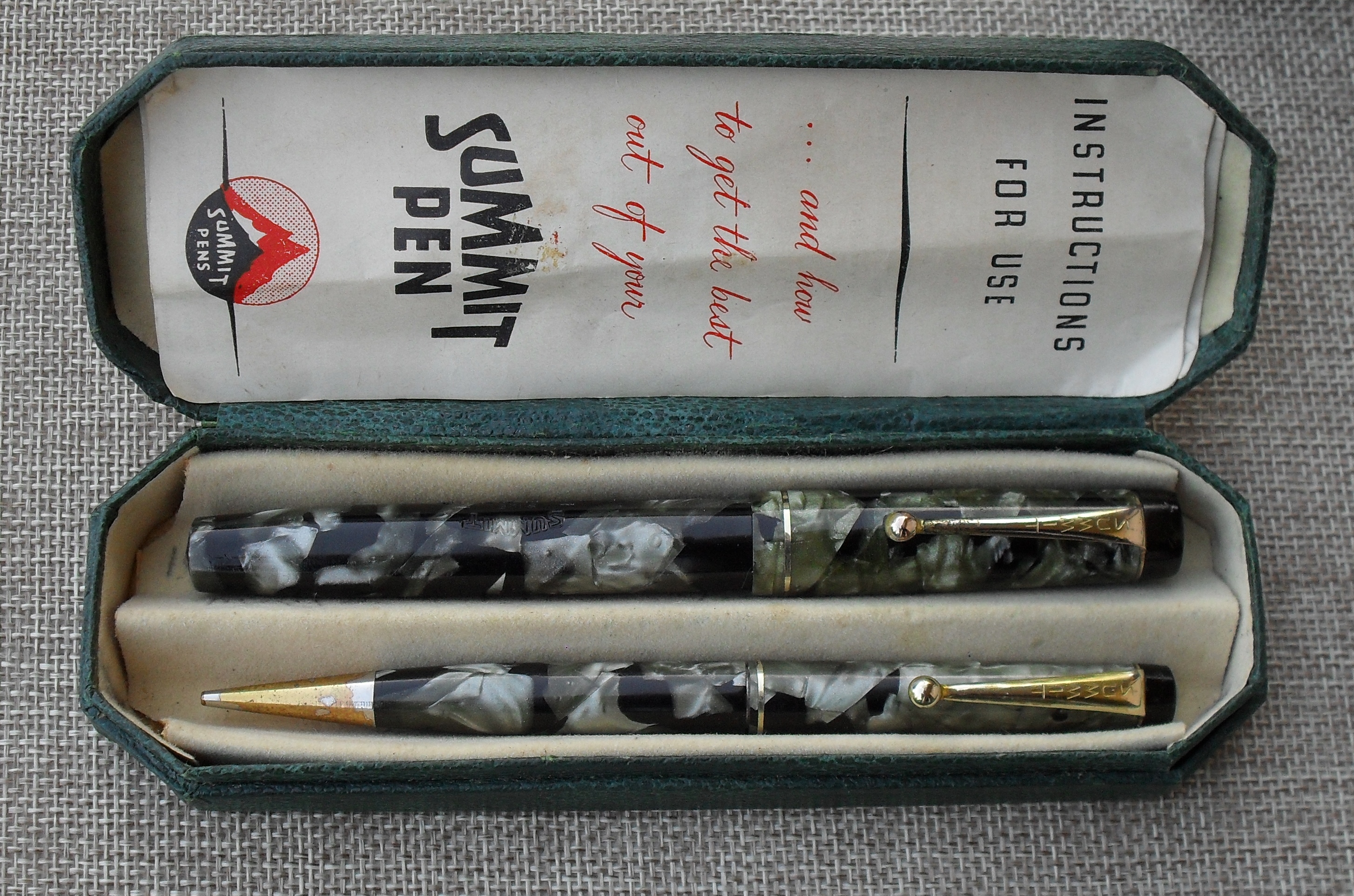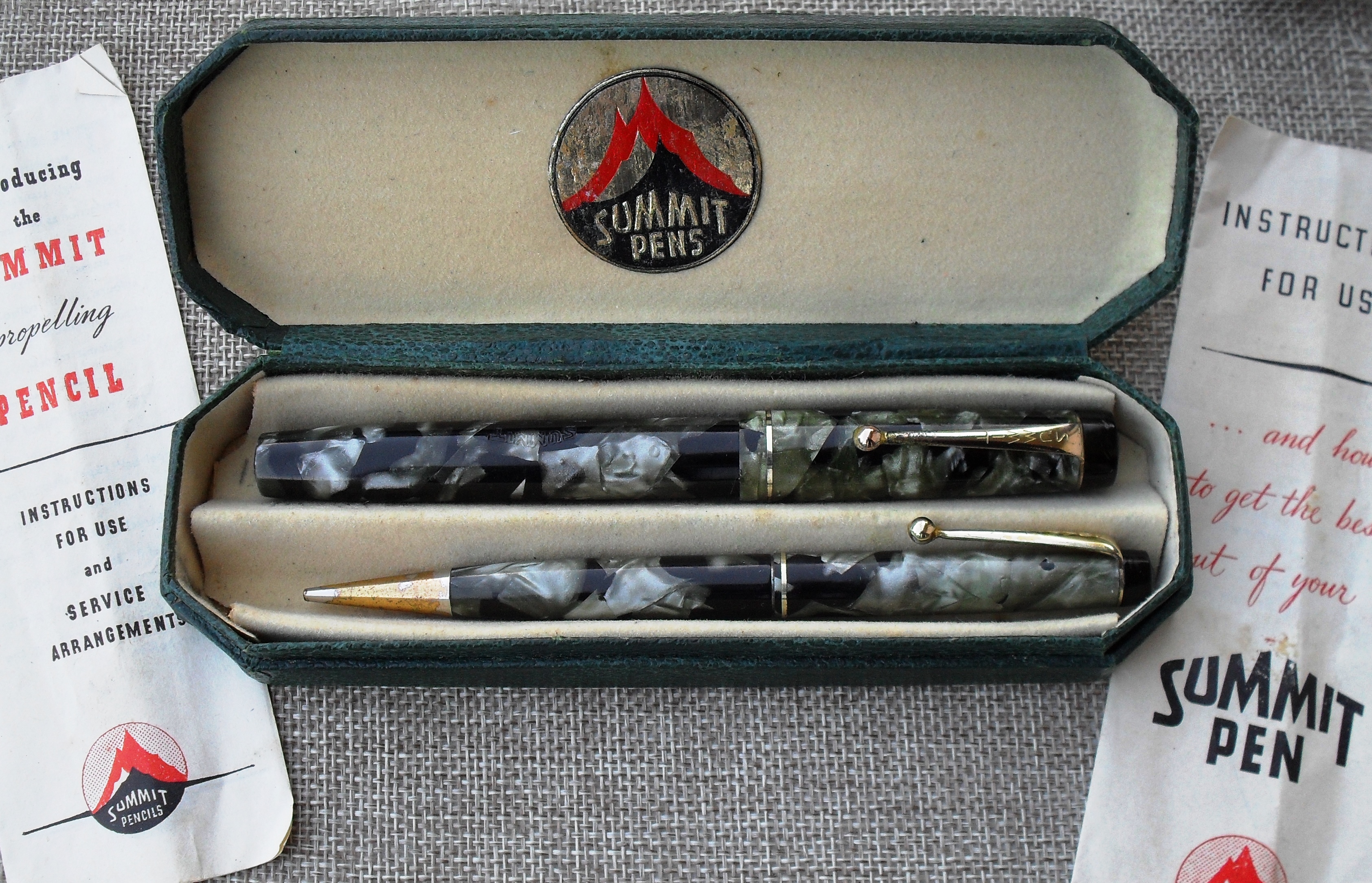 Sempre sul tema Summit S.125, forse potrà interessare anche qualche immagine di un bel set, composto da stilografica e matita meccanica, completo di scatola ed istruzioni originali. Ho avuto la fortuna di acquistarlo ad un prezzo davvero molto basso ed anche se i due strumenti di scrittura mostrano evidentemente i segni di un uso prolungato, anche se amorevole, il set mantiene, a mio parere, tutto il suo valore storico.
