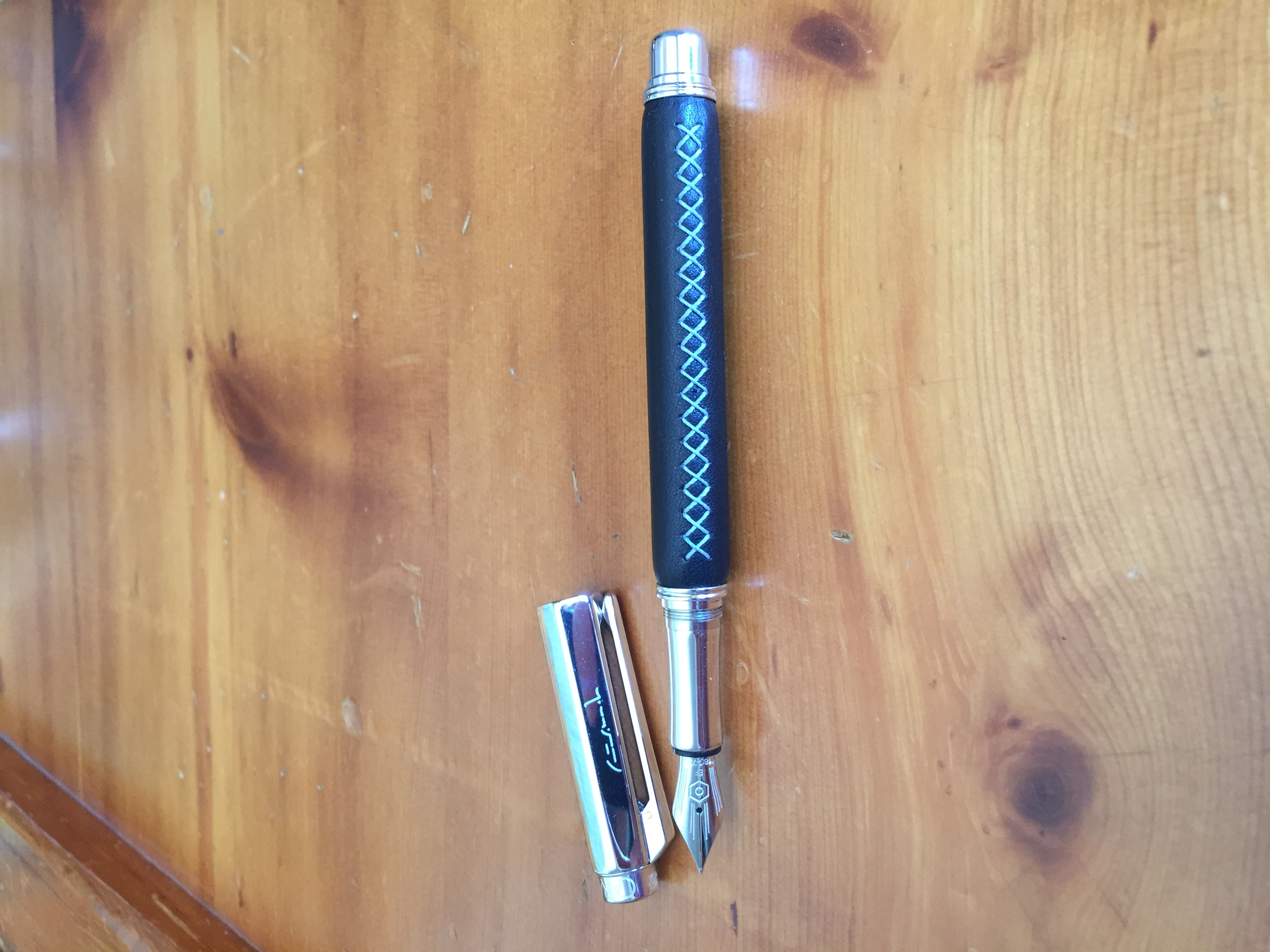 Corpo rivestito di una bella pelle nera pennino in oro bianco EF non l’ho ancora inchiostrata per il momento caricamento con cartucceo con un ottimo converter