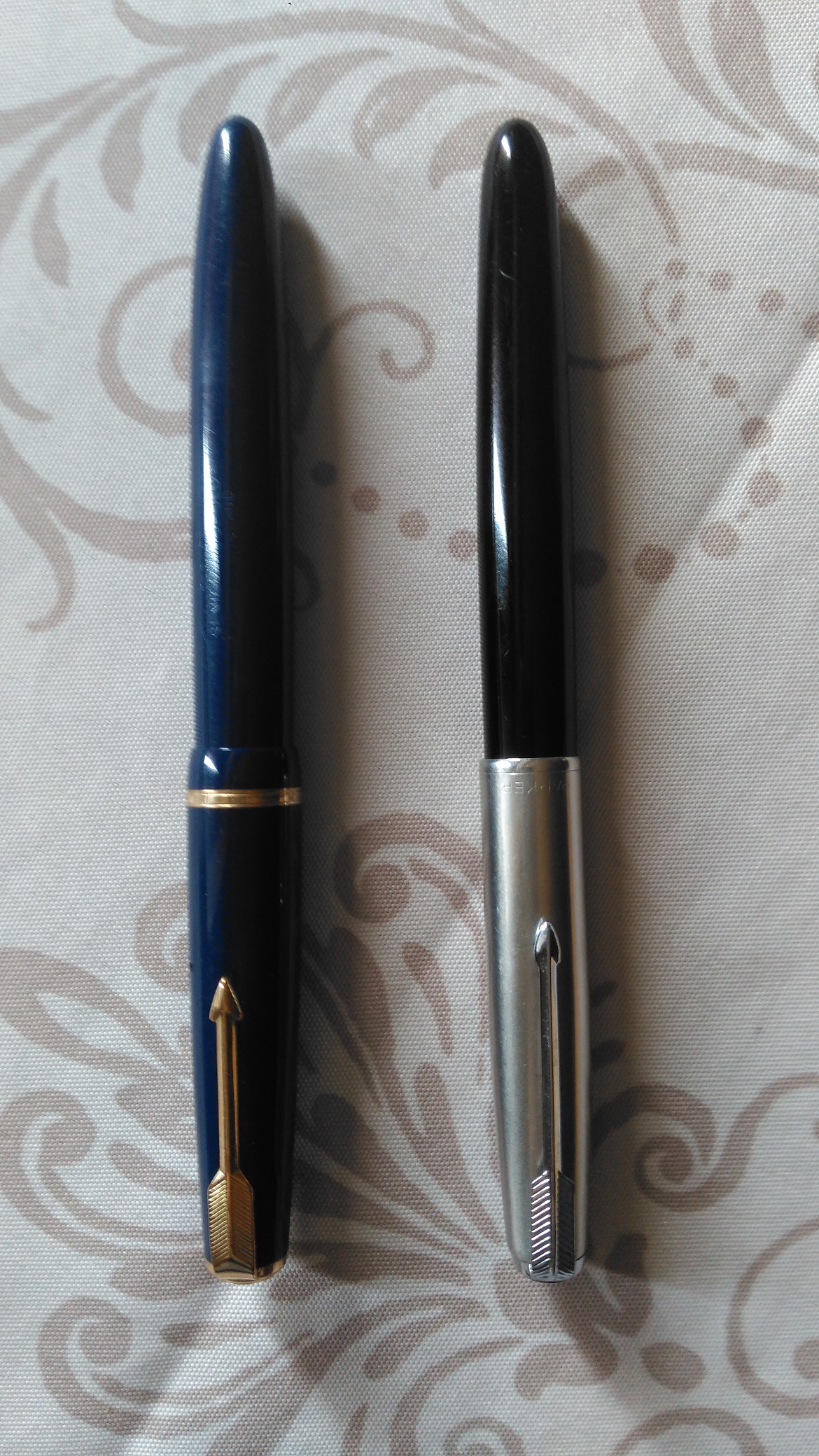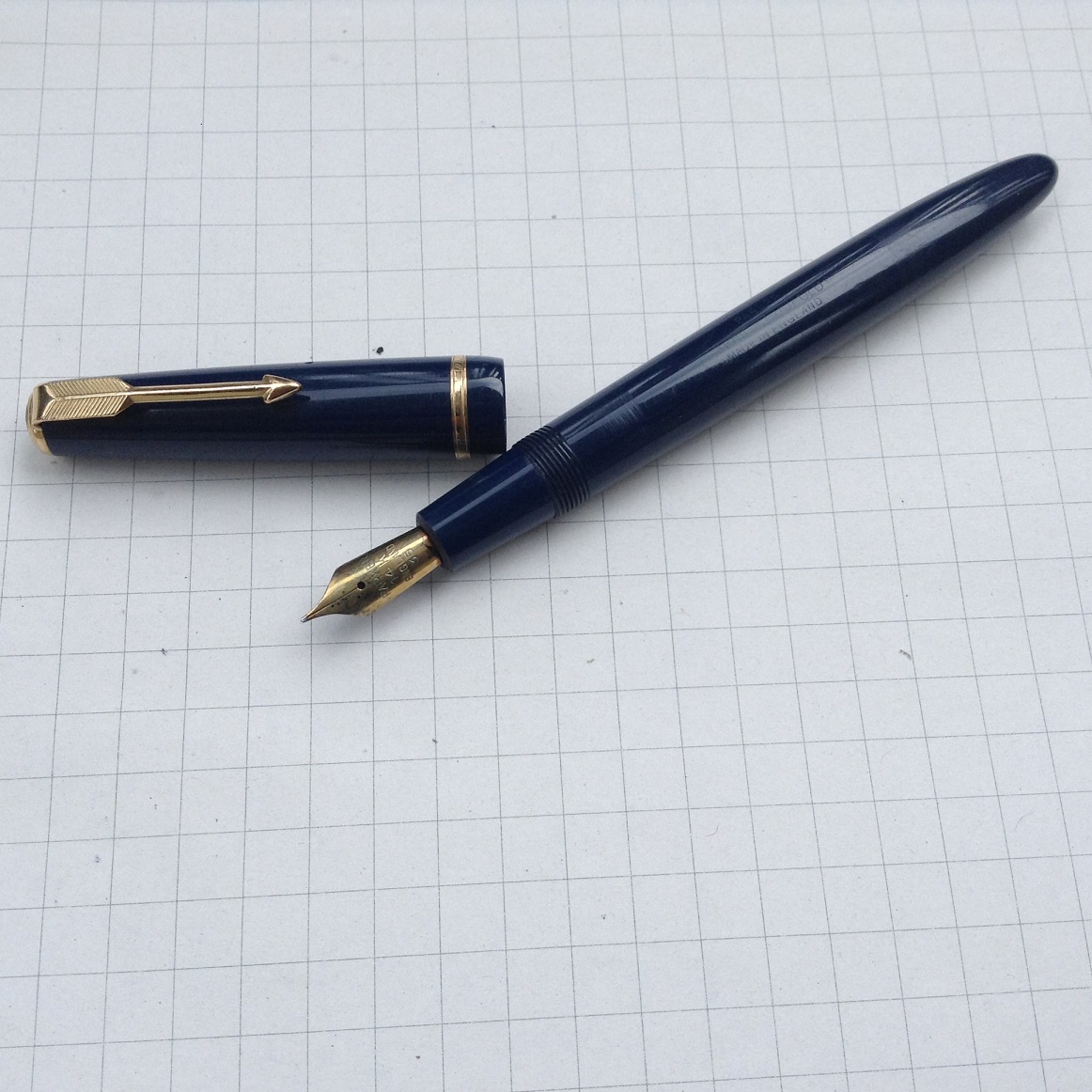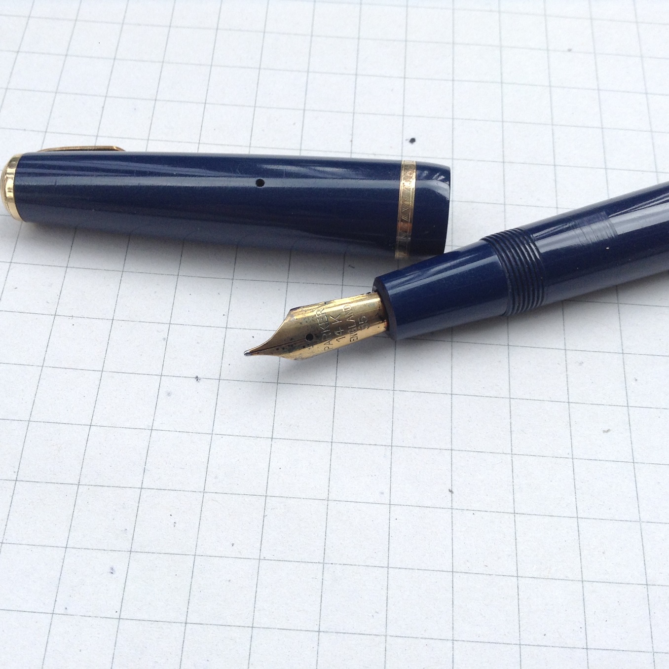 Si tratta di una stilografica disegnata e prodotta in Gran Bretagna a partire dagli ultimi anni 40. Lo stile é molto diverso rispetto alla Duofold classica, prima di tutto per la forma del corpo penna e del cappuccio, che a me ricordano quelle della Vacumatic.