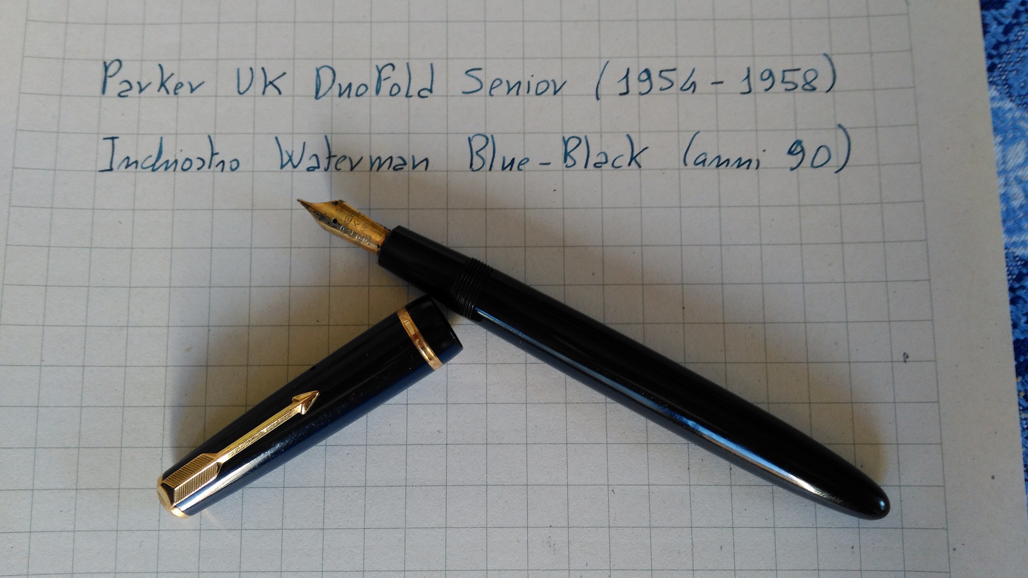 La stilografica in mio possesso é una Parker UK New Duofold, modello Senior. E' probabile che sia stata prodotta tra il 1955 e il 1958. Il mod. Senior fu commercializzato a partire dal 1954, ma da alcuni dettagli é a mio parere probabile che questa stilo non sia stata tra le prime prodotte.