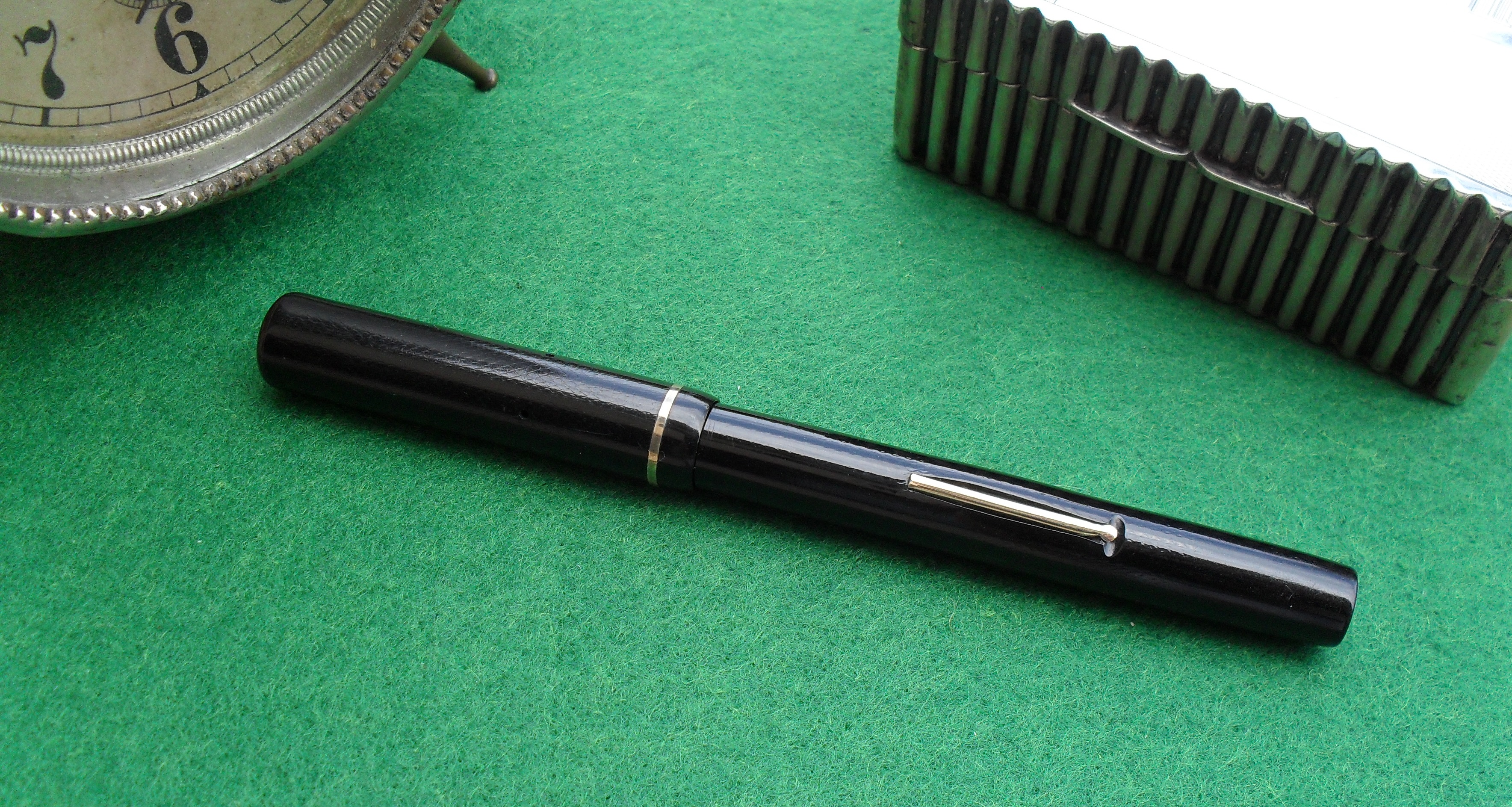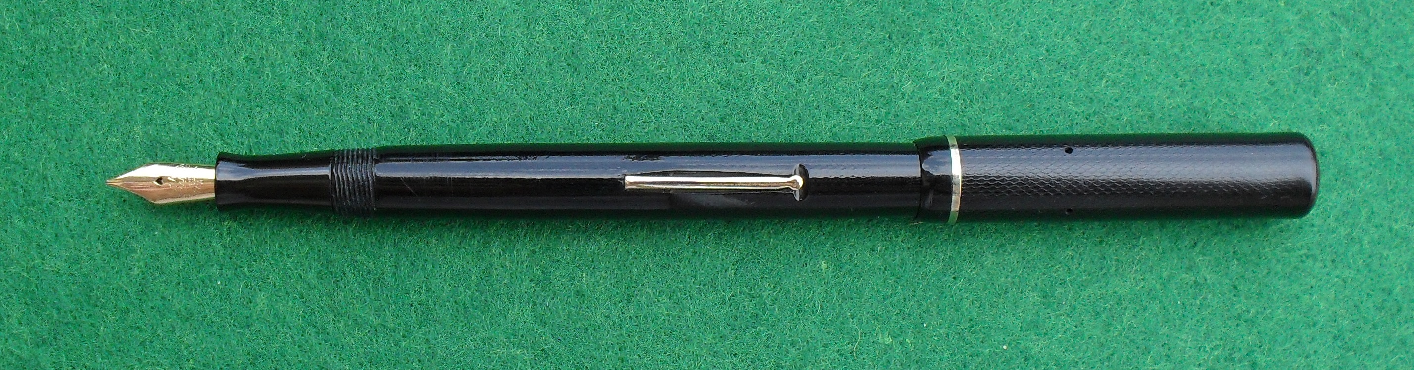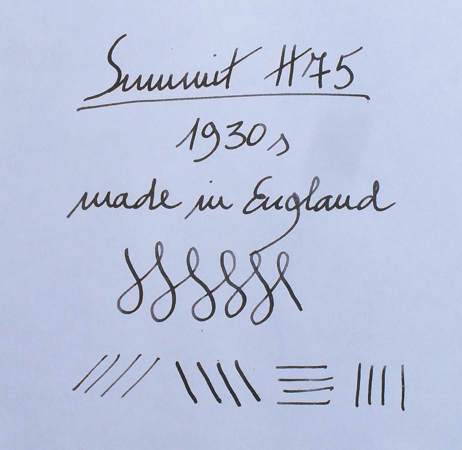 Questo il quadro di alcuni degli avvenimenti salienti del periodo nel quale il gruppo Lang / Curzons introdusse il marchio Summit, destinato a diventare uno dei più conosciuti nel Regno Unito fra le due guerre. La prima serie che rese famoso il marchio fu la “H”, nell’ambito della quale spiccarono i modelli 75 e 100. Ed appunto una H.75 è la penna che vedete. Si tratta di una stilografica molto sobria ed elegante, in celluloide cesellata nera, con testa del cappuccio ed alimentatore in ebanite, pennino d’oro a 14 carati e finiture dorate.