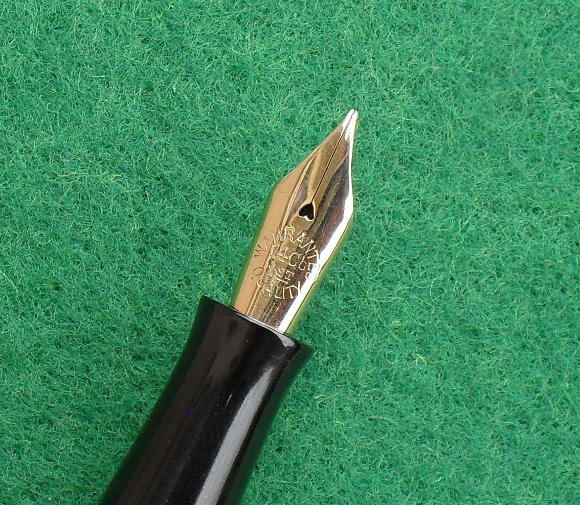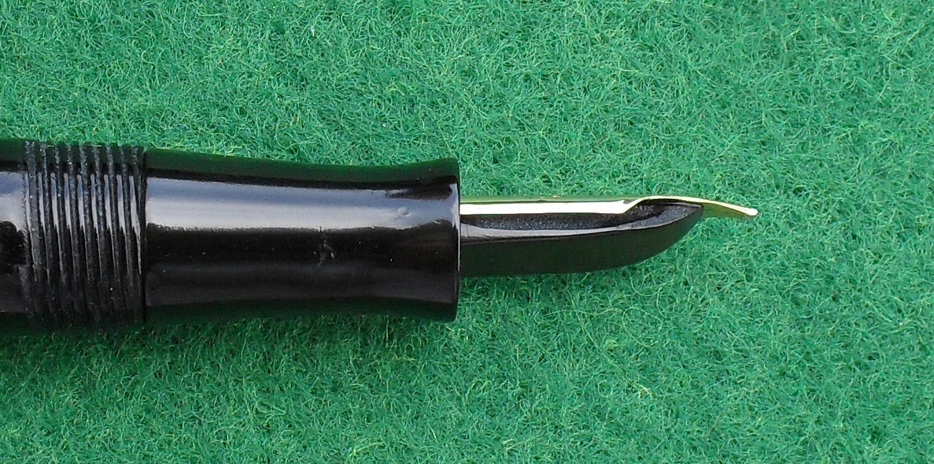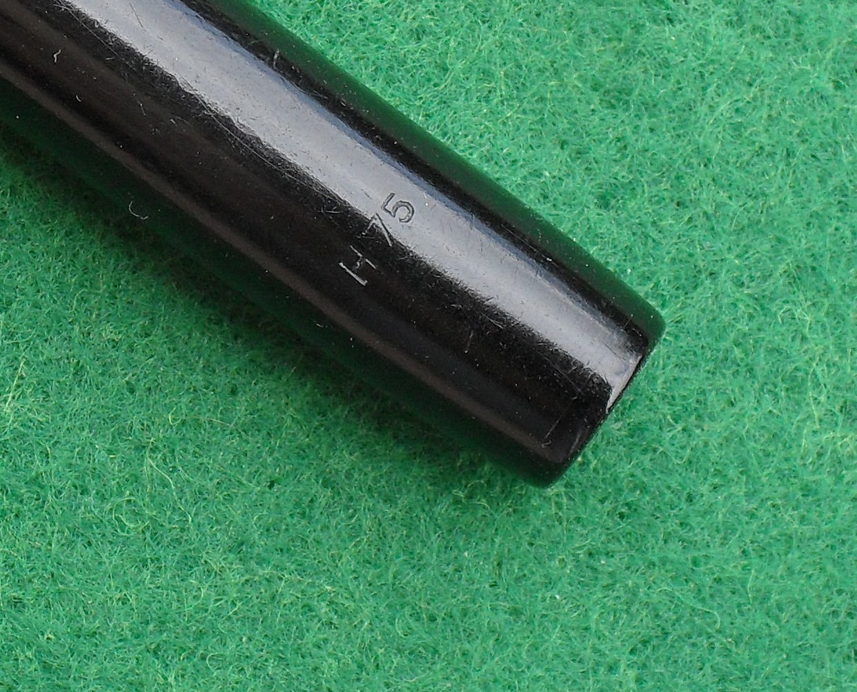 Il pennino è un ottimo “warranted” di produzione Lang, molto utilizzato dal gruppo di Liverpool per un gran numero di modelli almeno fino alla metà degli anni Trenta, quando vennero introdotti pennini di maggiori dimensioni. L'alimentatore, senza alette, è dotato di due selle laterali, parzialmente nascoste dal pennino, che svolgo egregiamente la loro funzione compensatrice. La scrittura si rivela pronta, senza difetti, con un ottimo flusso e molto piacevole, grazie anche alla morbidezza del pennino. La penna è molto confortevole, grazie al bilanciamento, anche a cappuccio calzato, ed alle dimensioni. Il fusto reca l’iscrizione, su due livelli: “London Summit Liverpool – Curzons Ltd”, mentre l’identificazione del modello avviene per mezzo della sigla “H.75”, stampigliata sul fondello. La cesellatura, del classico tipo a chicco d’orzo, è ancora ben evidente anche se un po’ consumata in alcune parti, segno del lungo uso al quale la penna è stata senza dubbio sottoposta ma anche dimostrazione della sua affidabilità e dell’affetto del suo proprietario, confermati anche dalla mancanza di segni particolari che suggeriscano maltrattamenti od incuria.