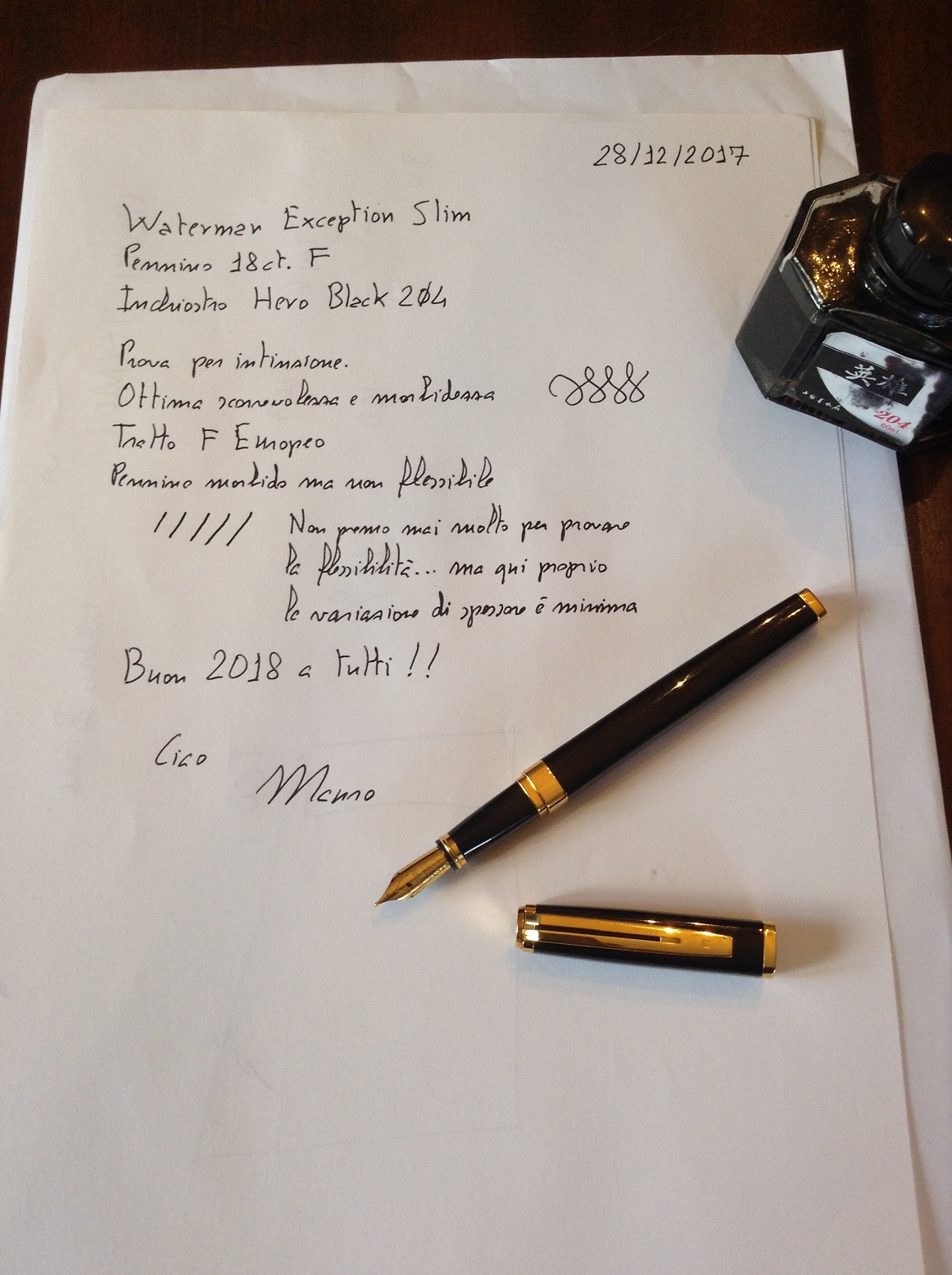 Per quanto riguarda la scrittura, ho provato al momento il pennino solo per intinzione, utilizzando il mio solito inchiostro cinese Hero Black 204. La mia logica perversa é sempre la stessa: se scrive bene con questo inchiostro, allora é veramente una gran penna.... Che poi mi sto affezionando a questo Hero Black, vuoi vedere che in fondo non é poi così male? :shock: