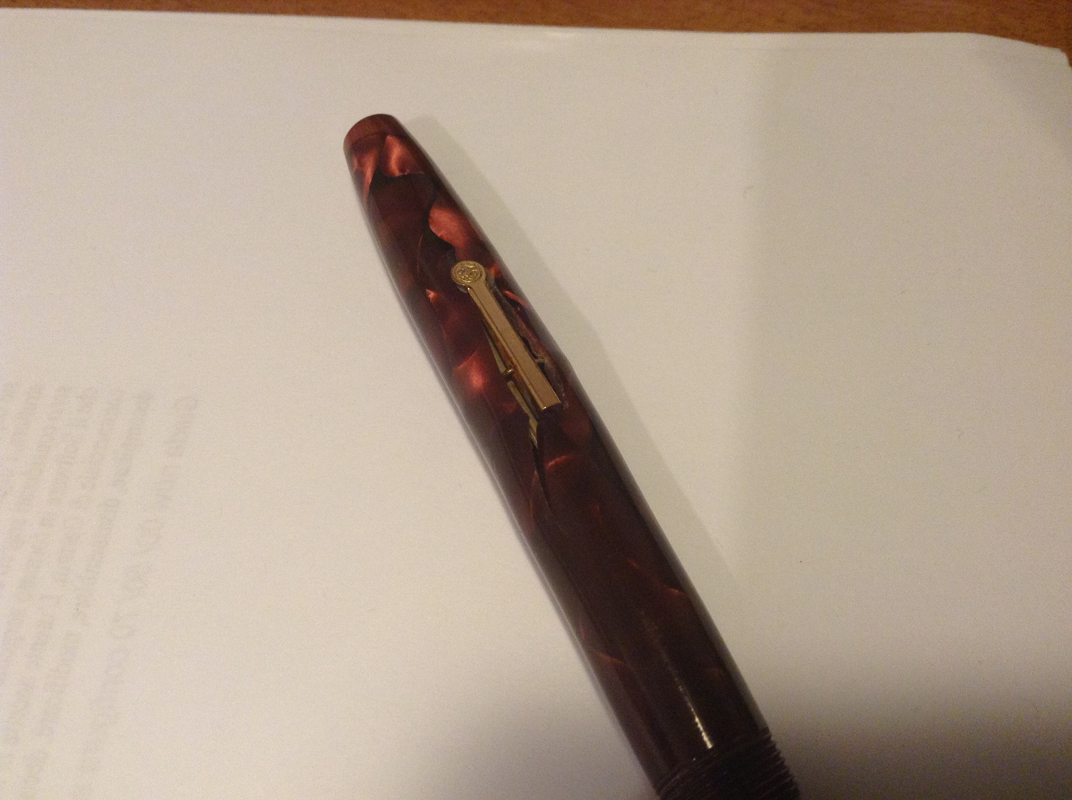 Colto dalla mania di perfezionismo da cui spesso sono affetto, e non dovendo fare in pratica nulla per migliorare l'aspetto estetico perfetto della penna, decisi di provvedere ad una (inutile) pulizia a fondo non solo caricando e scaricando il sacchetto con acqua distillata, ma tenendo il fusto in acqua per una giornata circa. Essendo un povero co.... ehm... ignorante sugli EFFETTI DELETERI DI DEFORMAZIONE che l'acqua causa alla caseina, ho commesso questo scempio.