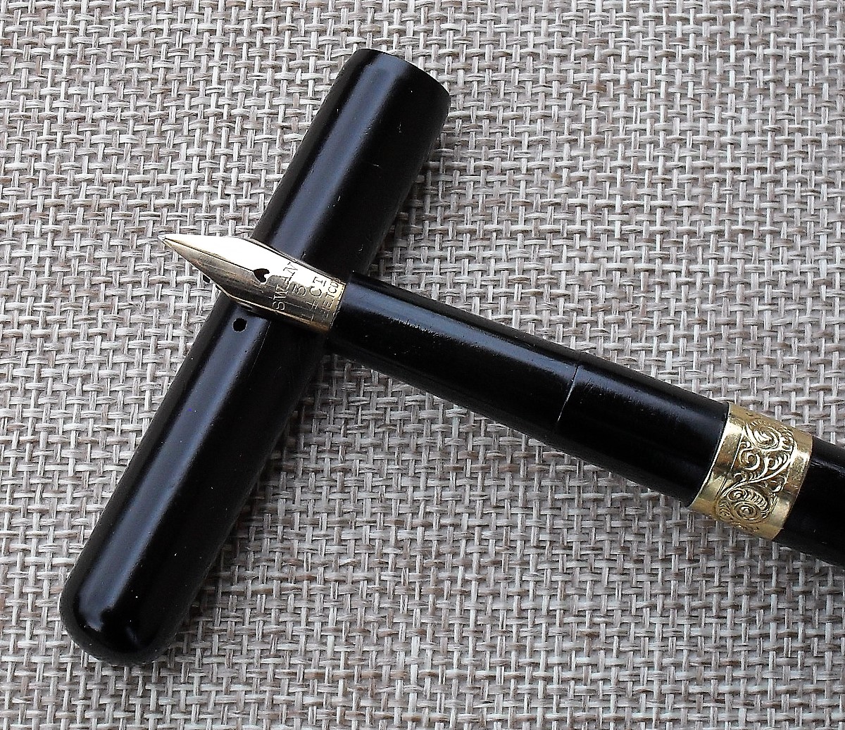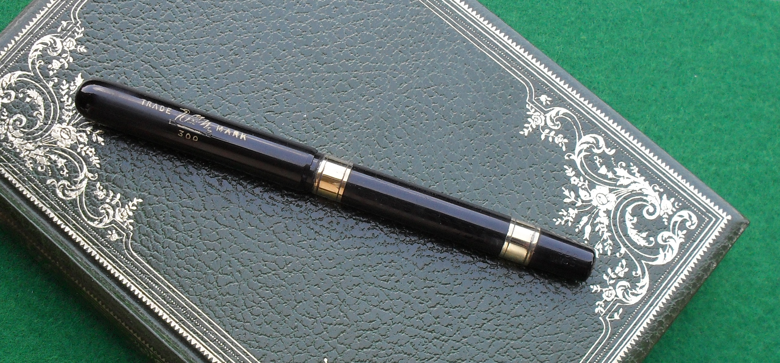 La stilografica che vi presento oggi è una Swan 300 con caricamento a contagocce, prodotta, secondo gli studi di Stephen Hull, Jim Marshall, Laurence Oldfield e Paul Leclerq, fra il 1910 ed il 1920. Si tratta, dunque, di uno strumento di scrittura centenario, ancora in ottima forma, utilizzato senza dubbio per molto tempo, ma con tatto ed attenzione. La particolarità di questa stilografica risiede soprattutto sia nelle due bande d’oro a 18 carati, impreziosite da un piacevole motivo Liberty e caratteristiche della versione di lusso, sia nel pennino, del tipo “Posting”, realizzato per consentire una scrittura veloce, con tratto fine, e che non costringesse all’uso della carta assorbente. La prova di scrittura, realizzata con inchiostro Pelikan 4001 nero, conferma che queste caratteristiche sono ben presenti ancora oggi: L’architettura della stilografica è molto semplice, trattandosi di una “eyedropper”: il corpo funge da serbatoio ed il gruppo si monta avvitandolo. Nonostante l’età, la penna non perde inchiostro neppure quando utilizzata senza particolari accorgimenti e per lungo tempo. Mi ha servito tranquillamente in ufficio per molto tempo.