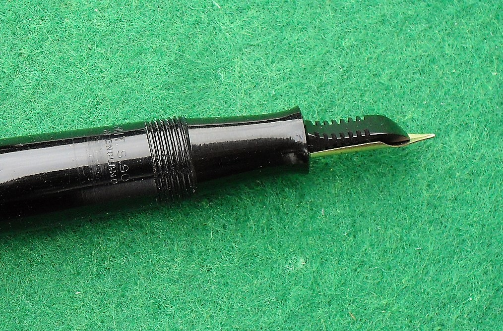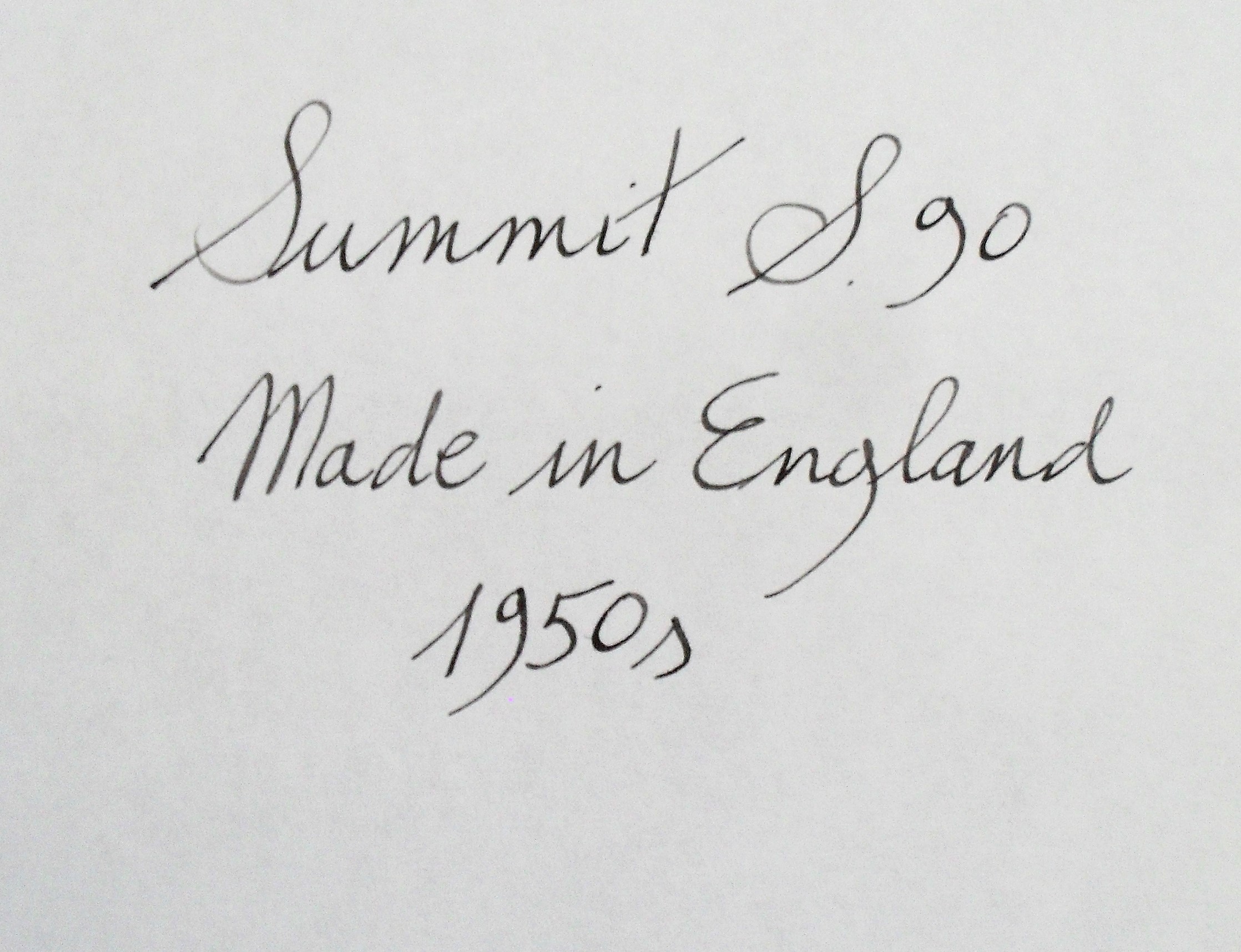 Uno degli aspetti più affascinanti, almeno per me, della storia del marchio Summit riguarda proprio la sua fine. Gli anni cinquanta del XX secolo videro l’affermarsi progressivo della penna a sfera, grazie alla sua praticità. Pur introducendo due modelli di penna a sfera, una volta capito che quest’ultima avrebbe in grandissima parte rimpiazzato la stilografica, invece di cercare di seguire il nuovo trend del mercato Summit e Lang (la società capogruppo che curava direttamente la produzione, dalla materia prima al prodotto finito, pennini inclusi) decisero semplicemente di chiudere i battenti, per non rinunciare alla qualità dei loro prodotti. Lang Co. Ltd era stata fondata nel 1899 e probabilmente la proprietà, sostanzialmente sempre la stessa, decise che l’avventura imprenditoriale era ormai compiuta. Una scelta comunque coraggiosa e saggia, che evitò fini ingloriose, come fallimenti od acquisizioni da parte di altre imprese, e che consentì di mantenere intatto il buon nome delle aziende dello storico gruppo di Liverpool. La stilografica e la matita che vi presento oggi, dopo l'usuale restauro rigidamente conservativo, furono prodotte ed offerte proprio nell’ultimo periodo della storia di Summit. Introdotte nei primissimi anni cinquanta (è certo che fossero a catalogo nel 1953), e naturalmente anche vendute separatamente, S. 90 e P. 90 si rivolgevano al mercato degli utilizzatori medi, alla ricerca di un prodotto affidabile, esteticamente piacevole ma non costoso, adatto ad un impiego intenso e giornaliero. La S.90 adotta un sistema di caricamento che Lang non favorì mai, finendo per equipaggiarne solo due modelli: la S. 170 Crest e, appunto, la S. 90: si tratta della barra di compressione a pulsante di fondo. Come sempre in questi casi, al pulsante si accede svitando il fondello del corpo.