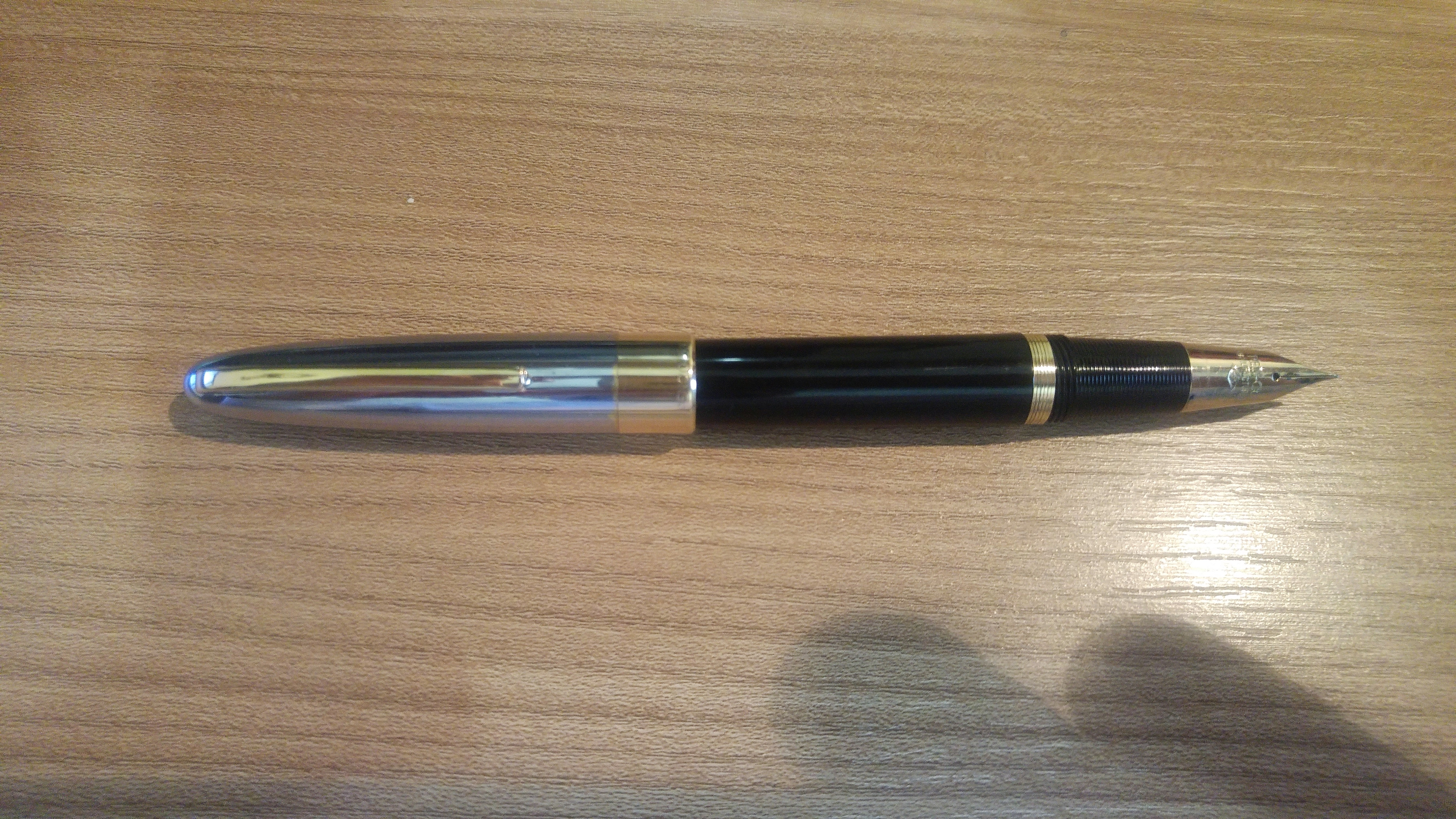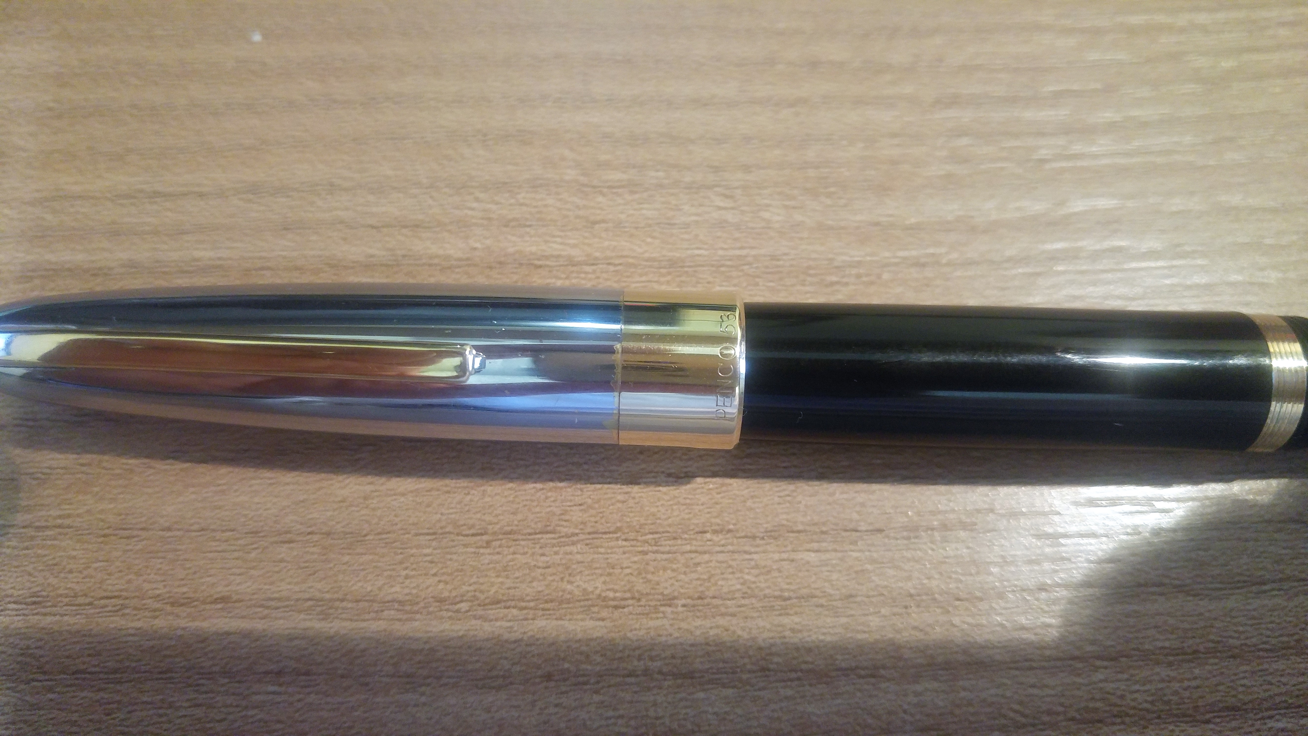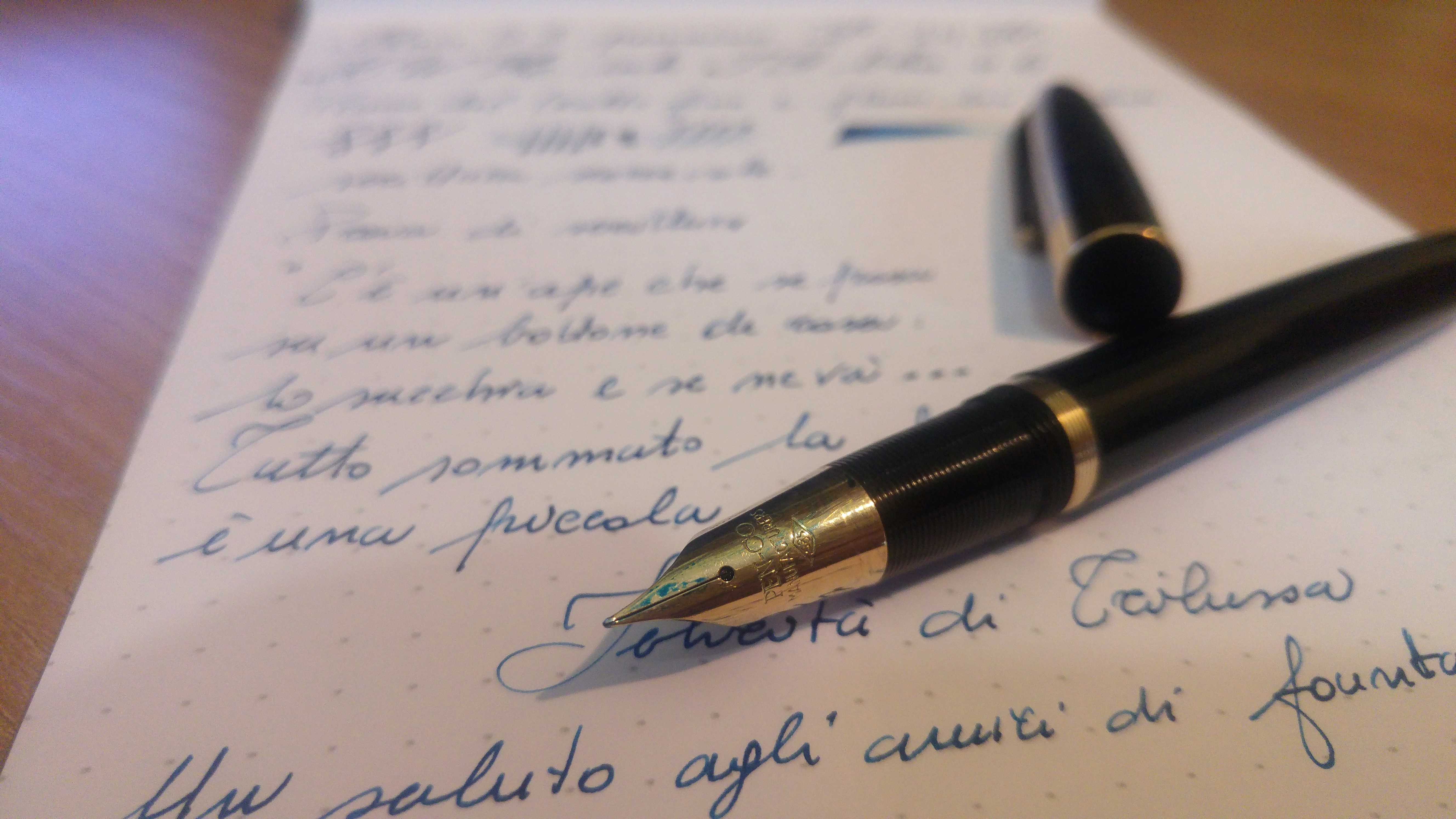 Il mio esemplare è l’ultima serie a pistone ed ha il cappuccio cromato con la banda dorata in basso. La penna è comodissima, con il cappuccio che si rimuove con mezzo giro, si calza comodamente, ben bilanciata sia con che senza cappuccio. Il pennino è duro, ma scorrevole con un bel tratto fino e flusso generoso. Appena tornato a casa le ho dato una lavata, una bella lucidata per togliergli la patina del tempo, che le si era accumulata addosso, ed è tornata subito in carreggiata, a riprove della buona qualità con cui venivano realizzate le 53. Purtroppo ha perso un po' di cromatura sul cappuccio, ma credo che visto i 63 anni di età minimo che ha ci può stare. Non sono un intenditore di vintage, ma sono rimasto molto colpito dalla 53 che mi sta facendo compagnia da diversi giorni caricata con un bel KWZ IG Blue #6. Eccola