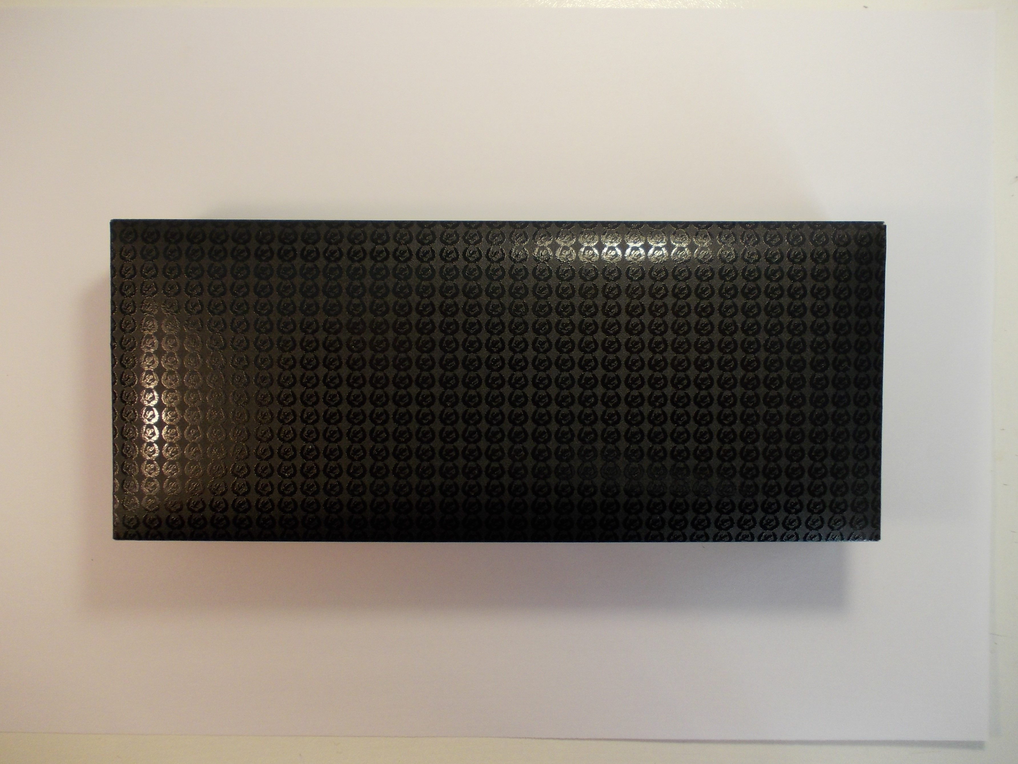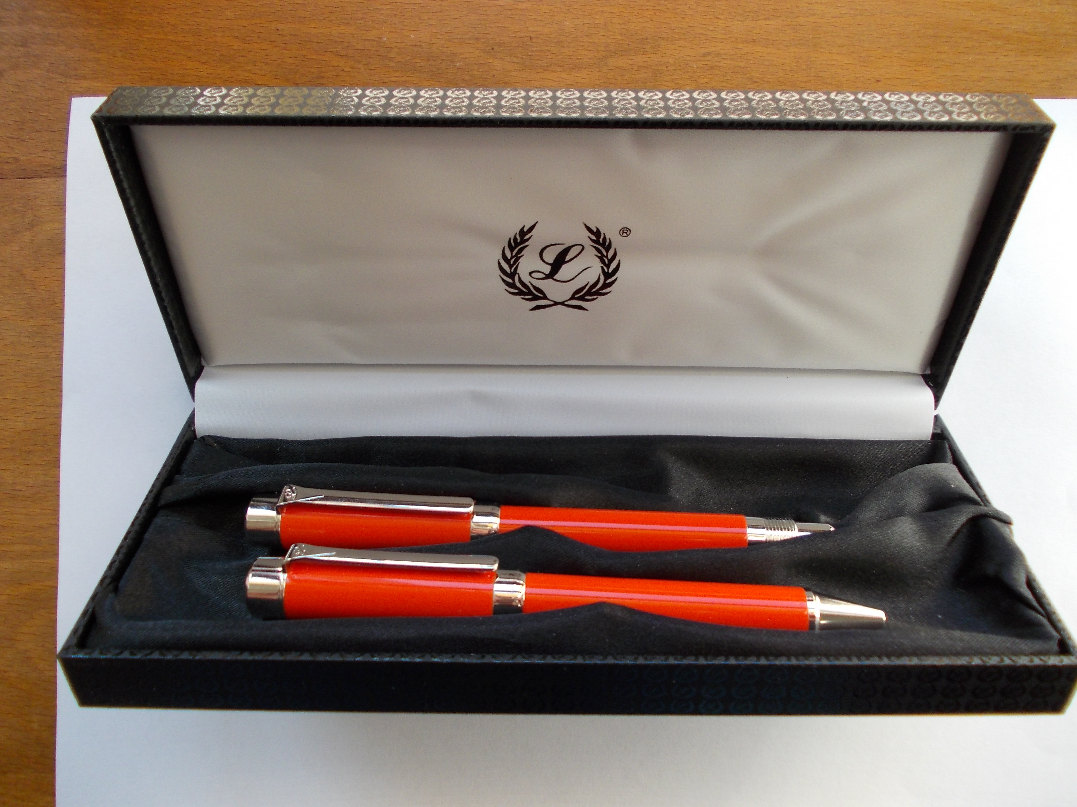 E' arrivata in una scatola cinese nera, decorata a piccole "L", con la biro e la stilografica adagiate su un panno lucido nero, presentazione molto elegante, ma vagamente funerea.