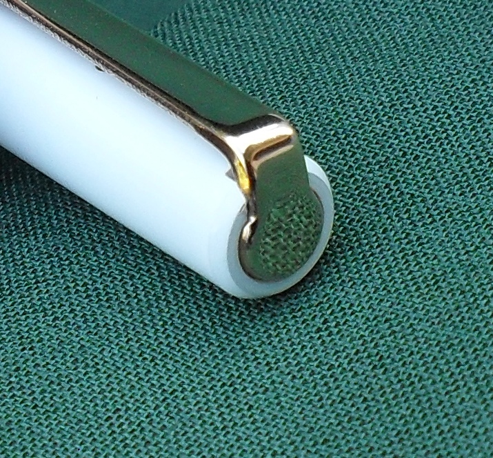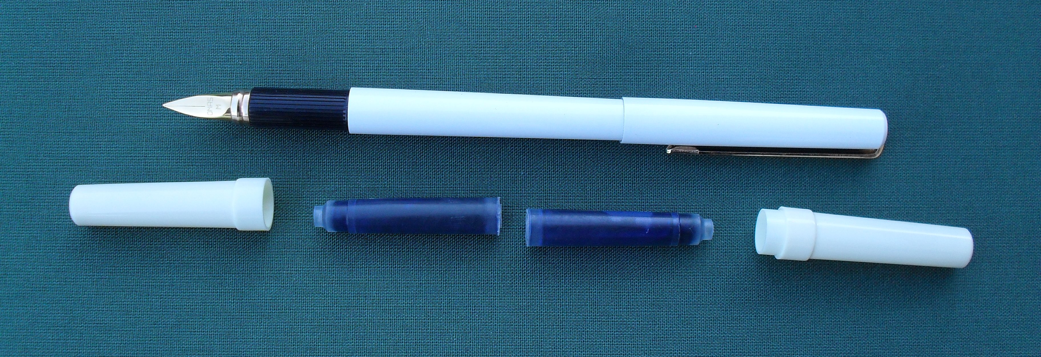 Il colore bianco è attraente ed il pennino in metallo dorato è molto bello ed elegante, originale nelle forme, certamente non piccolo e senza foro d’aereazione. L’impugnatura in gomma scanalata è confortevole e pratica, assicurando un’ottima presa. La prova di scrittura, proseguita per alcuni giorni in ufficio, ha rivelato un’ottima scorrevolezza, una notevole precisione del tratto ed un flusso non abbondante, ma neppure scarso, molto pratico per chi ha la necessità di voltare velocemente pagina, o chiudere l’agenda dopo avervi annotato un appuntamento od un promemoria.