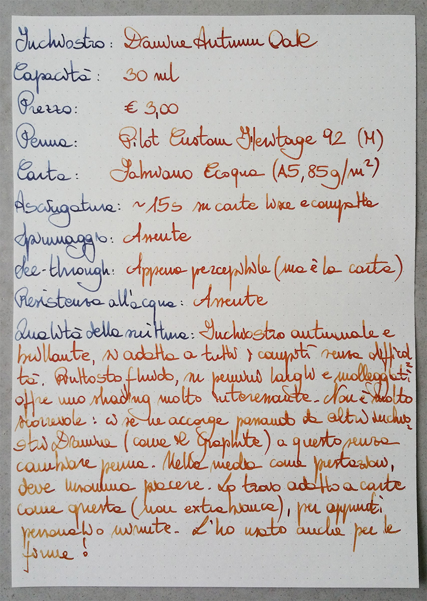 G P M P ha scritto: venerdì 16 agosto 2019, 7:05 Qualche mese fa ho infine terminato questo primo calamaio di Autumn Oak. Ci ho messo quattro anni per ragioni generali (troppi inchiostri, un colore oggettivamente "difficile", la mia passione per i blue), e specifiche. In particolare, infatti, questo inchiostro ha sempre avuto una scarsa scorrevolezza con le mie penne che ne esaltano le caratteristiche di sfumatura, le Pilot Custom 91 e 92.