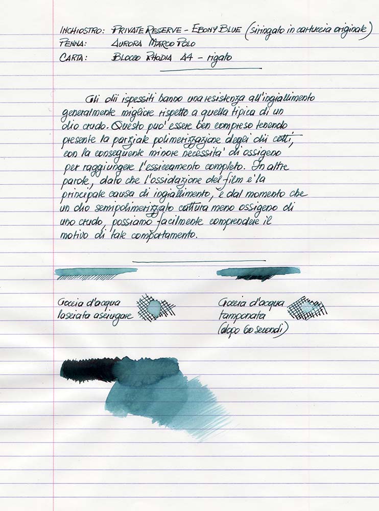 Il test di resistenza all’acqua fornisce una risposta molto precisa: è un inchiostro assolutamente non resistente, anche se su carte porose (come la Fabriano Copy 1 da fotocopie) resta vagamente leggibile qualcosa. Per farsi un’idea precisa, si può fare riferimento ai test di resistenza all’acqua allegati.