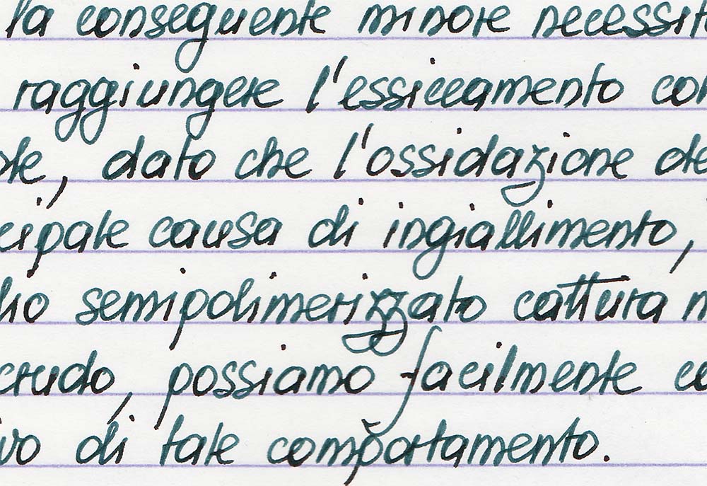 Come dicevo, non ci sono stati lavaggi tra una carica e l’altra: ho sempre siringato la cartuccia e scritto. La penna ha sempre ripreso prontamente la scrittura, mostrando qualche tentennamento solo durante l’ultimo stop di quasi un mese, durante il quale è stata dimenticata in orizzontale, sulla scrivania, al sole della tarda mattinata e del primo pomeriggio. L’inchiostro ha dimostrato di avere una buona fluidità ed una discreta capacità di lubrificazione; non induce problemi particolari, ed una penna “sana” lo digerirà tranquillamente. Come già successo per il Black-Magic-Blue, l’impressione è di un inchiostro dotato di una certa “pastosità” (ovviamente non reale), anche se ben fluido. Davvero una cosa molto particolare, che si comprende a fondo solo usandolo.