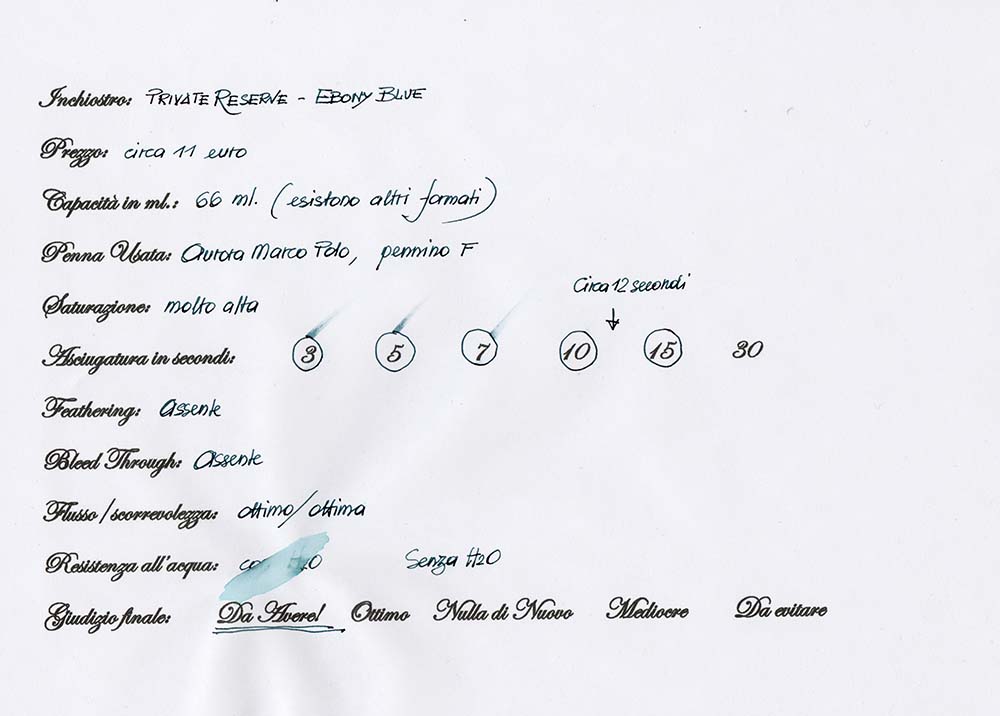 L’ebony blue è un inchiostro di eccellente qualità, non problematico, molto pigmentato, ad un prezzo che io ritengo più che adeguato. Pur avendo un colore diverso da quello che avevo immaginato, mi è subito piaciuto molto, e lo sto usando regolarmente per tutte le occasioni in cui ho sempre usato un blu-nero. Mi infastidisce la boccetta, perché non è sicura come le altre, ma tutto sommato si può considerare un peccato veniale. In virtù della sua acquerellabilità quasi totale, lo vedo perfetto anche per usi artistici, previo test sulla carta che si intende utilizzare. Non ho effettuato test specifici, che ad ogni modo farò in futuro, ma - considerando i coloranti in gioco (i blu ed i verdi moderni sono eccezionali)- ritengo possa essere sufficientemente resistente alla luce.