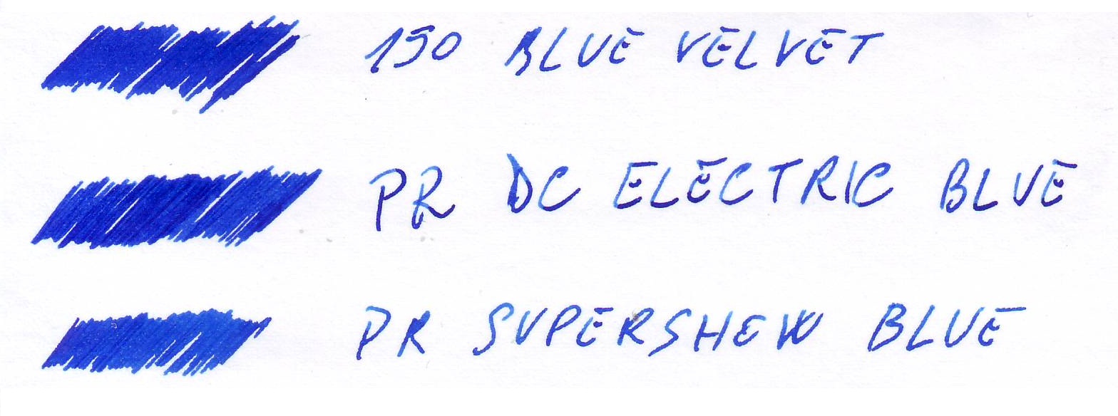 Dal punto di vista tecnico, il Private Reserve è superiore per saturazione e lubrificazione, mentre il Diamine è più fluido e asciuga più rapidamente. Le tonalità sono molto simili, con il Private Reserve che è un vero blu elettrico mentre il Diamine rende onore al suo nome con un colore che non è blu elettrico ma gli è piuttosto vicino. Con pennini fini sono molto simili mentre le differenze cromatiche si accentuano con pennini dal tratto largo.