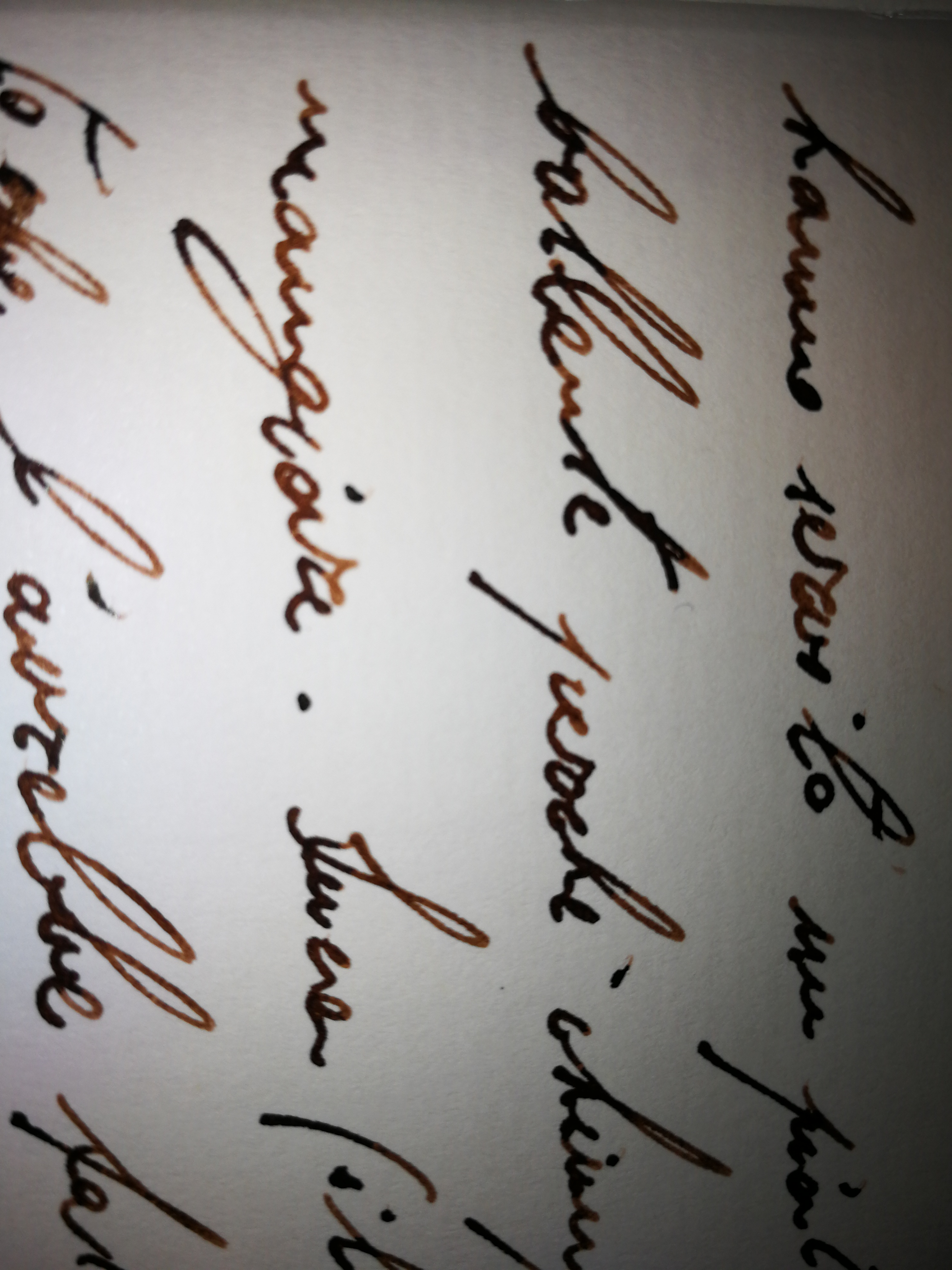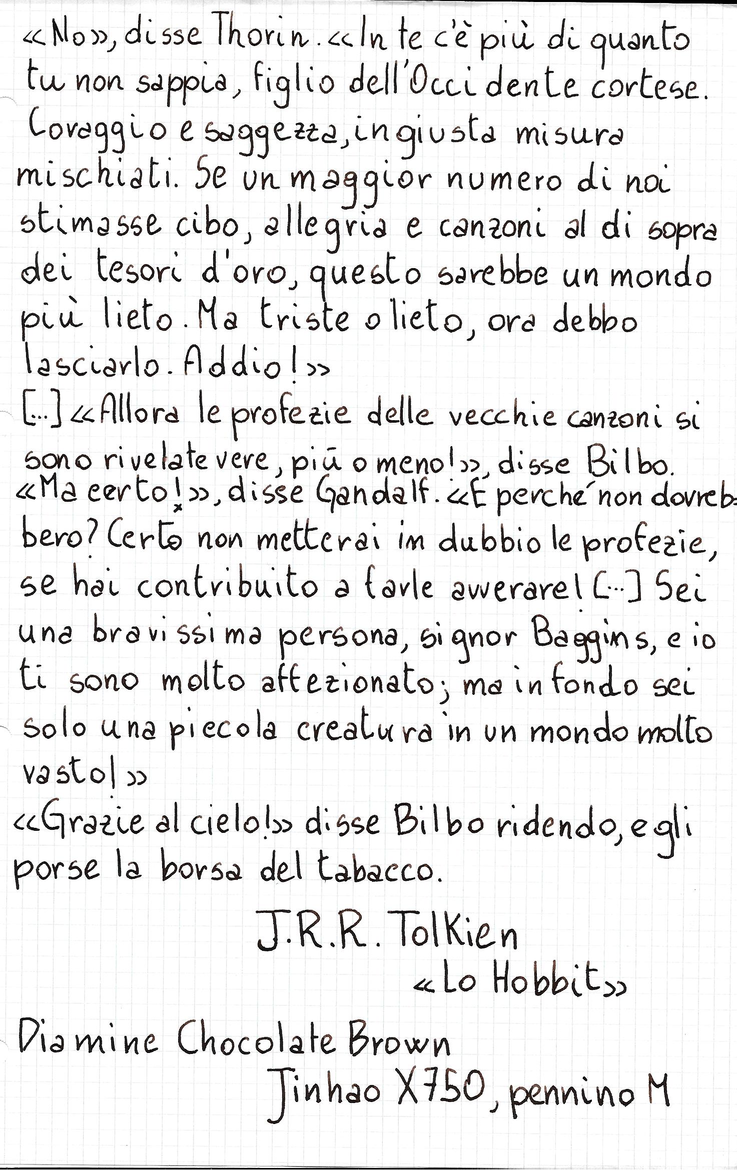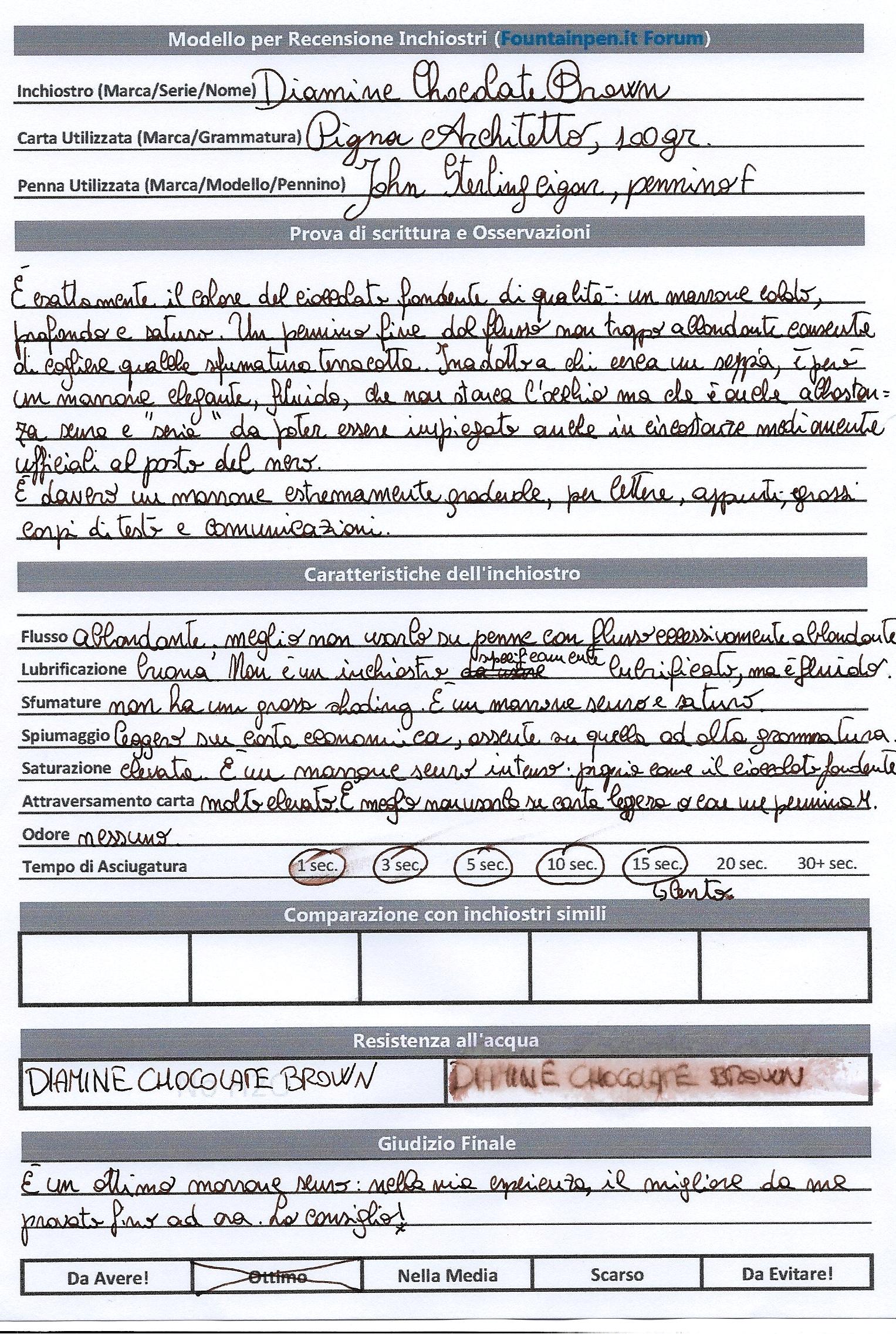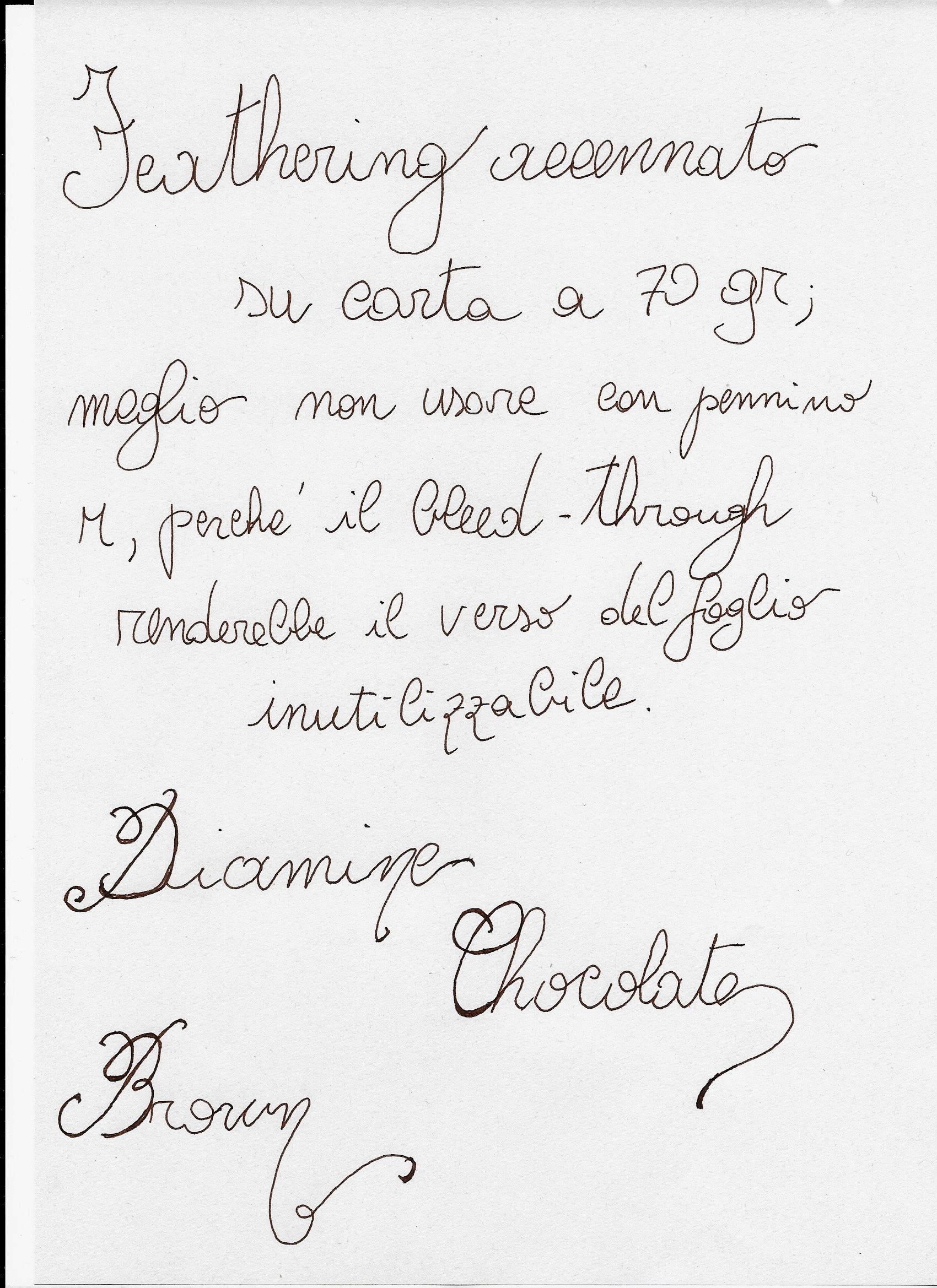 - Si tratta di un inchiostro inadatto a chi cerca un marrone chiaro o un seppia: si chiama Chocolate Brown, e non ho mai visto un nome più adatto. E' dello stesso punto di colore del fondente di qualità, intenso e caldo, in certi punti quasi nero.