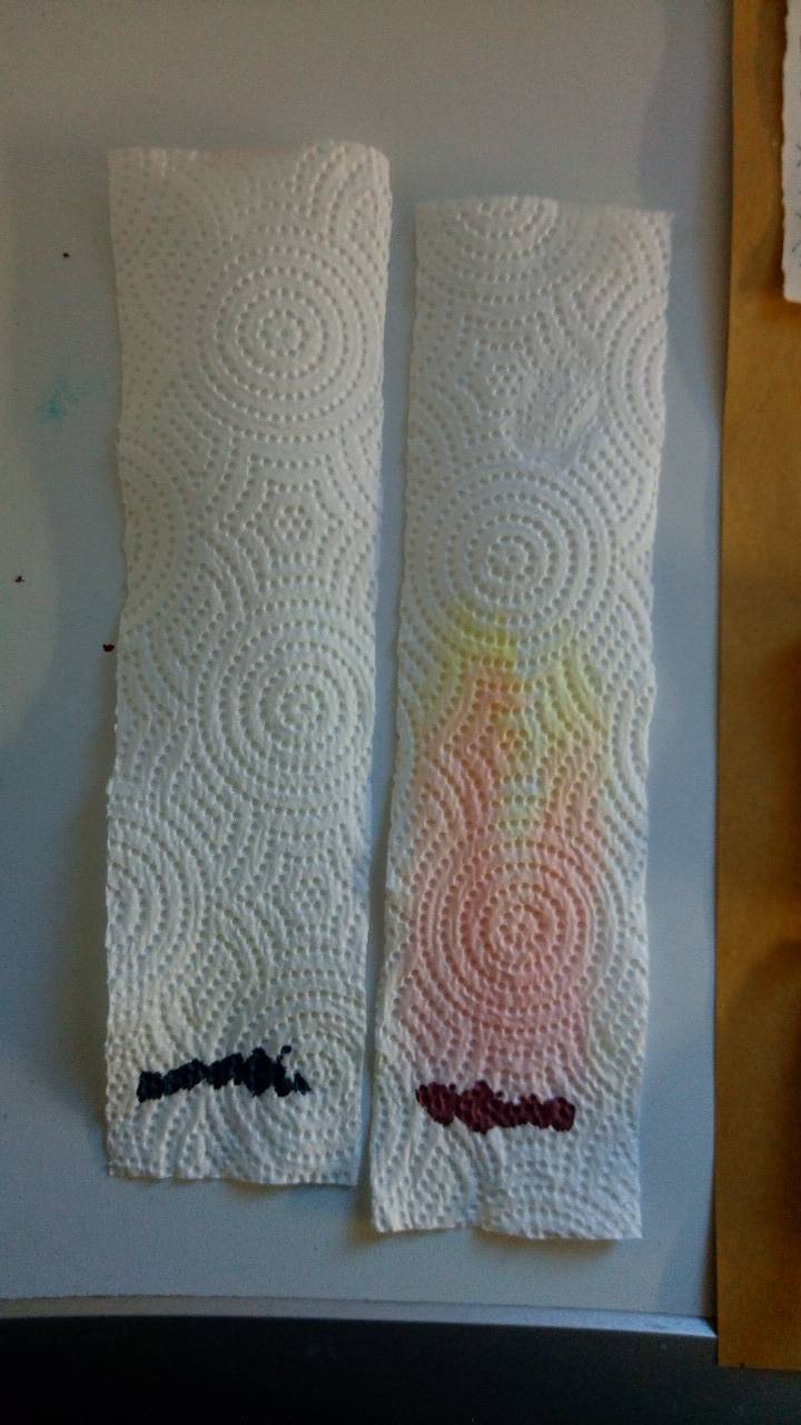a questo punto, visti i risultati, mi sono messa a fare il test della cromatografia (troppo divertente, sarei curiosa di farla davvero su silice se ne avessi tempo!!): 30 minuti ad adsorbire acqua e quindi tutta la notte appesa ad asciugare.