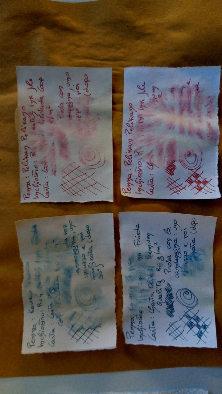 la carta è di due tipi diversi che avevo in casa, entrambe a 80 g/m2, che poi si avvicina di più a quella che usiamo in laboratorio. Le due penne hanno tratti diversi, ma sono le uniche due rimaste libere (le altre le ho date tutte a mio figlio per la scuola e prima o poi arriveranno le altre). La prima è riciclata (Viviverde Coop), la seconda è bianca della Olivetti (premium Quality);