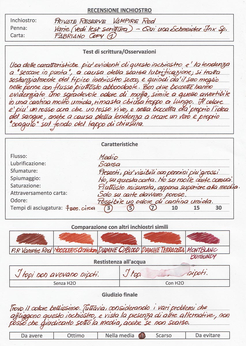 Il Vampire Red è un inchiostro di tono molto bello e fascinoso, castrato da problemi relativi all’uso principale (scrivere) che lo rendono troppo problematico per meritare un giudizio positivo, anche in considerazione del fatto che esistono inchiostri analoghi molto più performanti, come il Noodler’s Antietam che, pur di tono appena più chiaro, offre ben altre prestazioni. Mi infastidisce particolarmente l’odore di muffa che, tuttavia, da solo non sarebbe stato in grado di farmelo deprezzare in modo così evidente. Potrebbe trovare applicazioni, anche per il particolare colore che riconduce alle “sanguigne” di rinascimentale memoria, nell’uso artistico con pennino da intinsione e pennello, sfruttandone la totale acquerellabilità, previo test di fotostabilità.