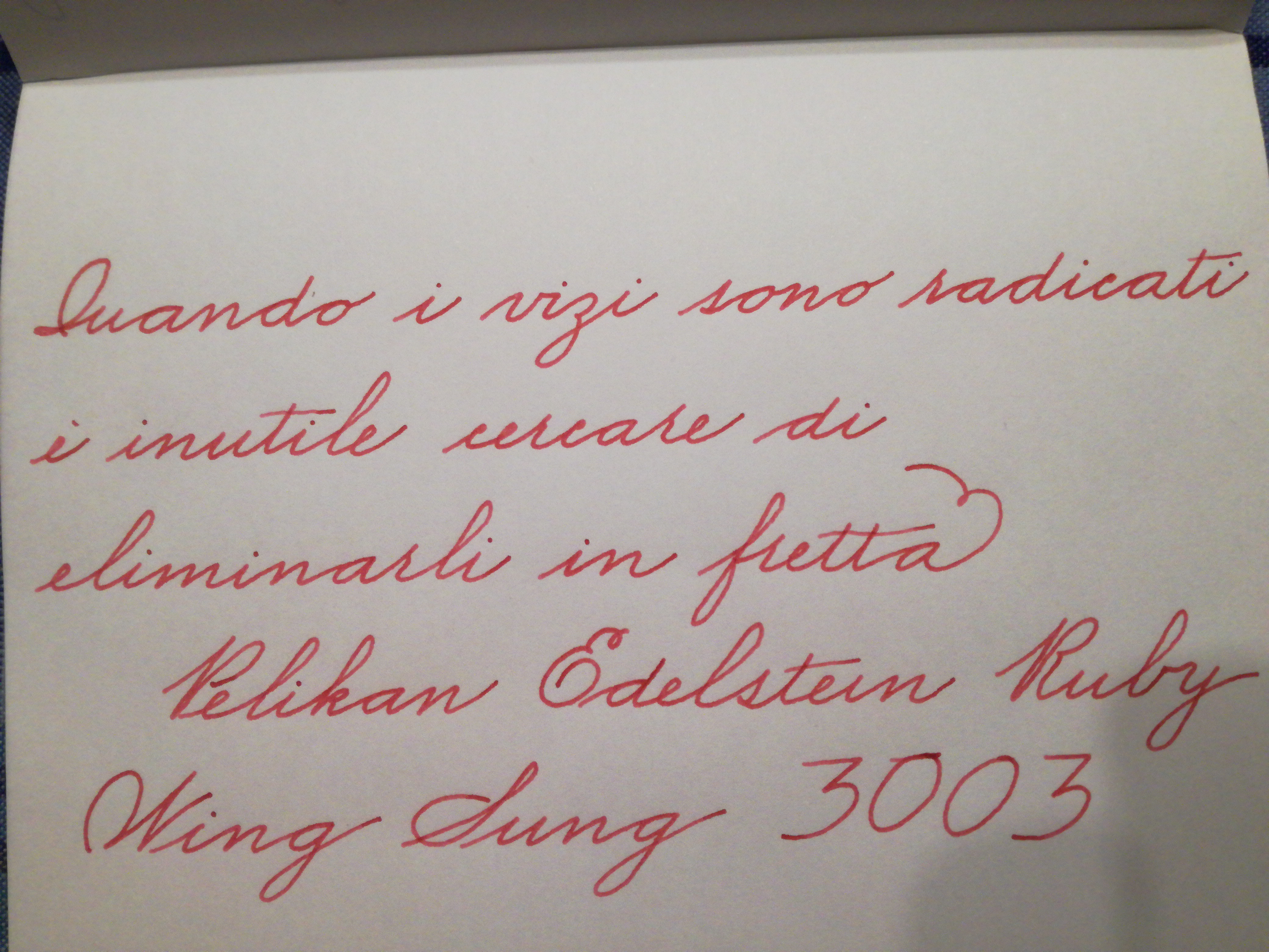 Io ancora non so dirlo, proverò a rifare la prova con una penna più generosa nel flusso, ho una TWSBI con pennino B che secondo me saprà darmi delle risposte e poi immagino quel bel rosso nella penna trasparente.