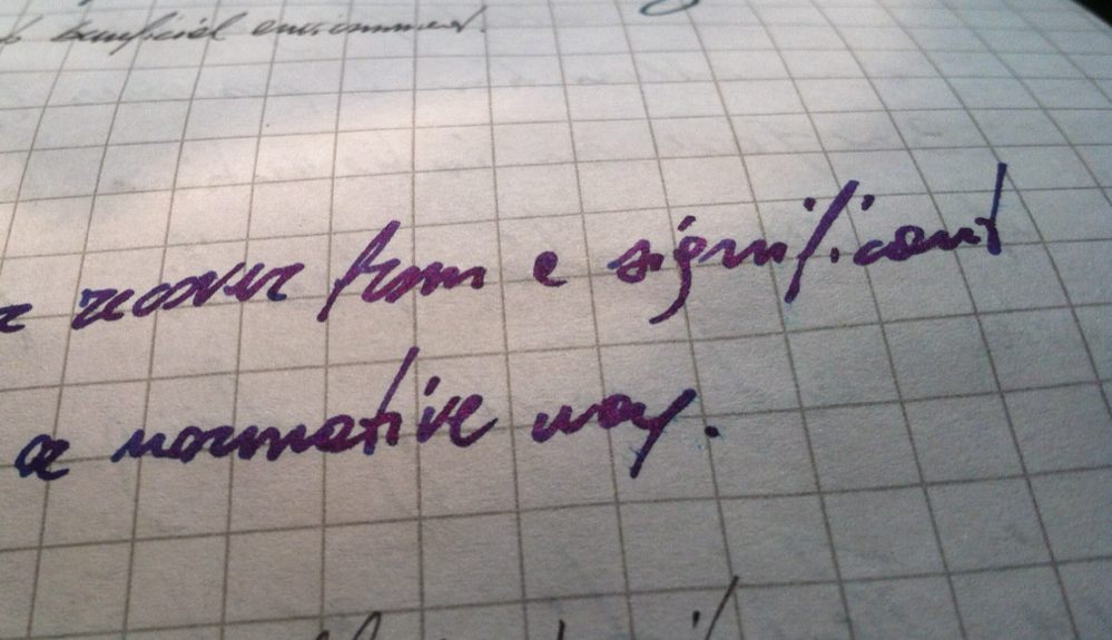 La saturazione è ottima, così come la luminosità; non manca un piacevole shading. La carta Rhodia non ha bisogno di presentazioni, e molti la ritengono la migliore tra quelle disponibili in Italia; non stupisce quindi che usando questo inchiostro su questa carta non si osservino spiumaggio, see-through e bleed-through. Conoscendo la penna e la carta (molto liscia), devo osservare che la scorrevolezza offerta da quest'inchiostro non è elevatissima; anche questo, come tutti gli altri inchiostri Diamine che ho provato, non lubrifica il punto di contatto tra pennino e carta. Il flusso, in compenso, è molto controllato. Il tempo di asciugatura è accettabile (poco superiore ai 12 secondi, su questa carta così liscia), la resistenza all'acqua è appena accettabile.