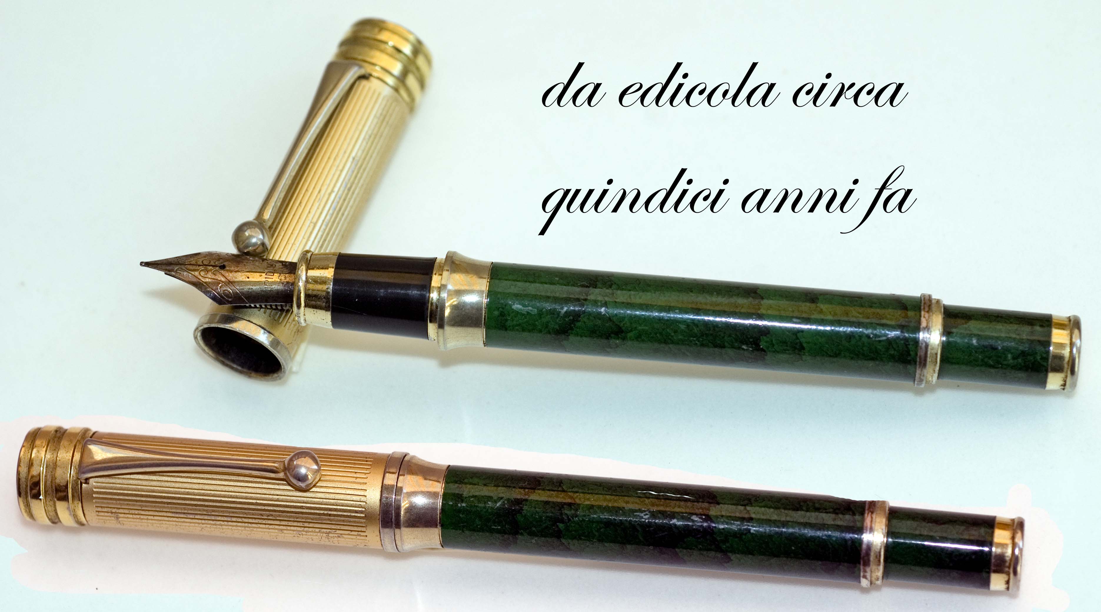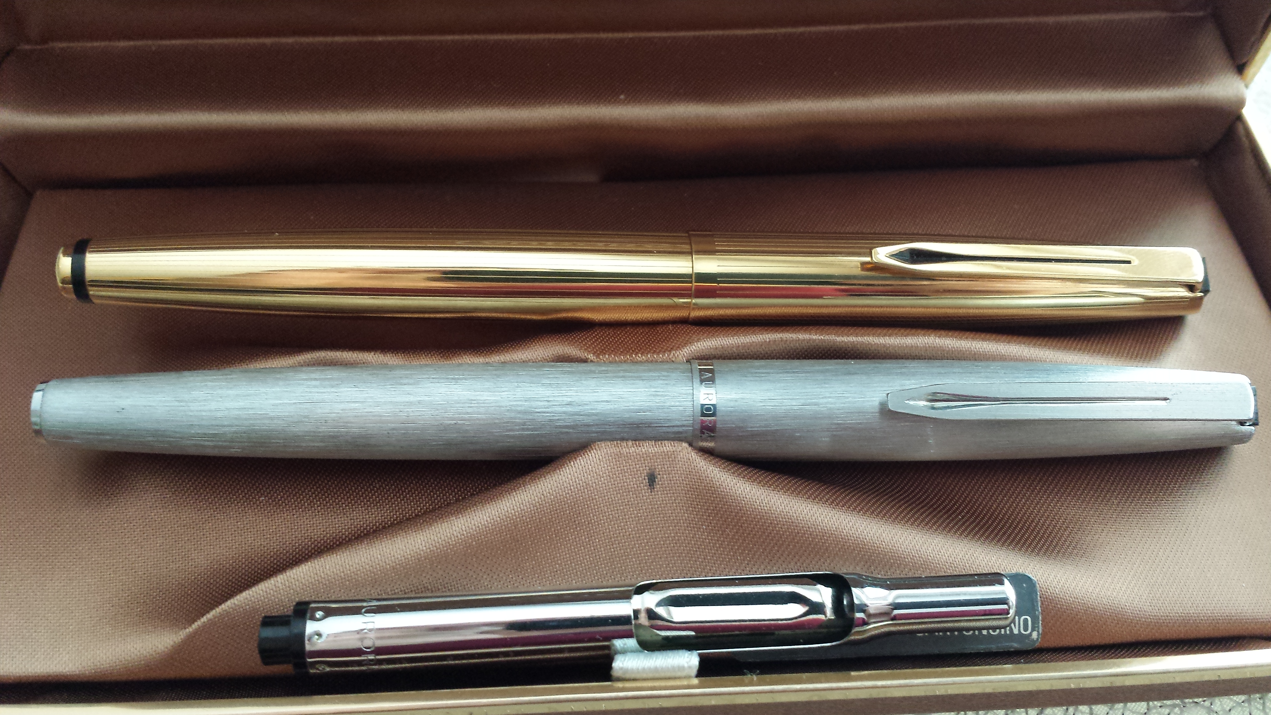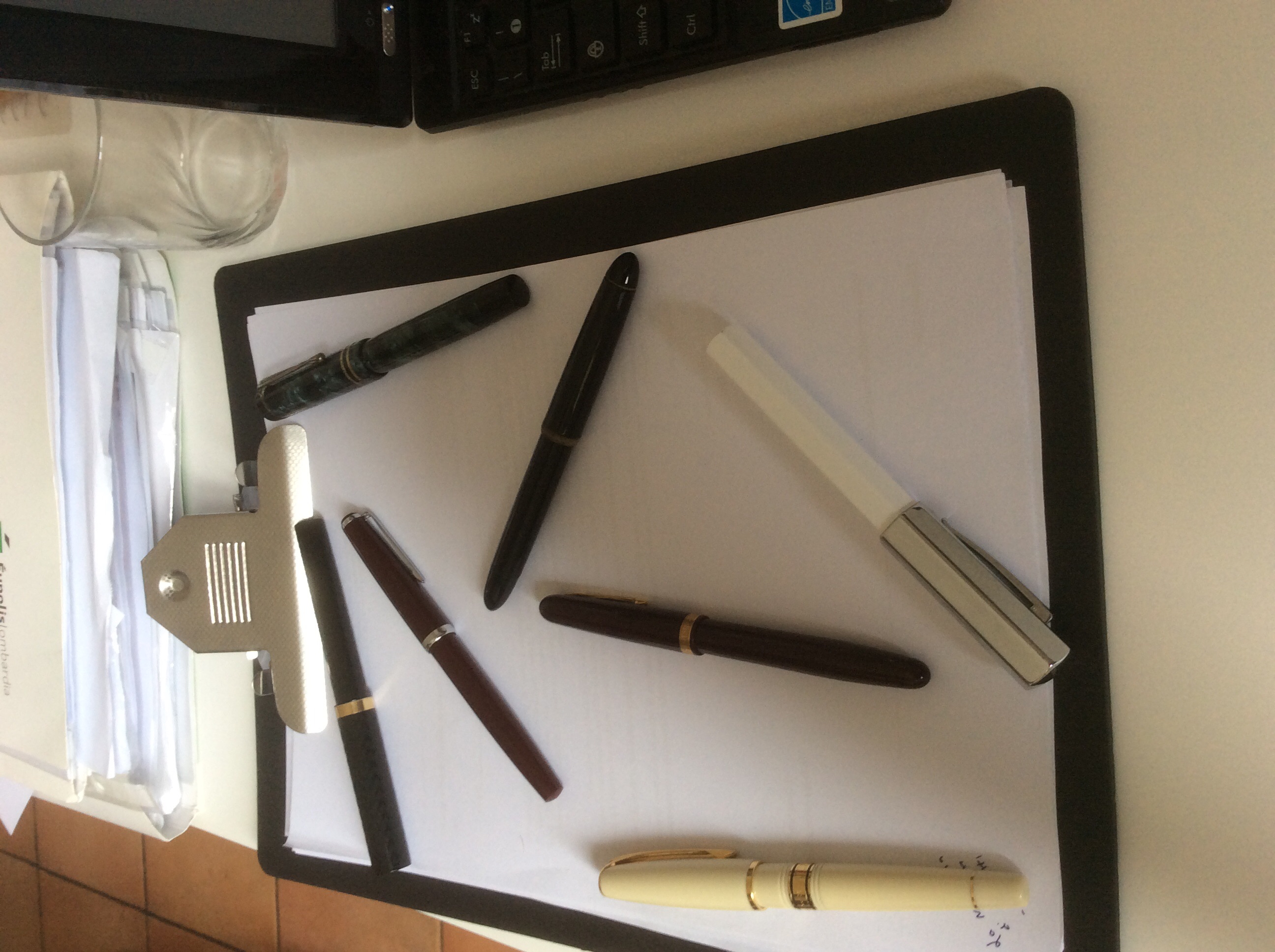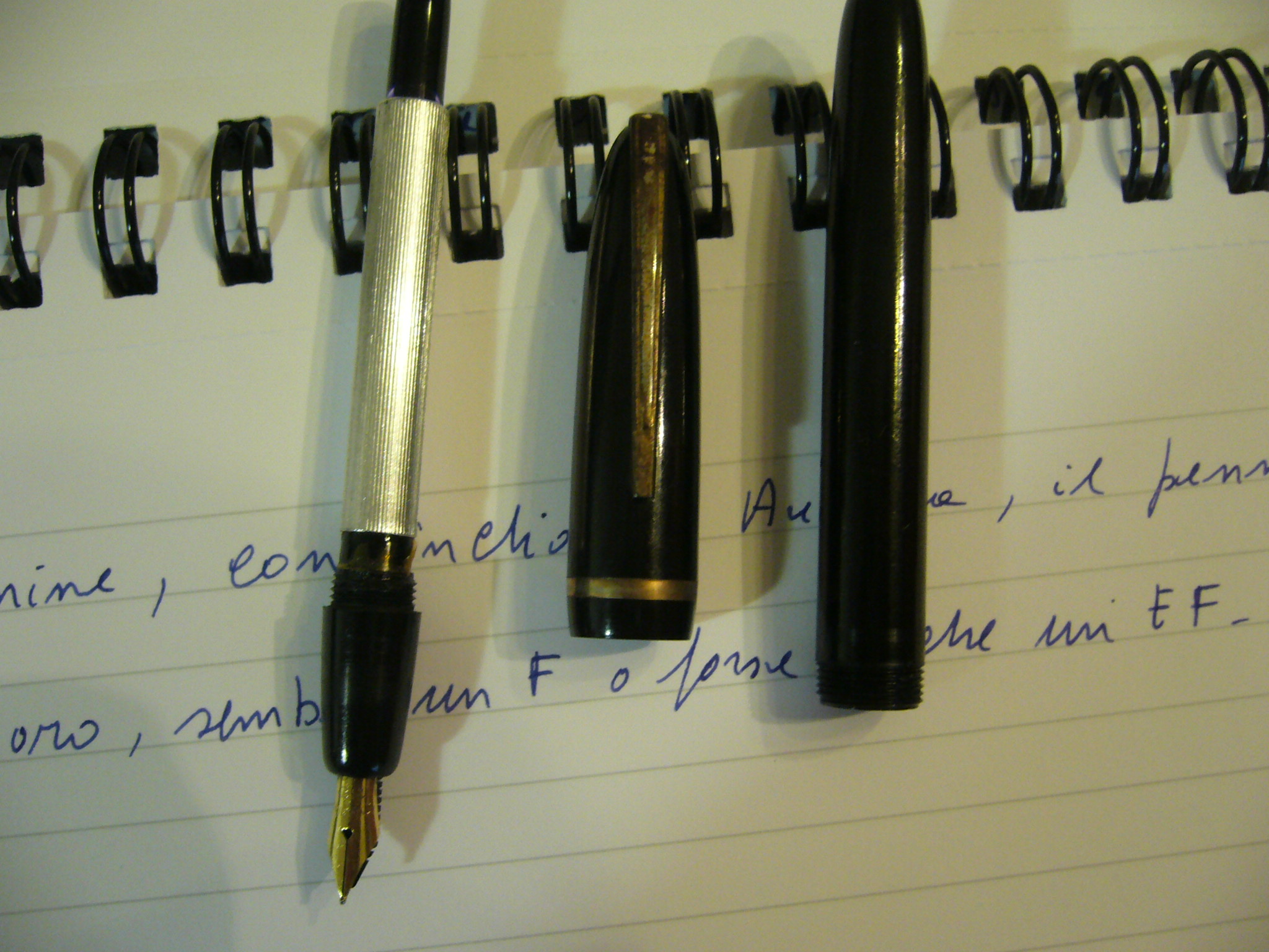 Sitratta di un Aurora 98 (ne ho due) con caricamento converter ; ancora Aurora 98 caricamento a pistone con pulsante che sparisce dopo la ricarica;una Zenith Extra; una Aurora Ipsilon cartucce/converter; una Lalex, marchio a me sconosciuto che ho preso sia per l'estetica che per il caricamento a pistone e anche qui il pulsante sparisce dopo la ricarica. poi c'è da ridere (lo so) perchè si tratta di penne comprate su una bancarella e, stando al venditore, comparse in edicola una quindicina di anni fa e dovrebbero essere la riproduzione (alla buona e con molta immaginazione) di penne blasonate. Non ho capito a quali originali s'ispirano. le ho comprate perché il blocco costava dieci euro e poi cosa strana, dopo il lavaggio, funzionano alla, perfezione, a cartucce ovviamente. Per finire all'insegna del trash che più trash non si può due anonime made in Twain, funzionanti senza esitazioni. per la qualità delle foto chiedo scusa ma al momento il set per la macrofotografia l'ho prestato e ho cercato di rimediare alla meglio.