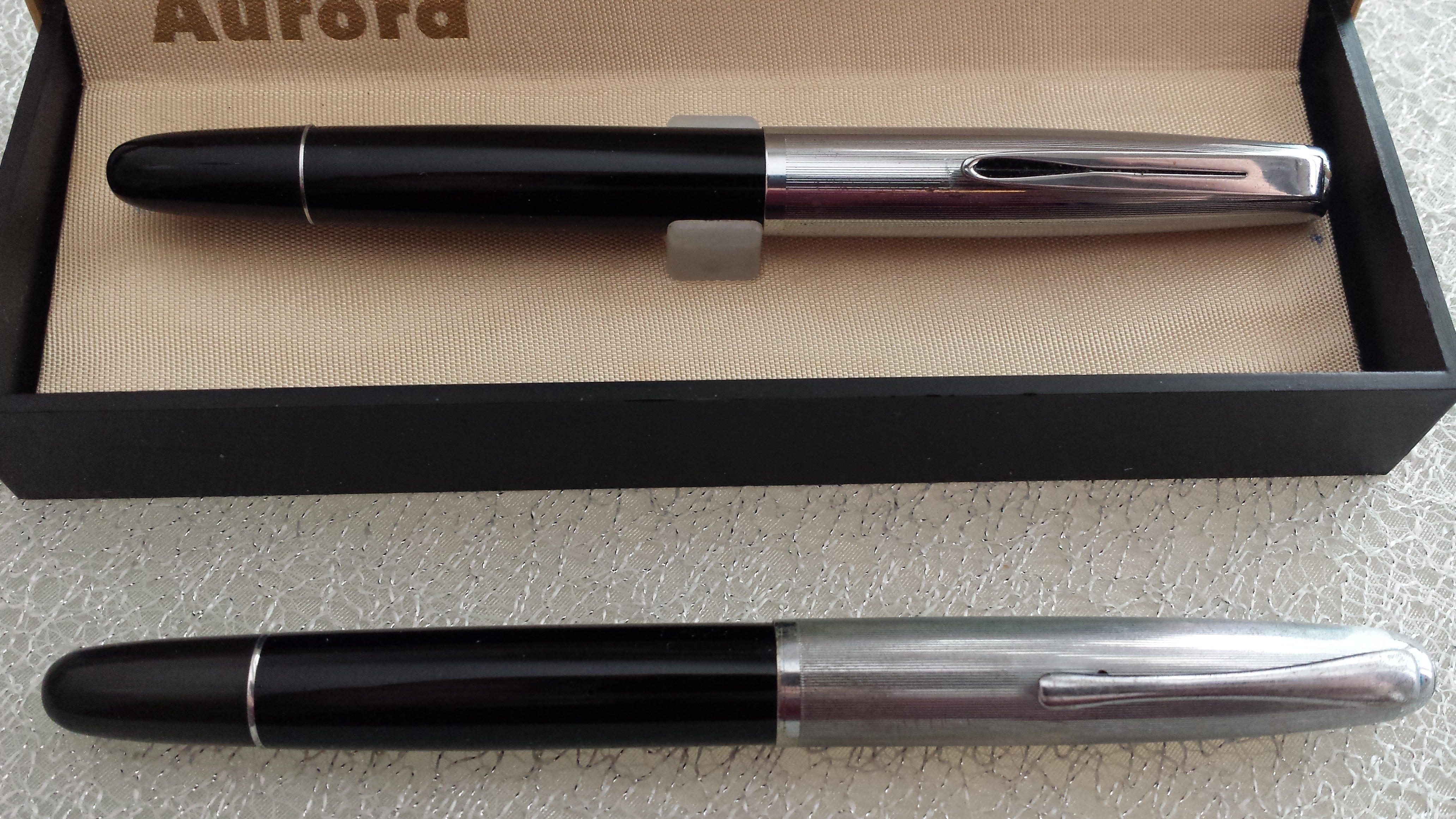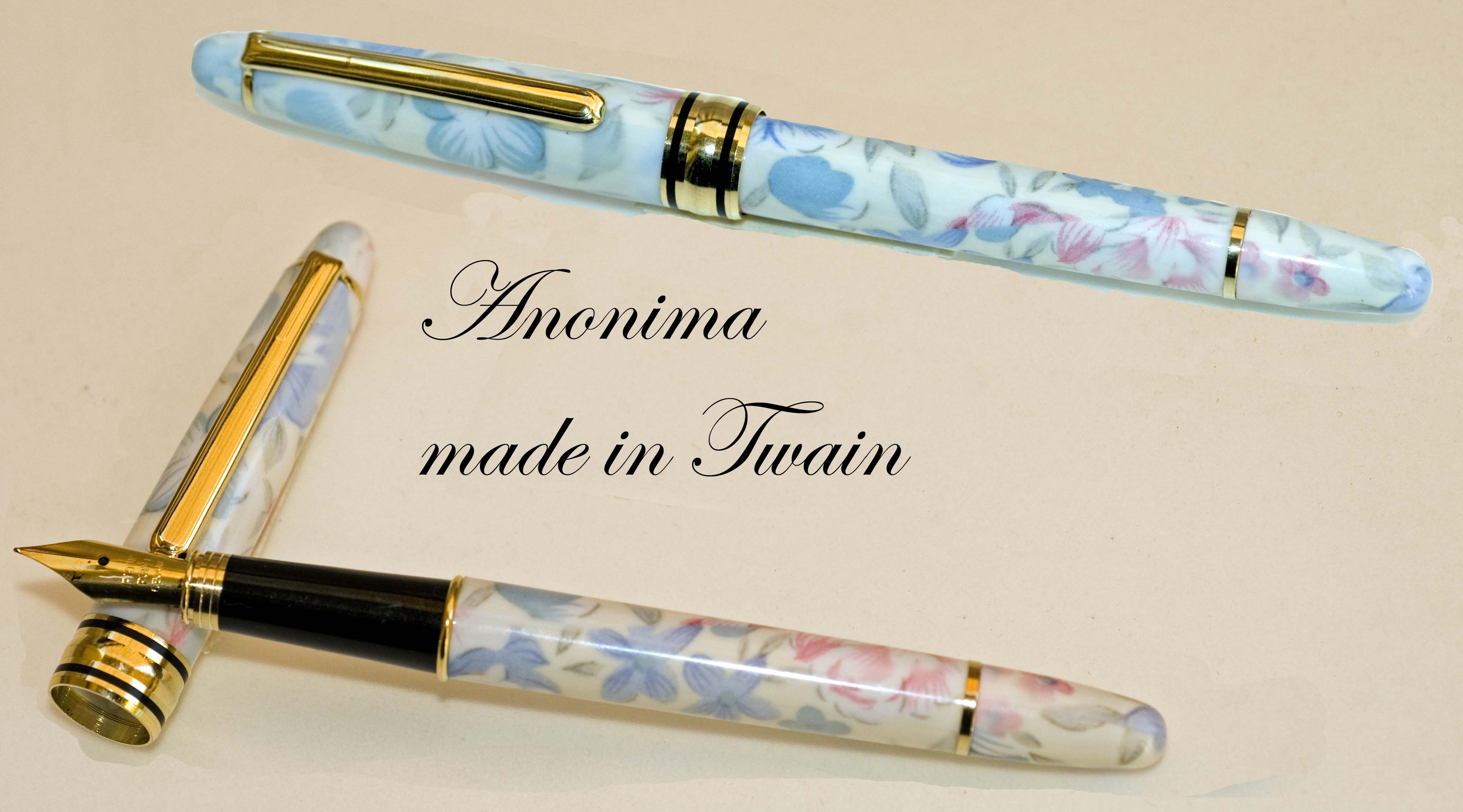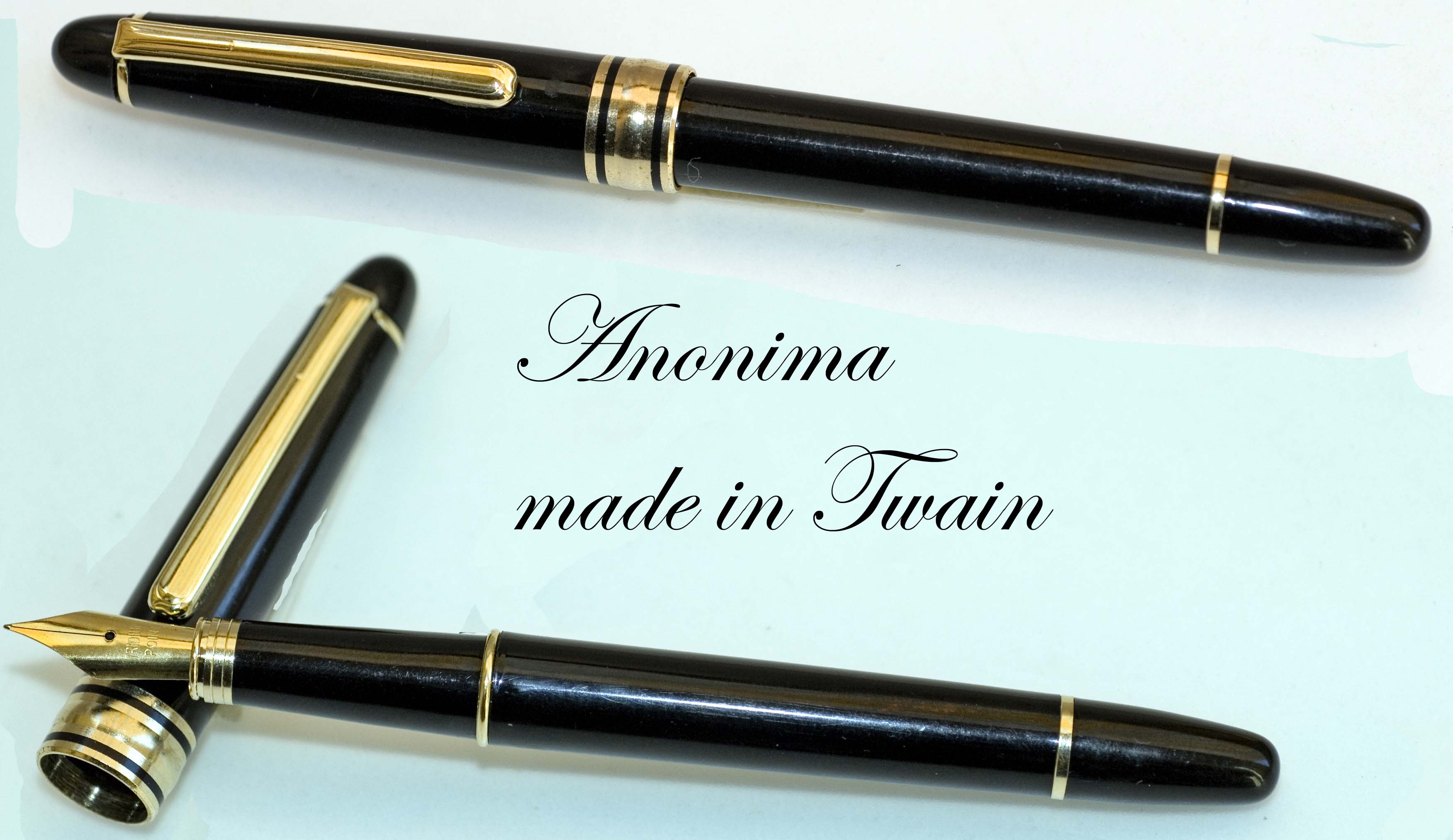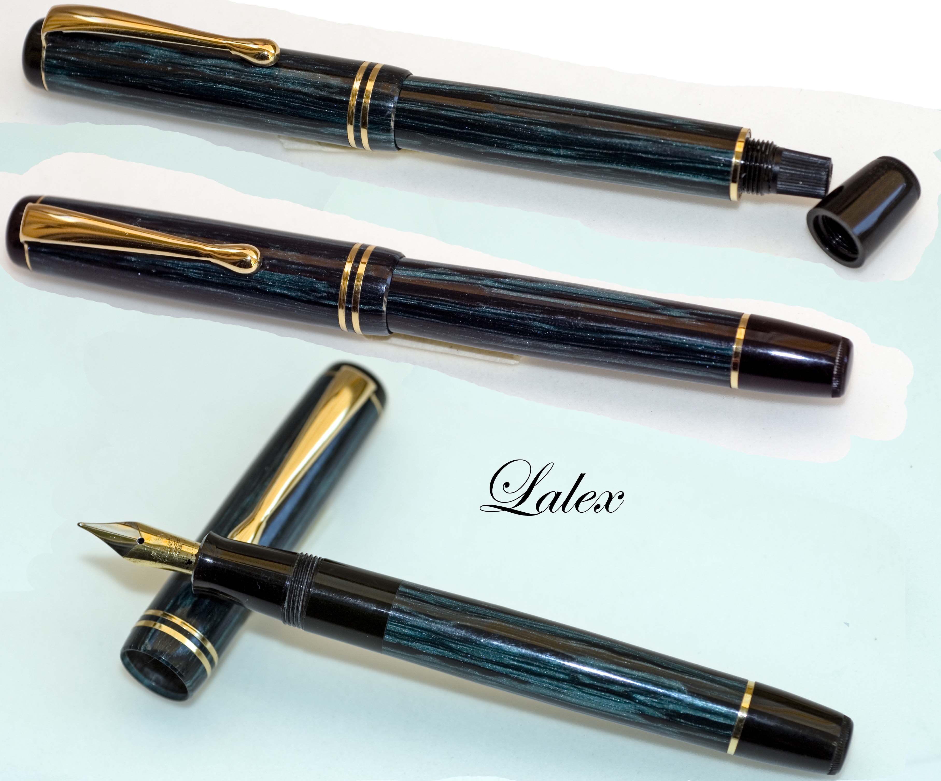 Sitratta di un Aurora 98 (ne ho due) con caricamento converter ; ancora Aurora 98 caricamento a pistone con pulsante che sparisce dopo la ricarica;una Zenith Extra; una Aurora Ipsilon cartucce/converter; una Lalex, marchio a me sconosciuto che ho preso sia per l'estetica che per il caricamento a pistone e anche qui il pulsante sparisce dopo la ricarica. poi c'è da ridere (lo so) perchè si tratta di penne comprate su una bancarella e, stando al venditore, comparse in edicola una quindicina di anni fa e dovrebbero essere la riproduzione (alla buona e con molta immaginazione) di penne blasonate. Non ho capito a quali originali s'ispirano. le ho comprate perché il blocco costava dieci euro e poi cosa strana, dopo il lavaggio, funzionano alla, perfezione, a cartucce ovviamente. Per finire all'insegna del trash che più trash non si può due anonime made in Twain, funzionanti senza esitazioni. per la qualità delle foto chiedo scusa ma al momento il set per la macrofotografia l'ho prestato e ho cercato di rimediare alla meglio.