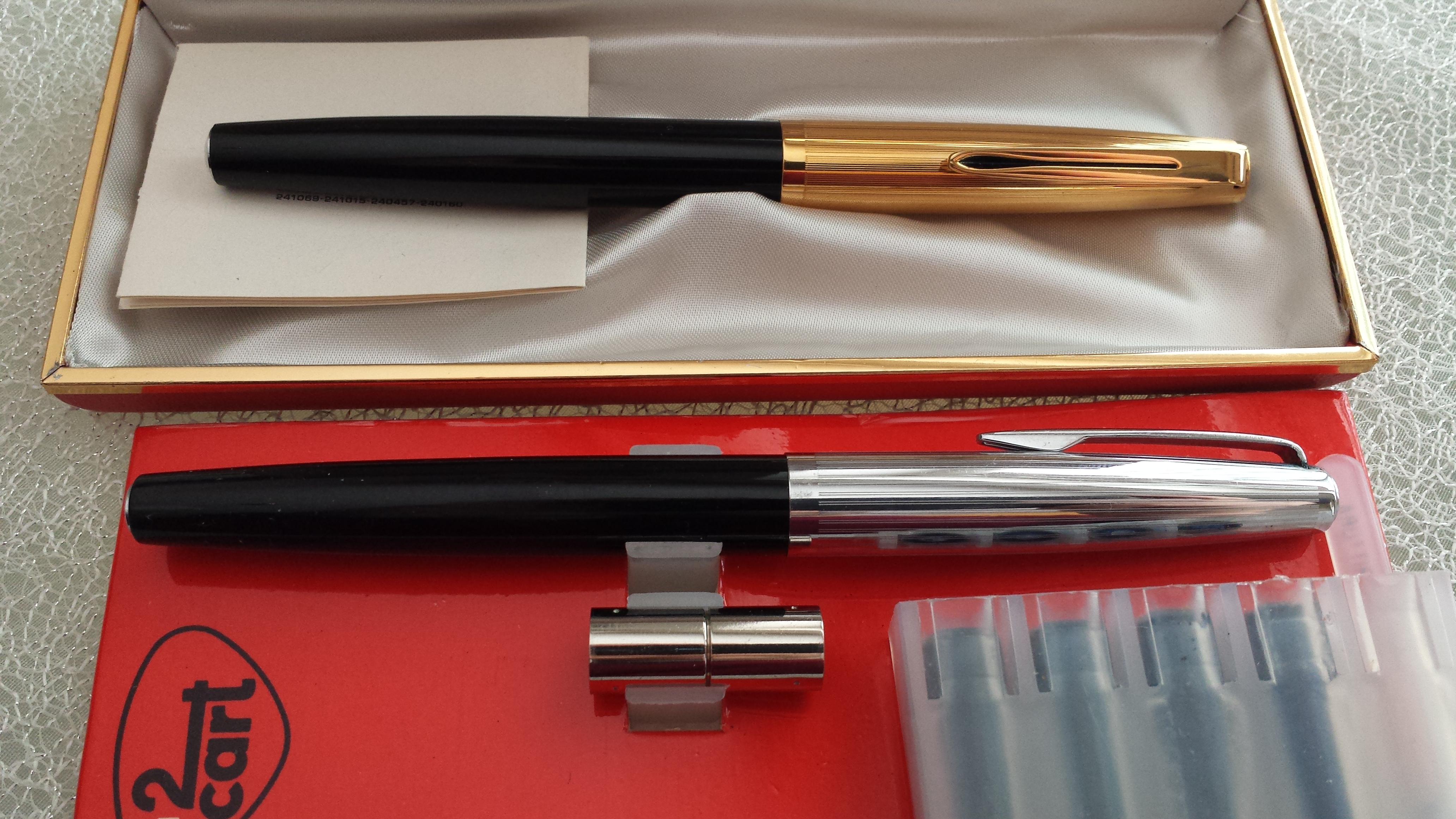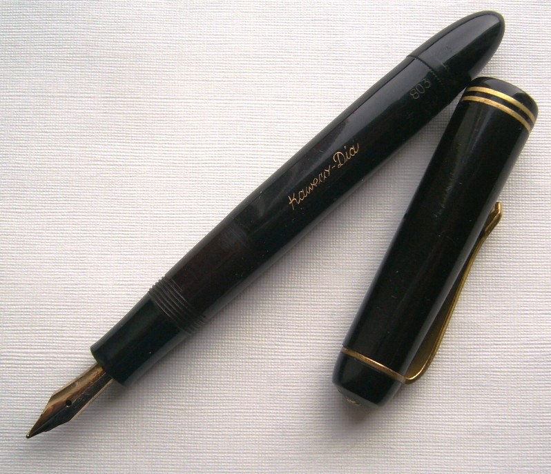 Col tempo ho trovato una Eversharp che praticamente è una copia della 51 ma col pennino in acciaio, caricamento a pulsante di fondo e più sottile; io ho preso il cappuccio che reca la scritta "EVERSHARP 18KR." (se qualcuno avesse idea di cosa significa precisamente il "18KR.") e vi ho sostituito il controcappuccio interno per fargli ospitare la mia 51. Poi ho rubato da Massimo un pennino M molto più consono alla mia grafia ed ora devo dire che mi è molto più simpatica. :D