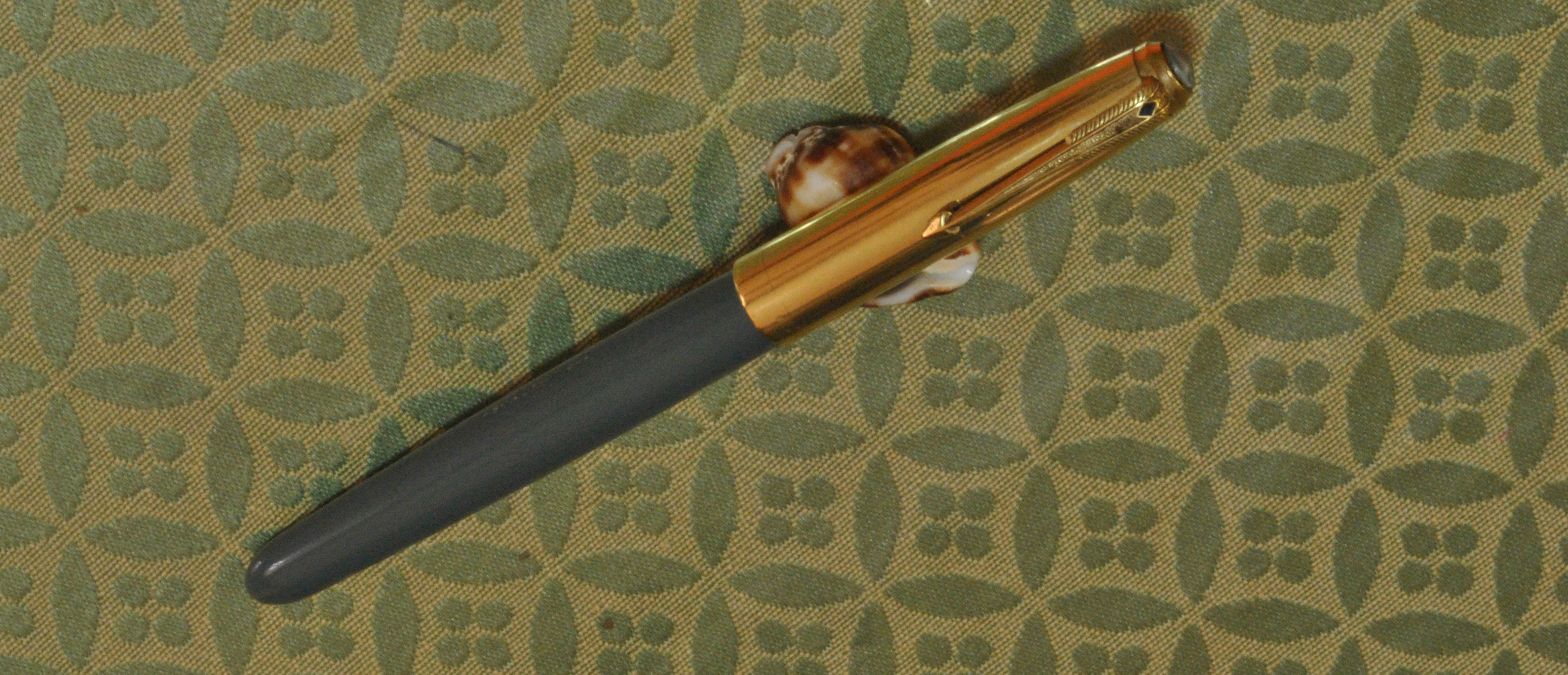 Si tratta di una Parker "51" aereometrica in colorazione Dove Gray. Quando l'ho acquistata aveva il puntale spezzato, il cappuccio era quello di una Parker "21" che tra l'altro non aveva nemmeno il gioiello e aveva un pennino B che non m'era per niente simpatico.