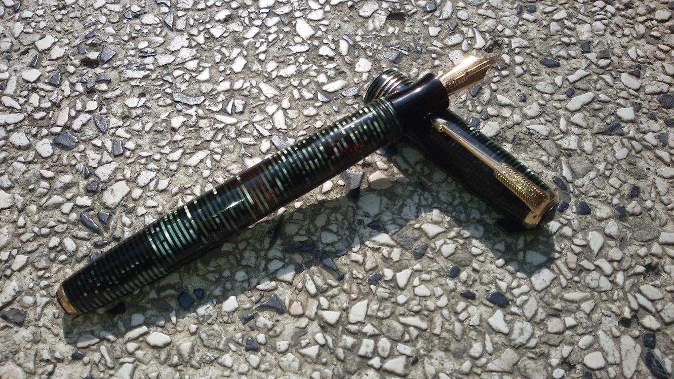 Complimenti per l'acquisto. Mi piacciono proprio le Vacumatic Green Pearl; all'atto di comprare il primo vintage ero indeciso tra la vacumatic e la 88, optando poi per quest'ultima. La cosa che attirò di più la mia attenzione é il fatto che quella celluloide e quel colore mi ricordano un grattacielo, anche se quando furono prodotte di grattacieli ce n'erano veramente pochi nel mondo.
